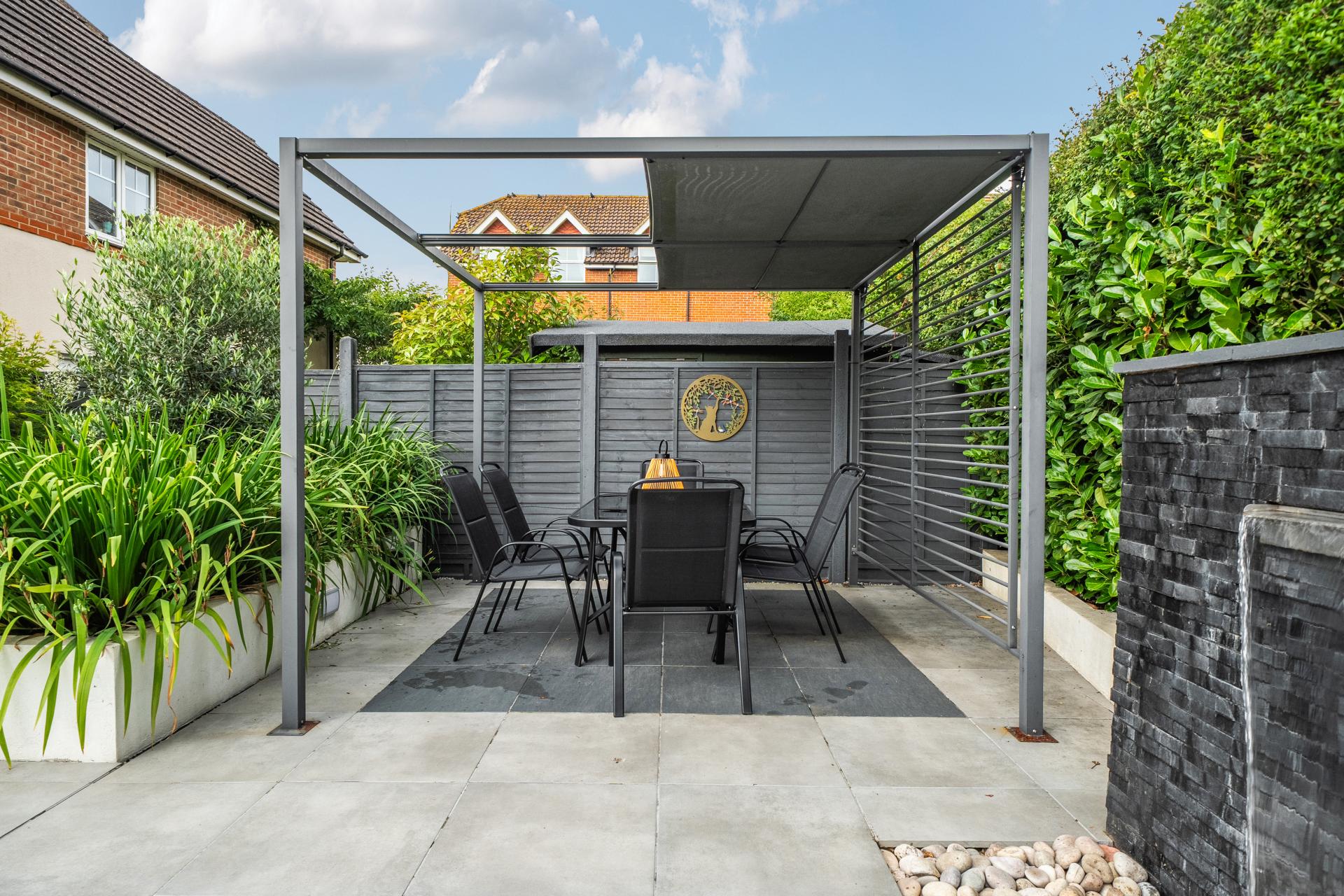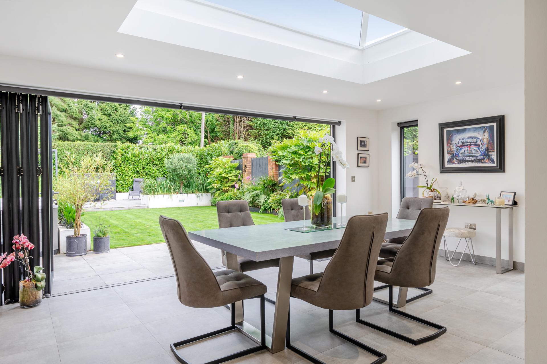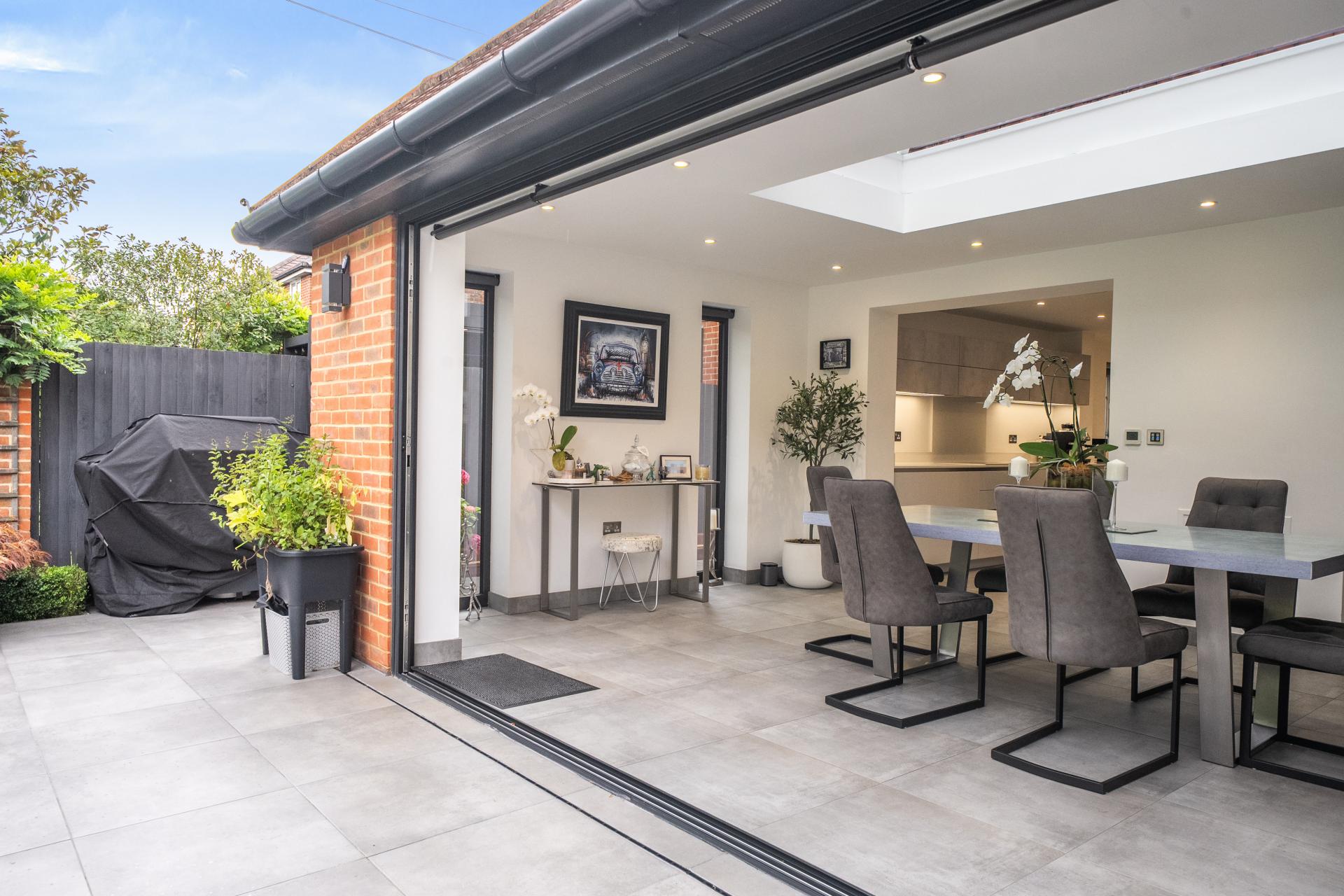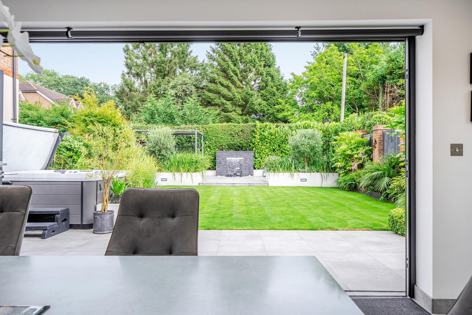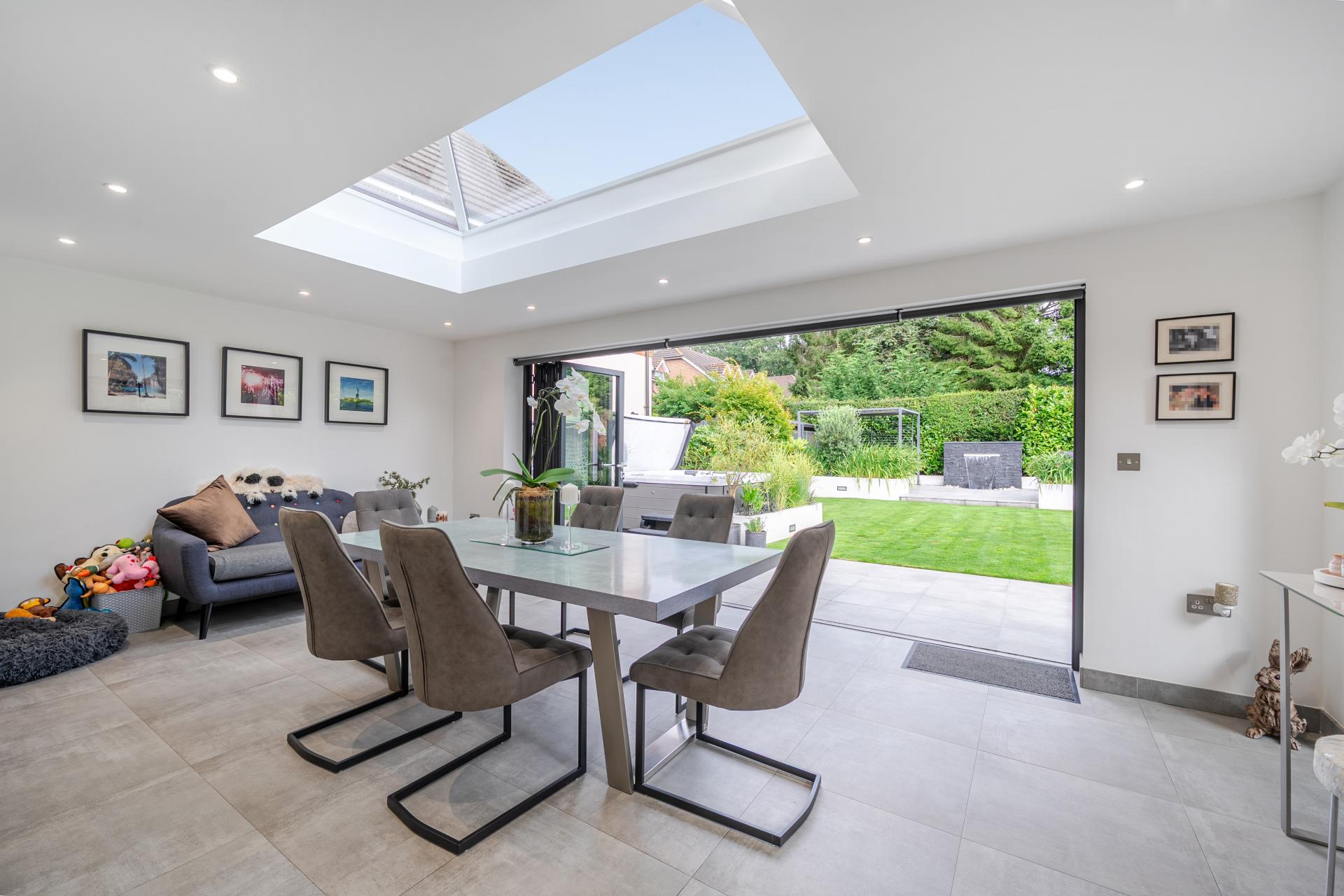 The rear garden is contemporary in style, south east facing, with two terraces, perfect for summer entertaining, space for a hot tub, stylish water feature, garden lighting and underground pop up sprinkler system. To the front of the property there is a single garage, parking for 3 cars and electric vehicle charging point.