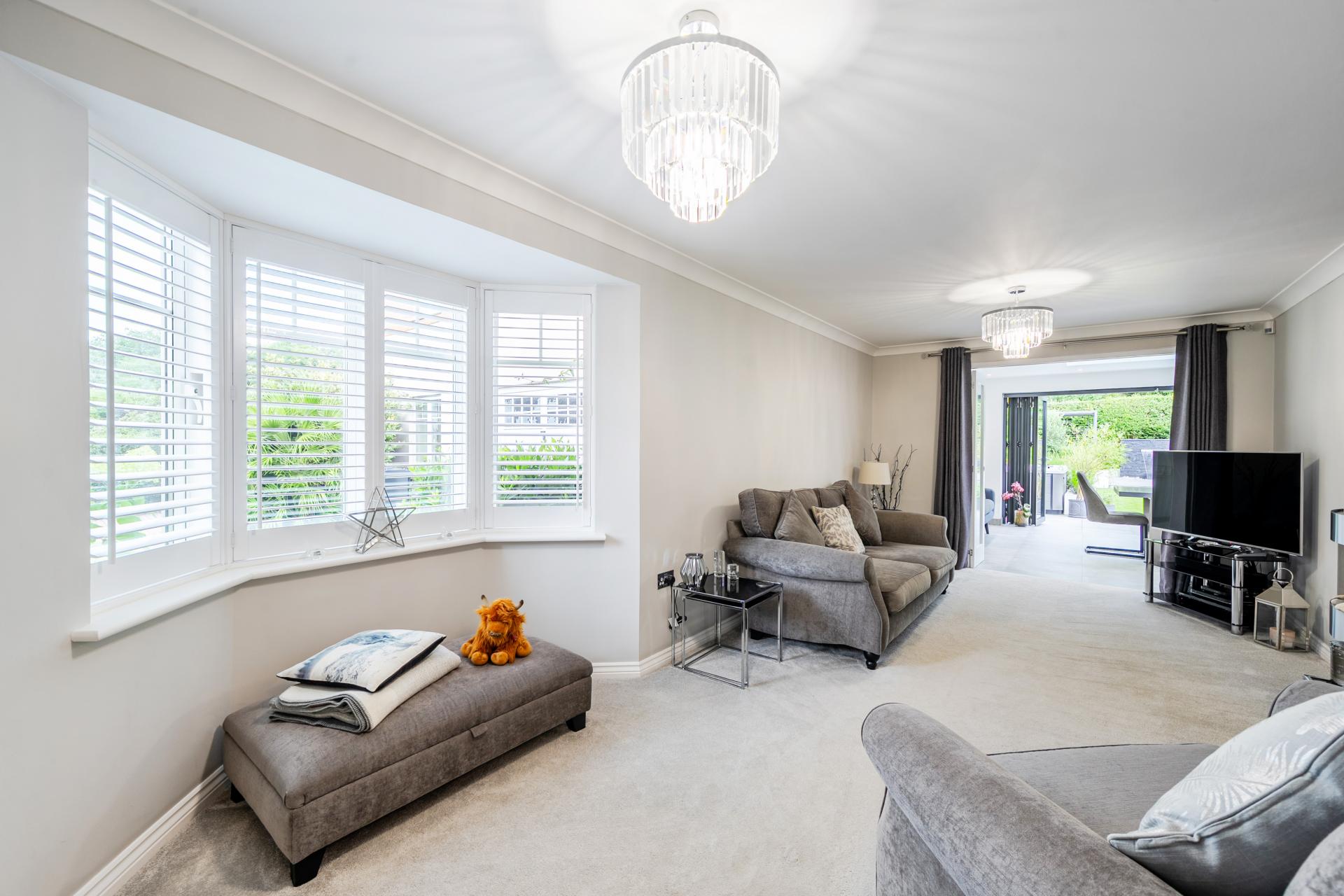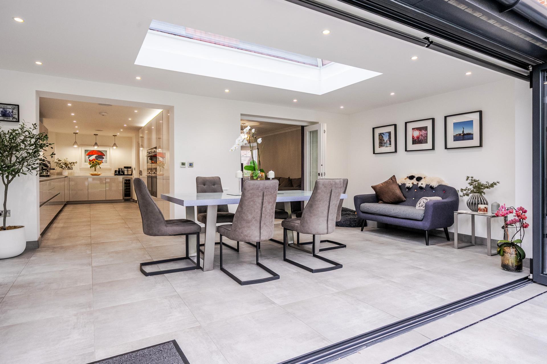 The stunning kitchen/dining room is contemporary and sleek in style. This bespoke Schmidt kitchen is fitted with Quartz worktops and Siemens appliances which include an induction hob, two double ovens, steam oven, microwave, Integral fridge and freezer and a wine fridge. This fabulous open plan kitchen/dining room is ideal for entertaining and has bi-fold doors leading onto the terrace and garden. The well proportioned sitting room with bay window, leads into the open plan kitchen/dining room, which can also be accessed via the hallway.
