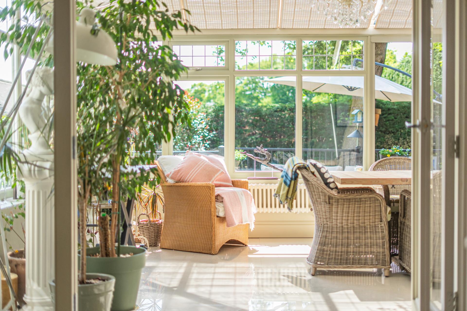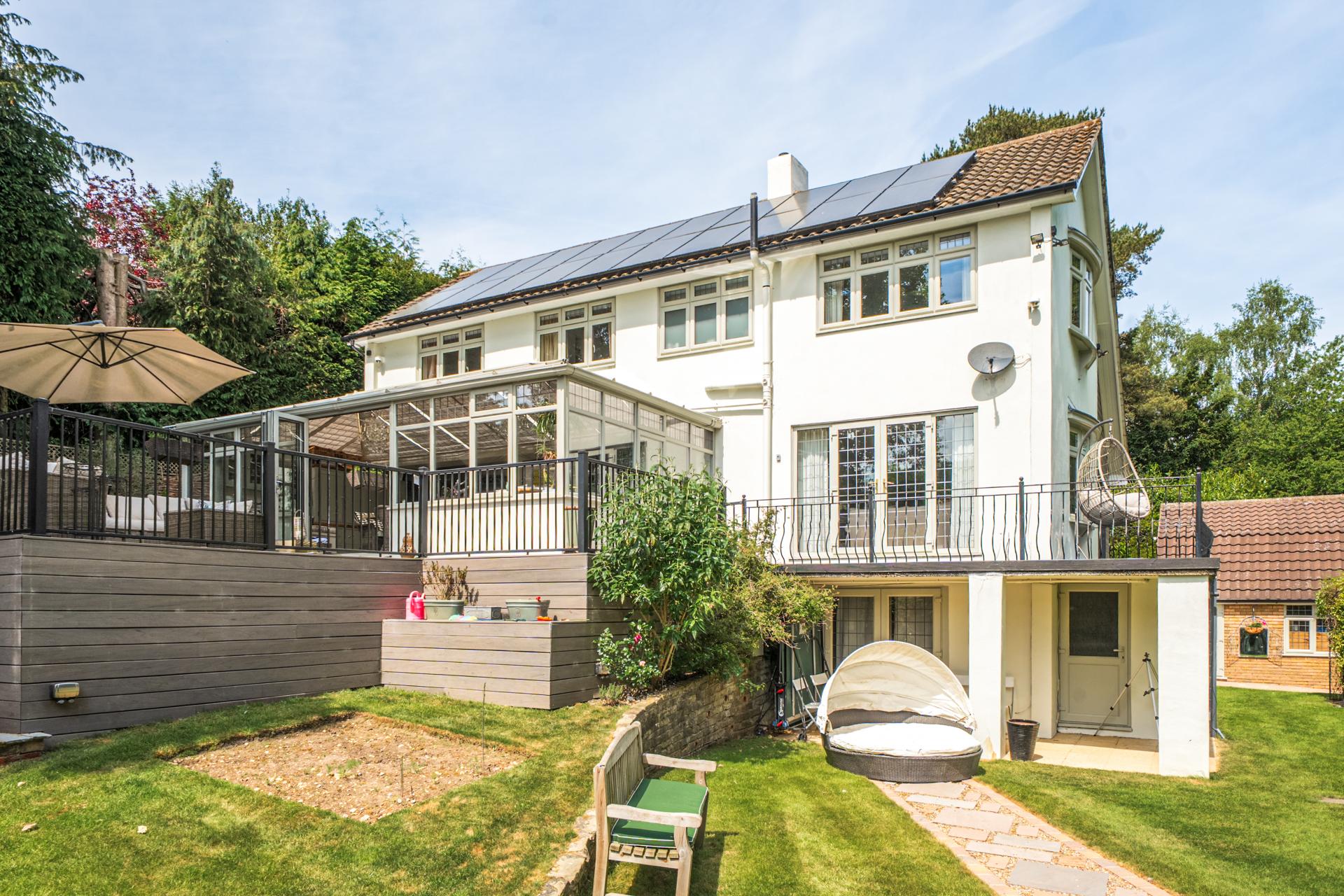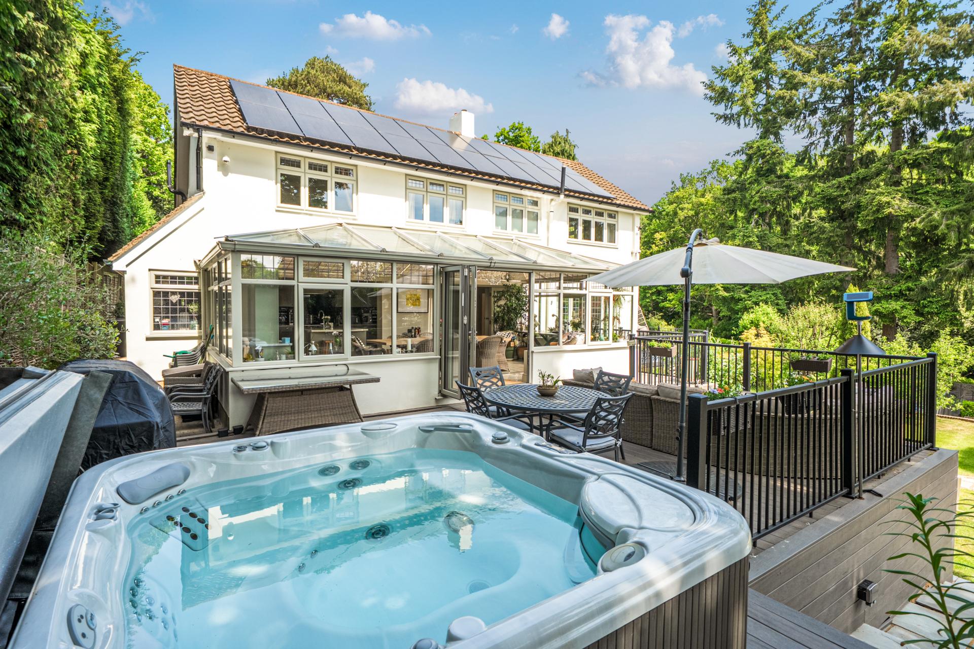 With stairs rising from the entrance hall up to first floor, the kitchen/breakfast room is fitted with an attractive Shaker style kitchen, Corian work surfaces, Smeg range cooker and Quooker hot water tap. The kitchen leads into an attractive conservatory, with double doors onto a large decked area with a hot tub and far reaching views. The pretty double aspect living room is laid with parquet flooring, bespoke shelving, feature fireplace and french doors onto the decked area. In addition, there is a fitted study, utility room and cloakroom.