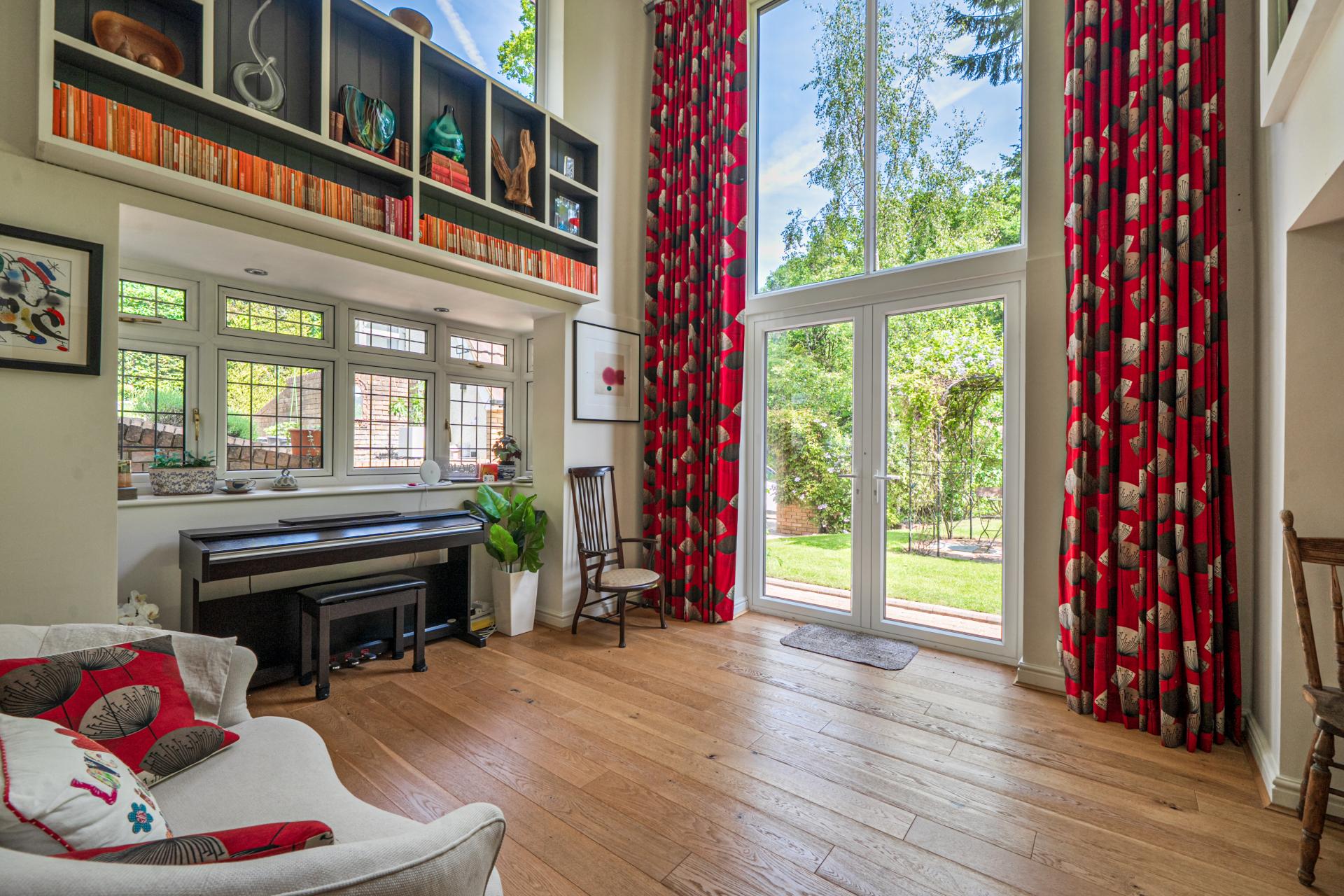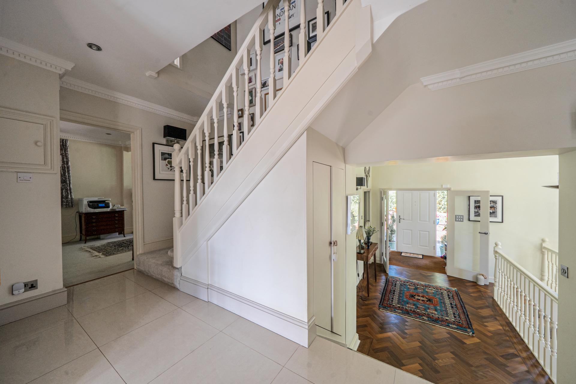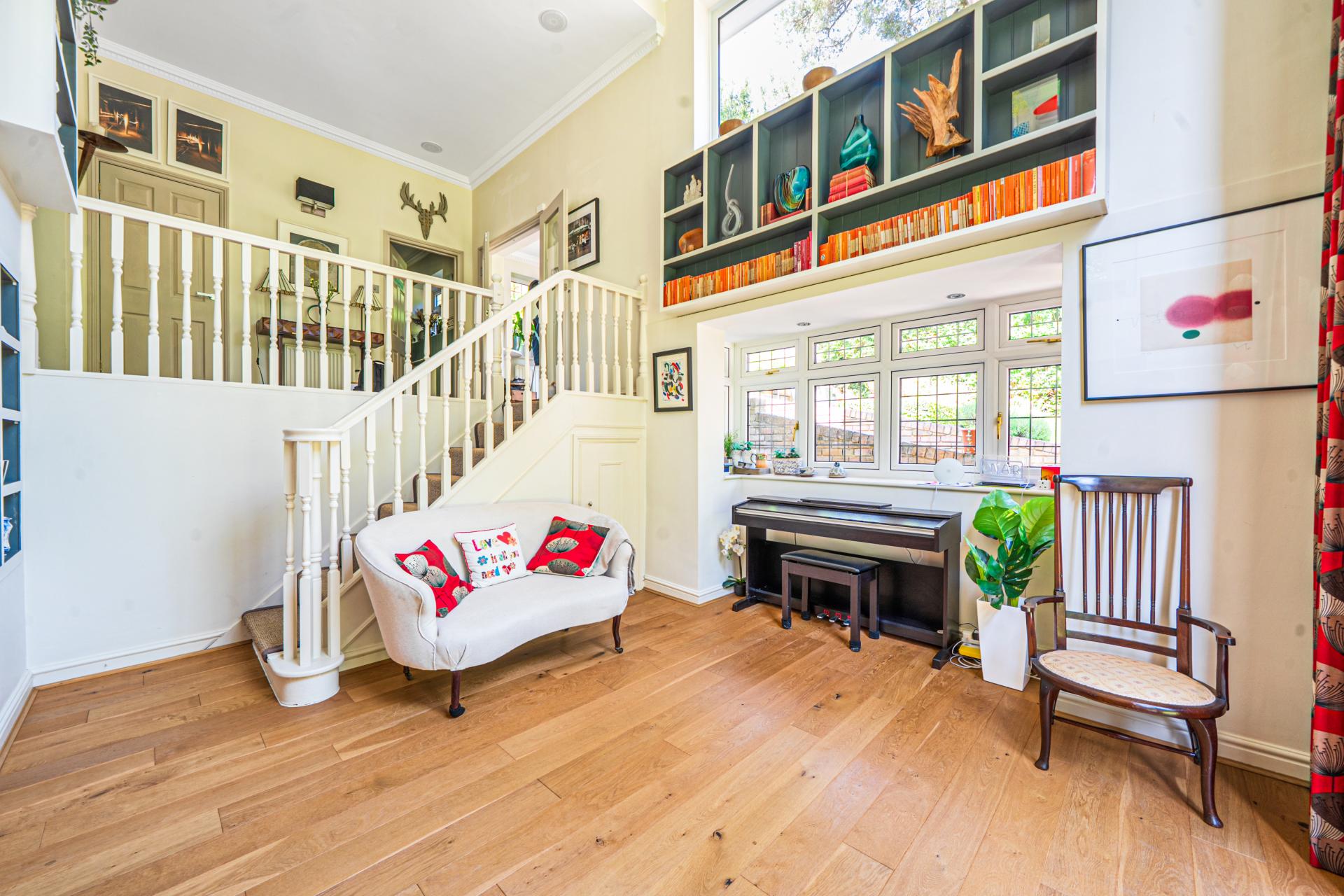 Approached via a gated driveway, with steps leading up to a storm porch, this detached family home has been refurbished by the owners, who purchased this property from us in 2013. Upon entering the light filled entrance hall, a staircase leads down to the music room/library with french doors onto the garden and double doors leading into a cinema room/occasional bedroom with an ensuite shower room with underfloor heating.