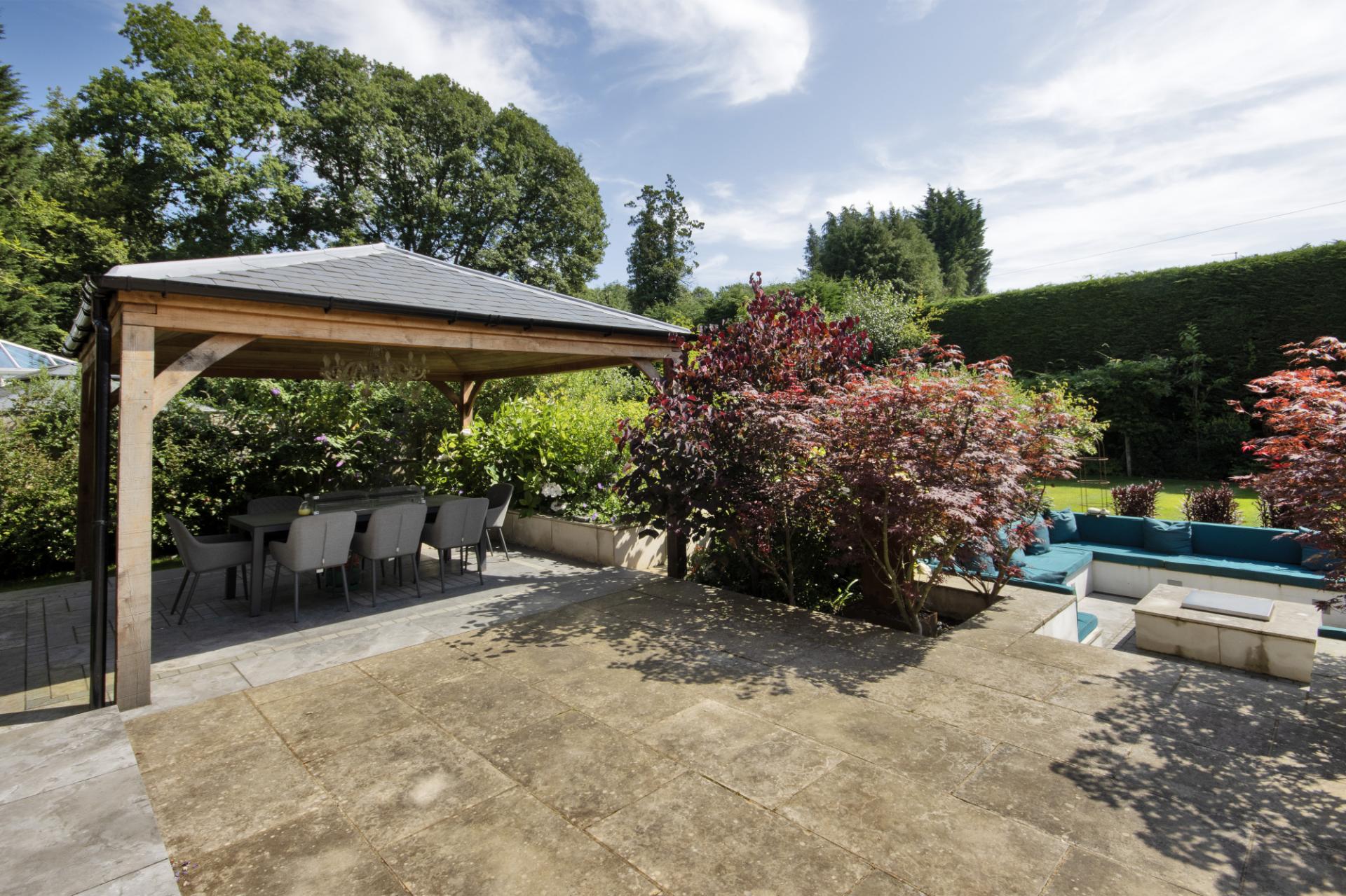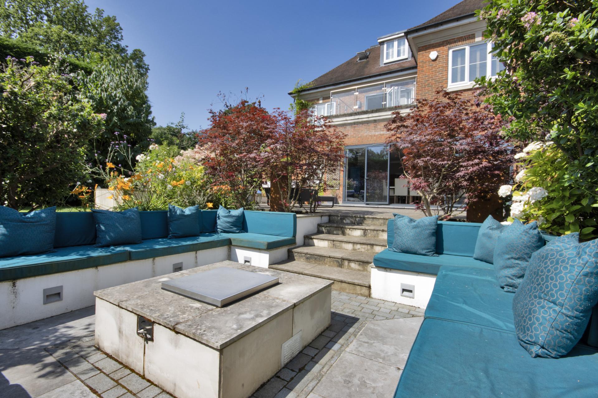 Outside the front and rear gardens have been beautifully landscaped, to the rear there is a covered seating area, ideal for al fresco dining, a sunken seating area with a firepit and to the front is a large, gated driveway with access to the integral double garage with tiled flooring.