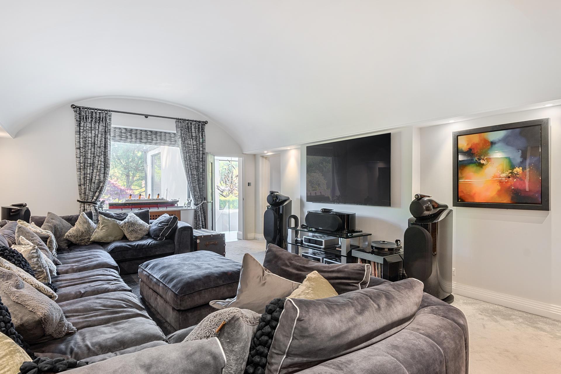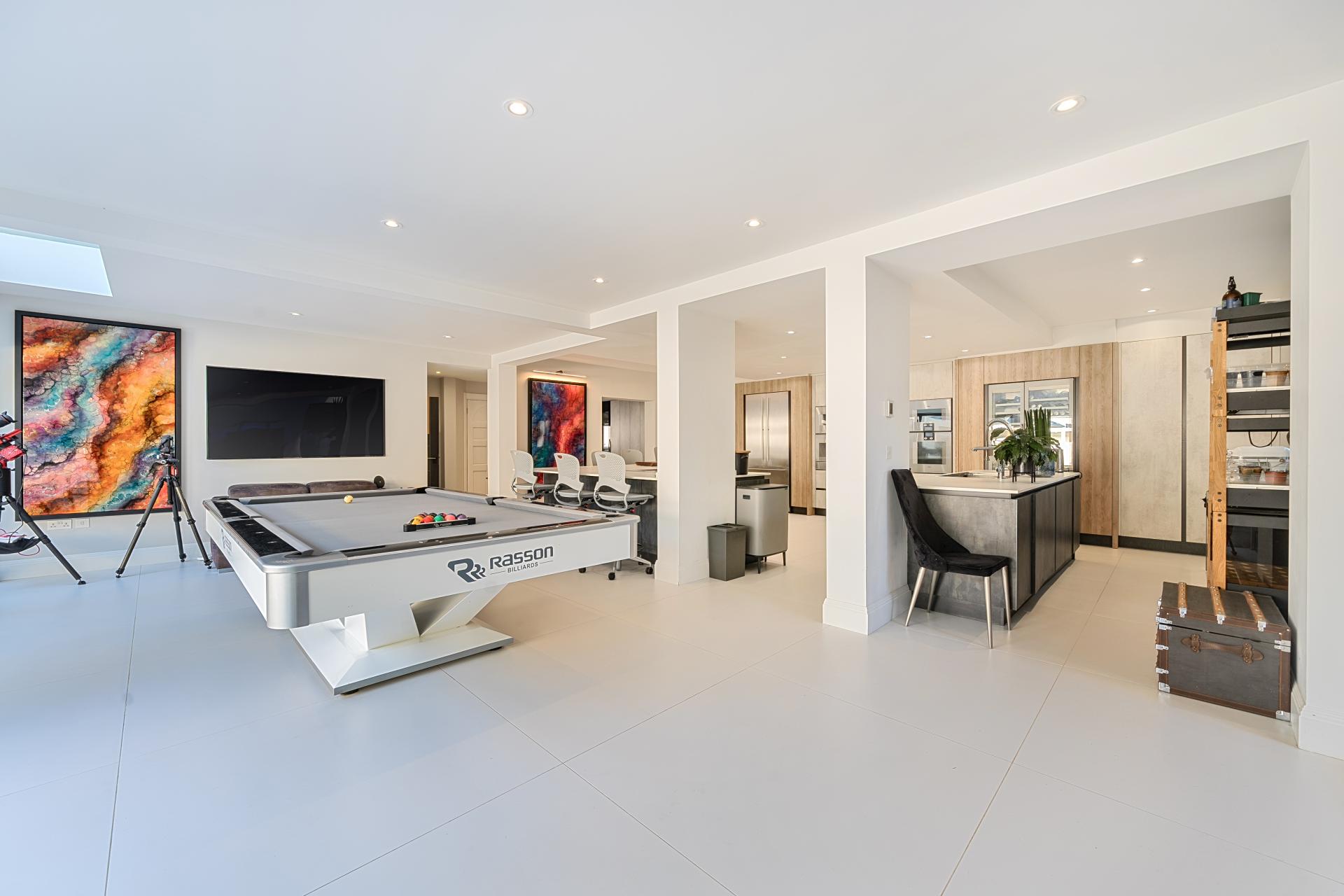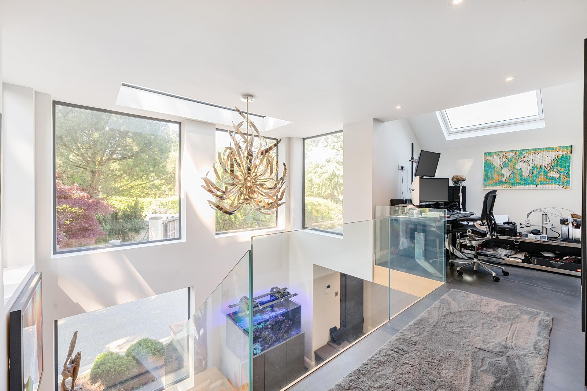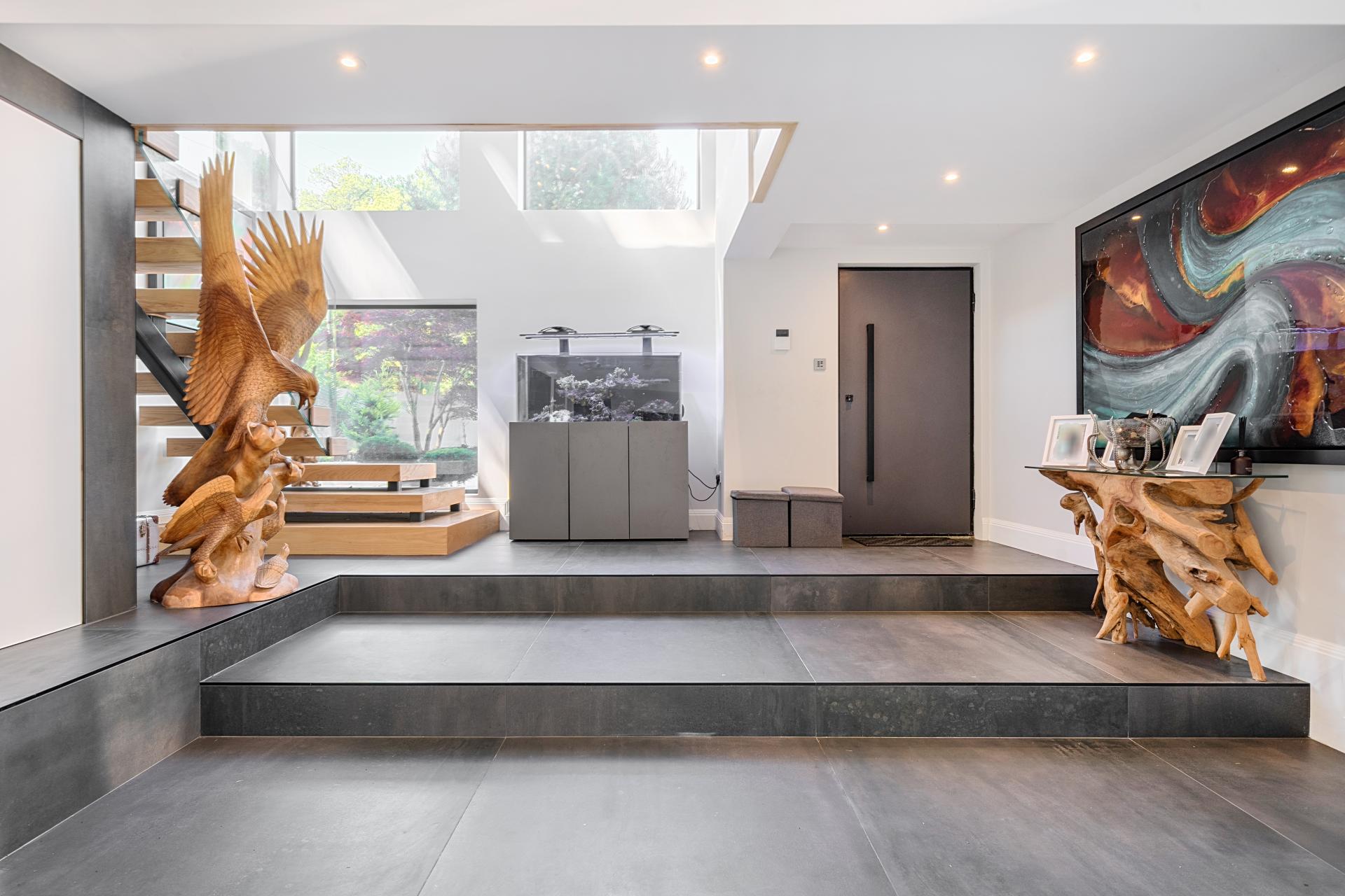 Upon entry, you walk into the reception hall with an expansive and vaulted ceiling and large picture windows, which leads directly into the modern kitchen/dining room/family room. The kitchen is contemporary and sleek in style and is fitted with a range of integral Gagganau appliances, a Grohe stainless steel double sink with a Zipp hydro tap, double wine fridges and water softener. With a porcelain tiled floor and underfloor heating, the kitchen/diner/family room has two sets of bi-fold doors leading onto the garden. In addition to the ground floor, there is a fully fitted utility room plus double wine fridges and a cloakroom with Japanese style toilet.