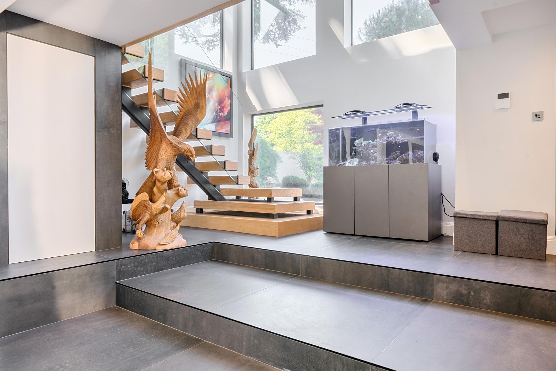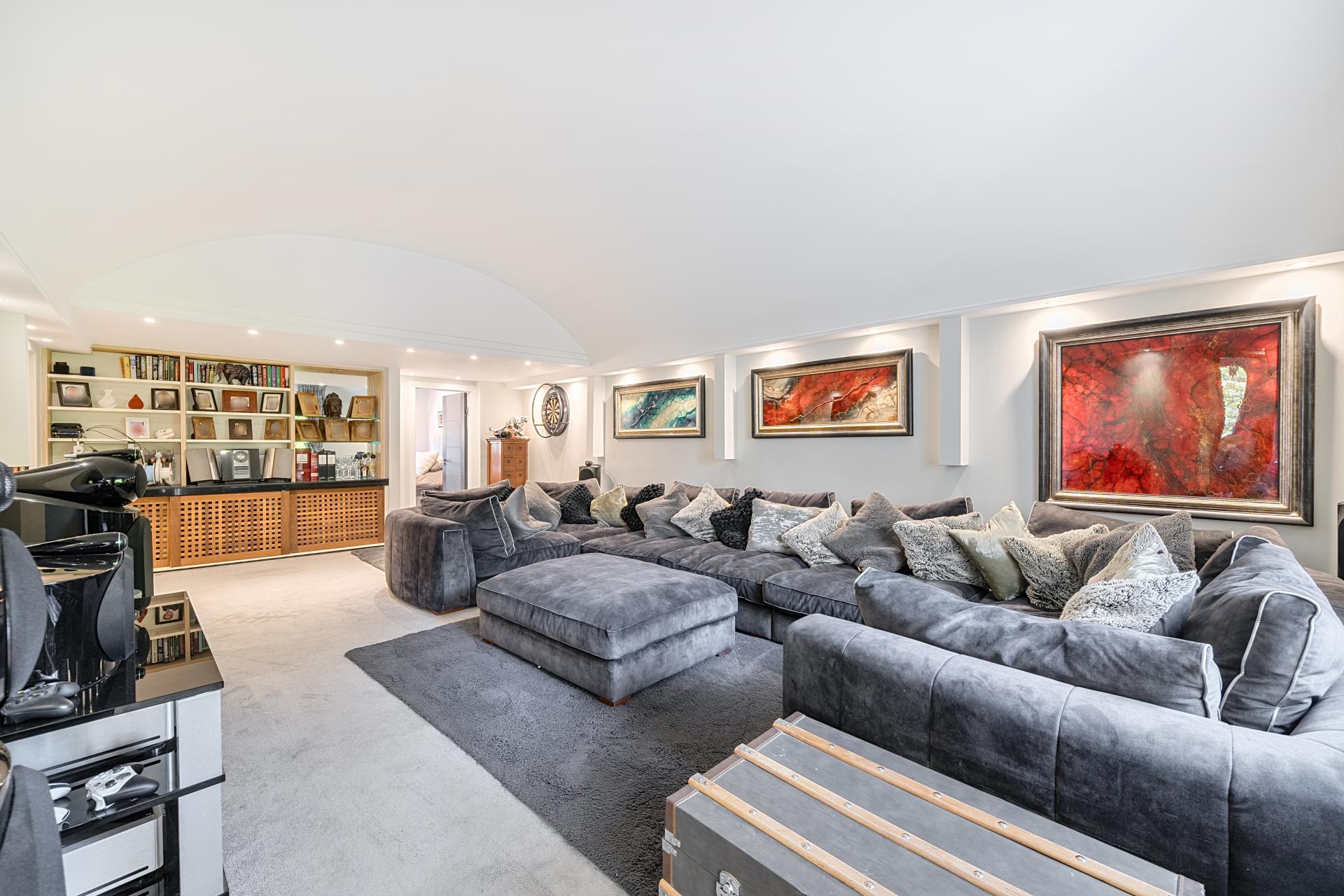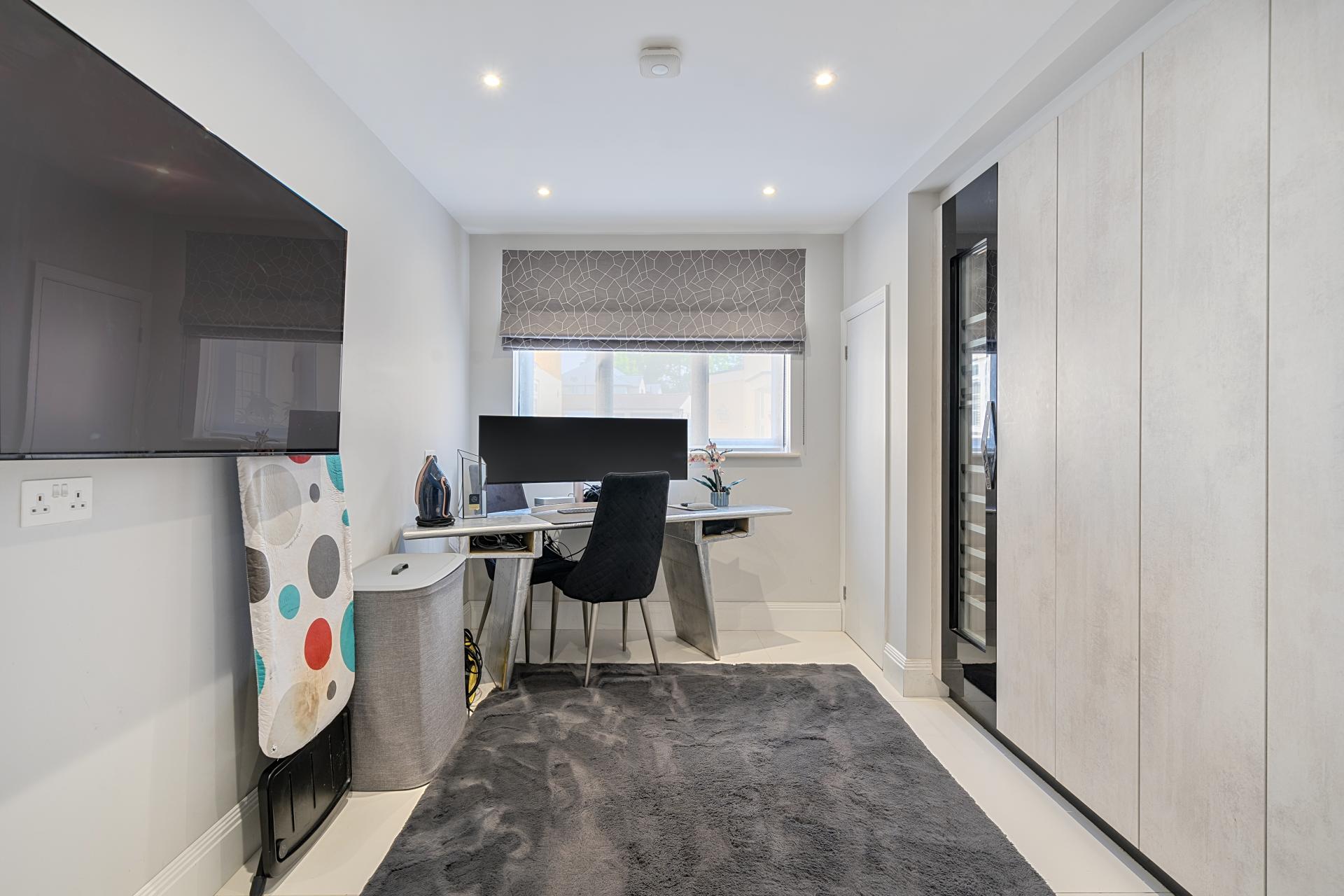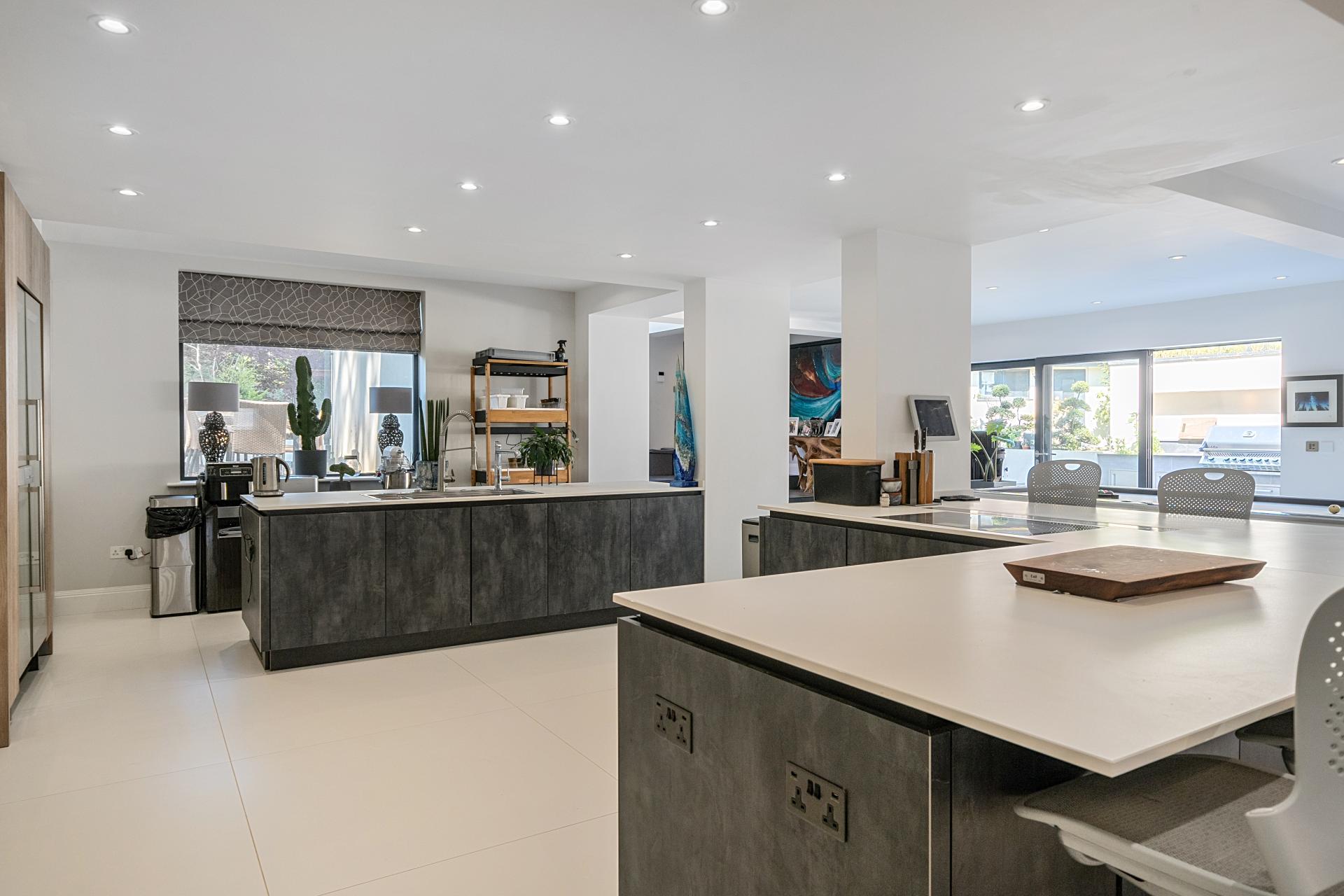 Upon entry, you walk into the reception hall with an expansive and vaulted ceiling and large picture windows, which leads directly into the modern kitchen/dining room/family room. The kitchen is contemporary and sleek in style and is fitted with a range of integral Gagganau appliances, a Grohe stainless steel double sink with a Zipp hydro tap, double wine fridges and water softener. With a porcelain tiled floor and underfloor heating, the kitchen/diner/family room has two sets of bi-fold doors leading onto the garden. In addition to the ground floor, there is a fully fitted utility room plus double wine fridges and a cloakroom with Japanese style toilet.