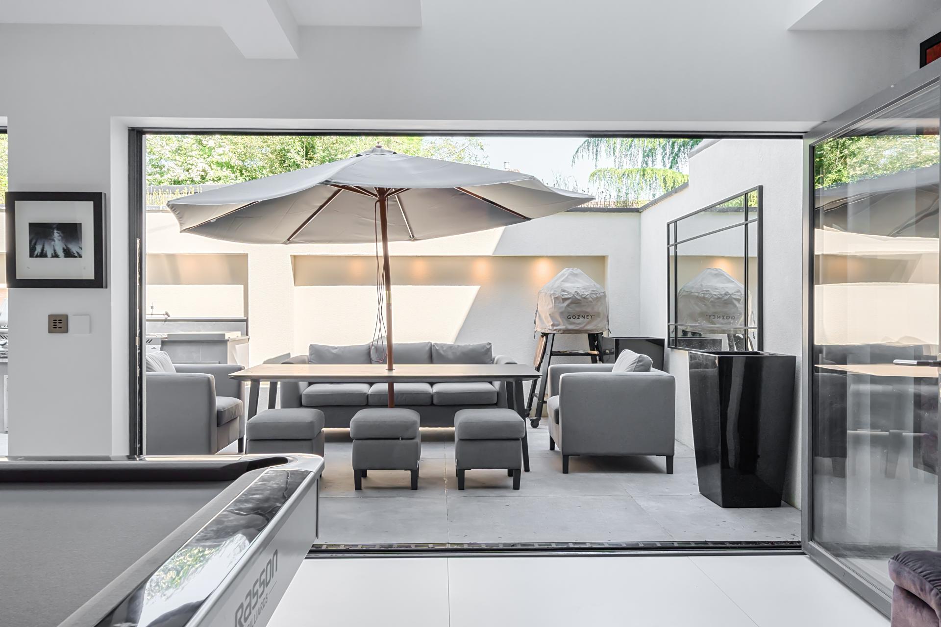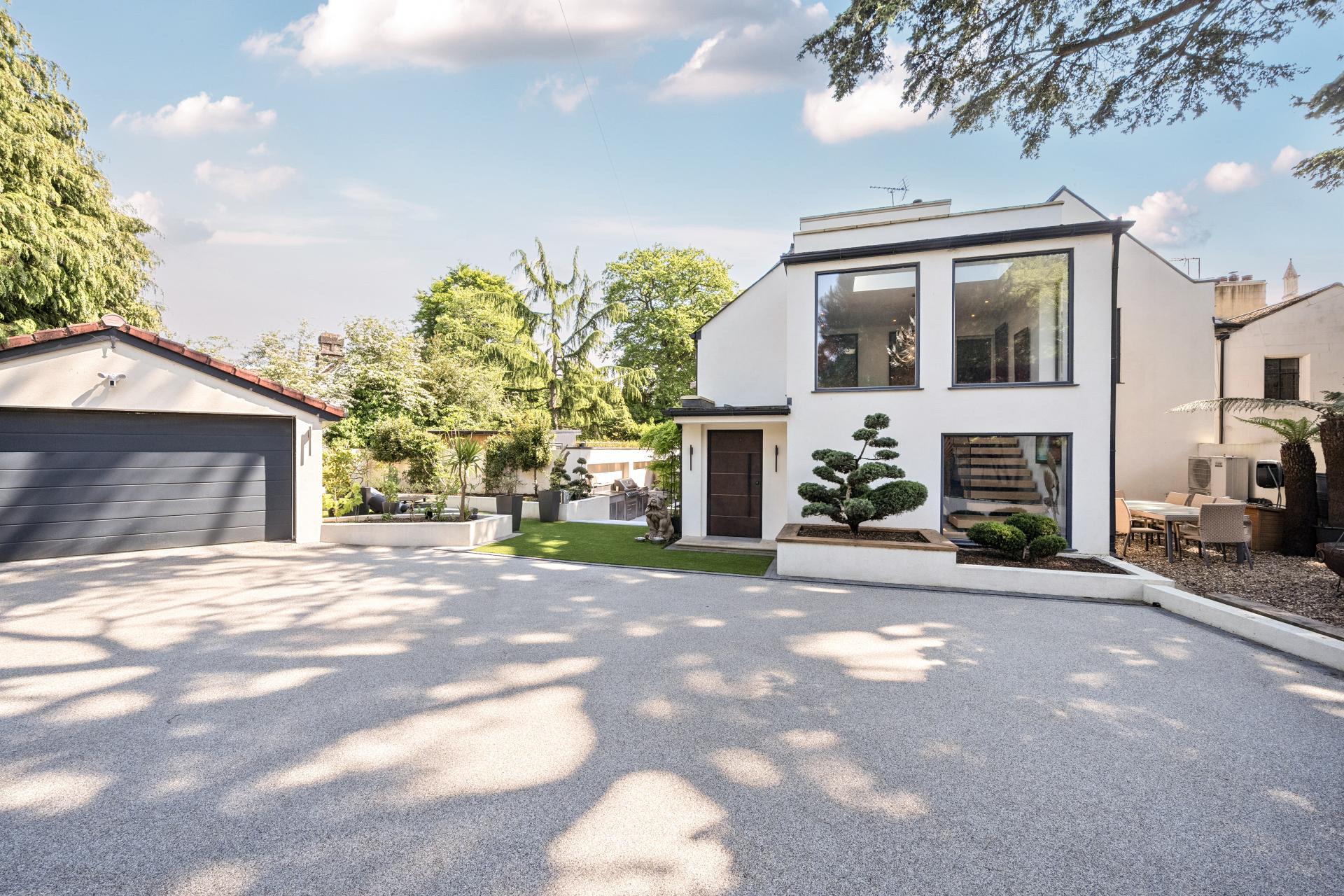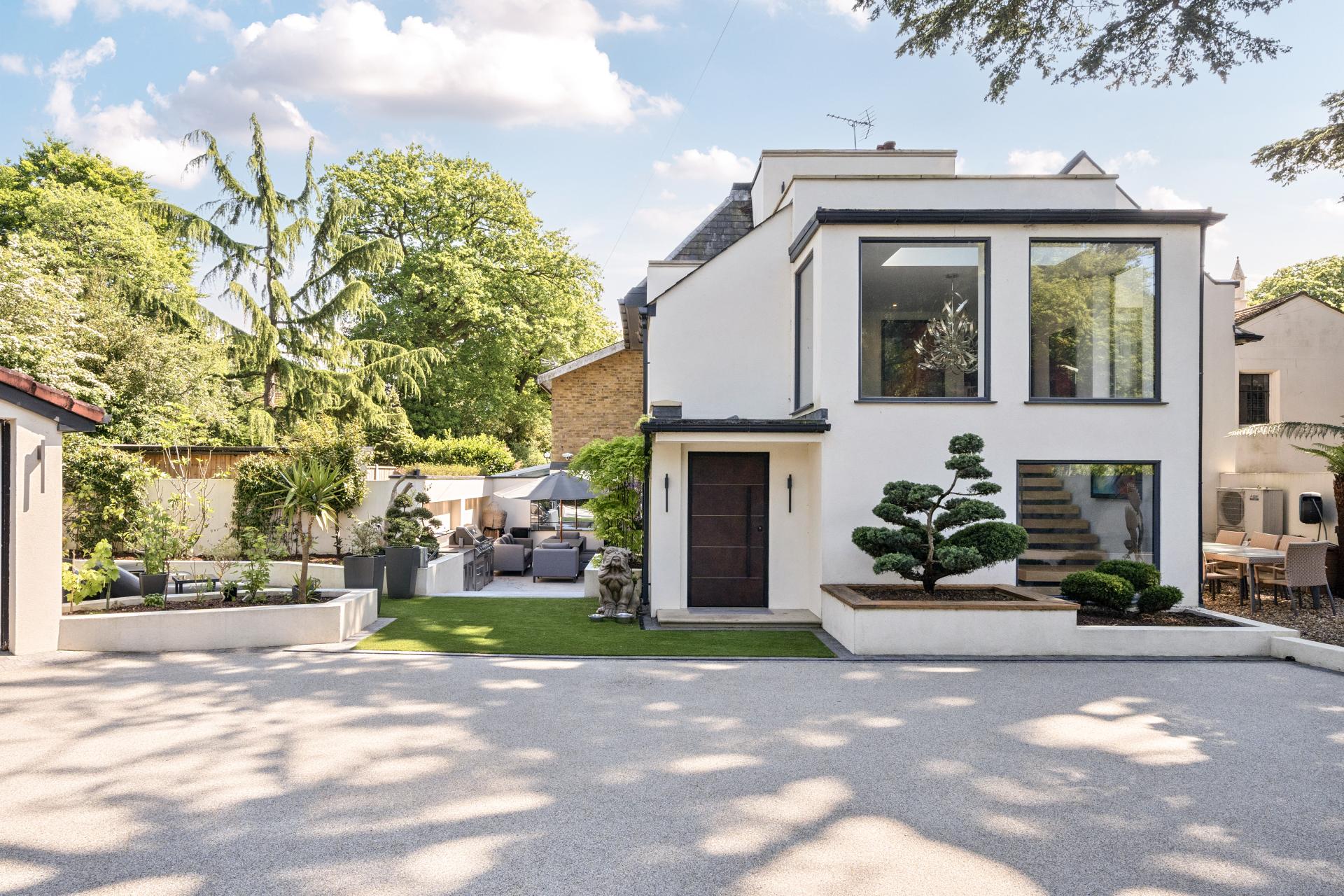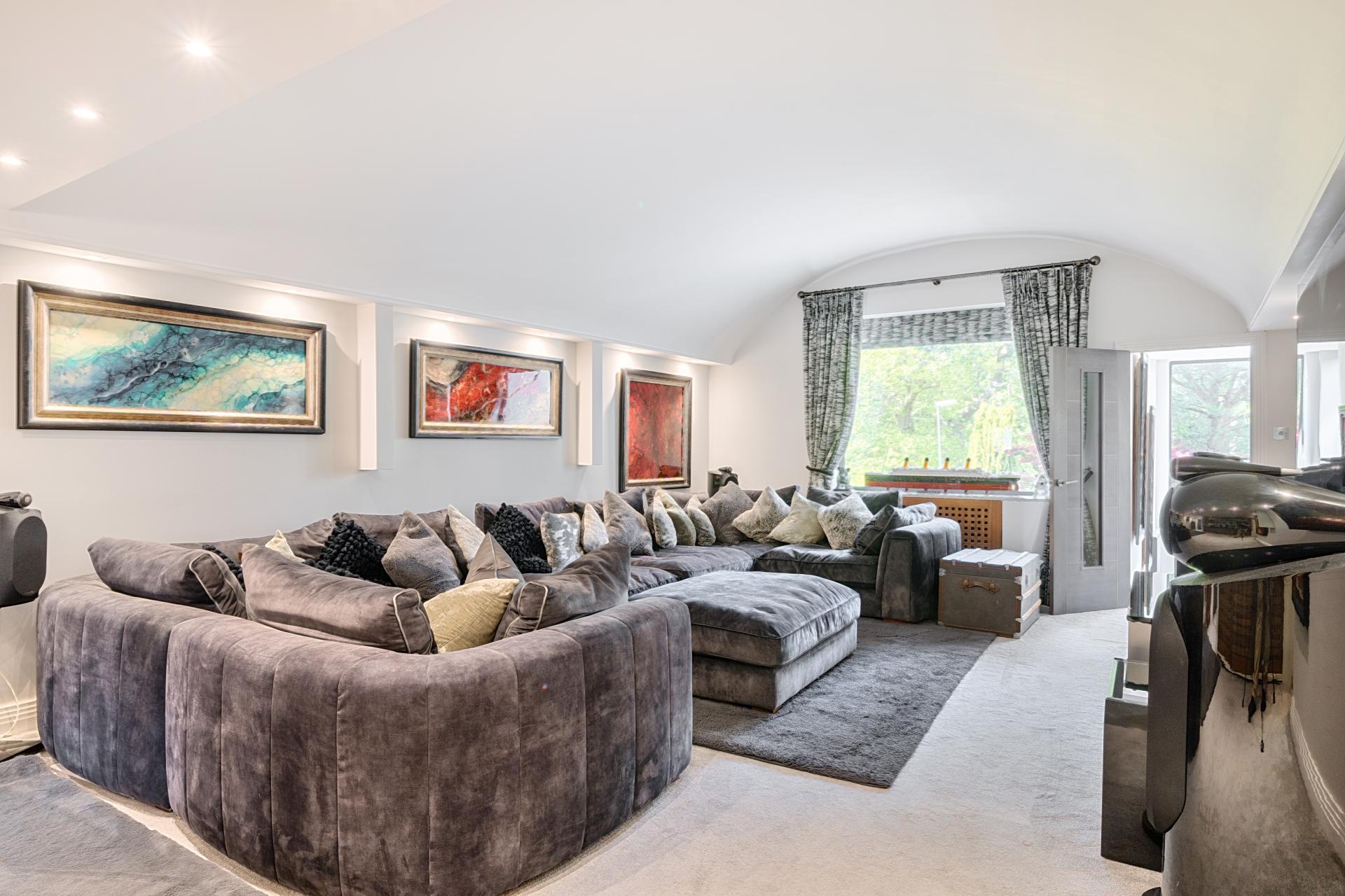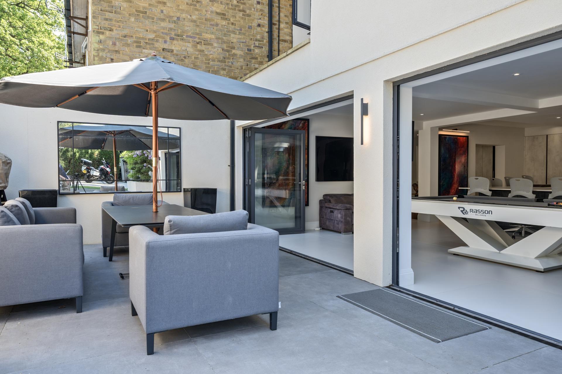 Upon entry, you walk into the reception hall with an expansive and vaulted ceiling and large picture windows, which leads directly into the modern kitchen/dining room/family room. The kitchen is contemporary and sleek in style and is fitted with a range of integral Gagganau appliances, a Grohe stainless steel double sink with a Zipp hydro tap, double wine fridges and water softener. With a porcelain tiled floor and underfloor heating, the kitchen/diner/family room has two sets of bi-fold doors leading onto the garden. In addition to the ground floor, there is a fully fitted utility room plus double wine fridges and a cloakroom with Japanese style toilet.
