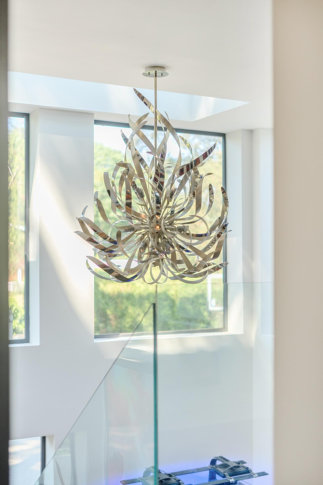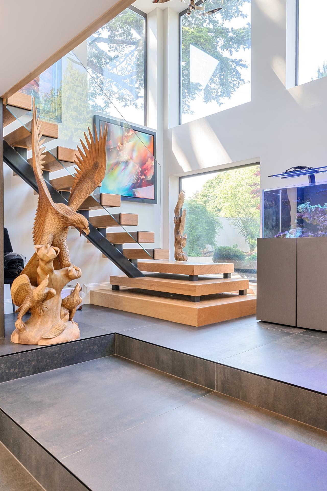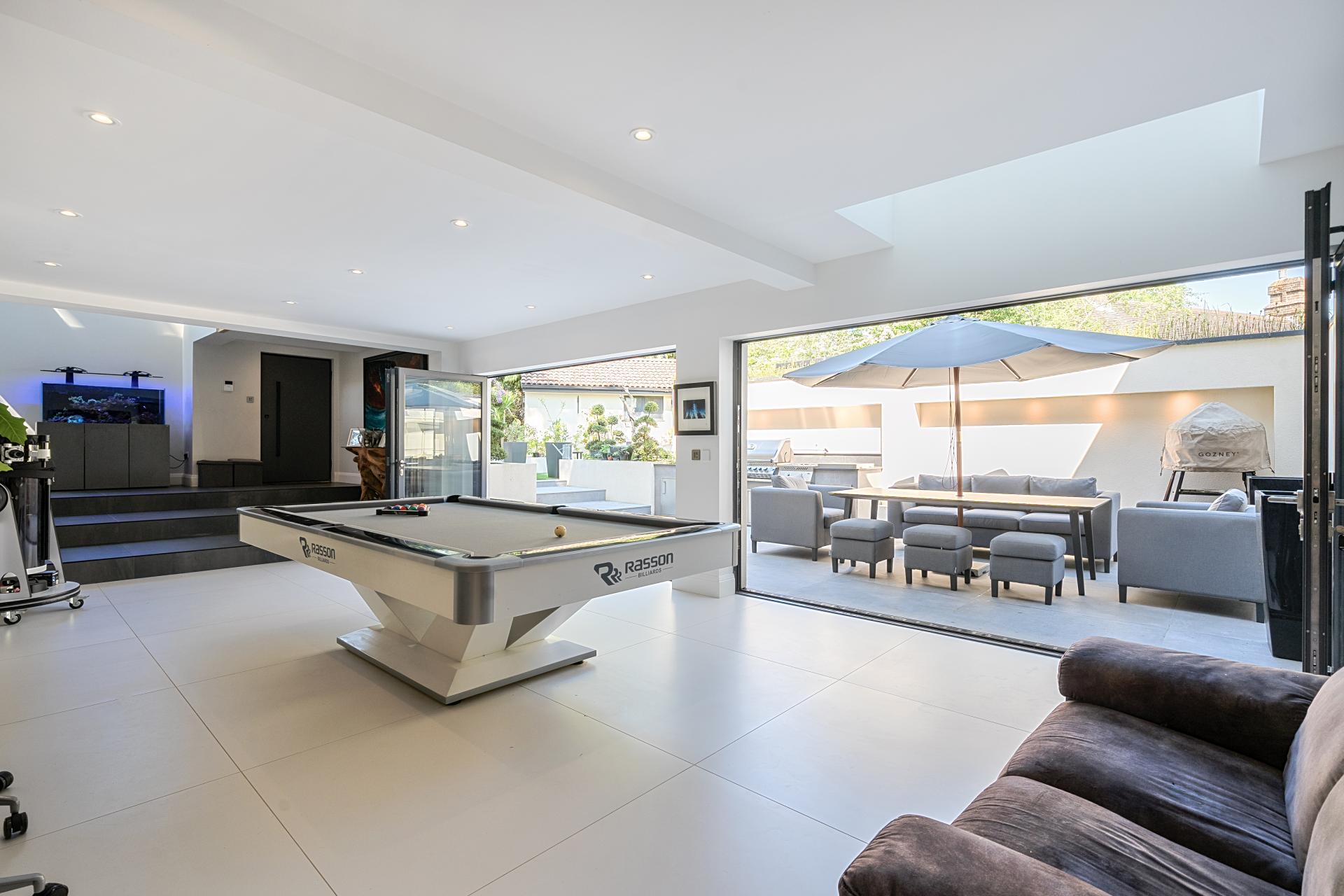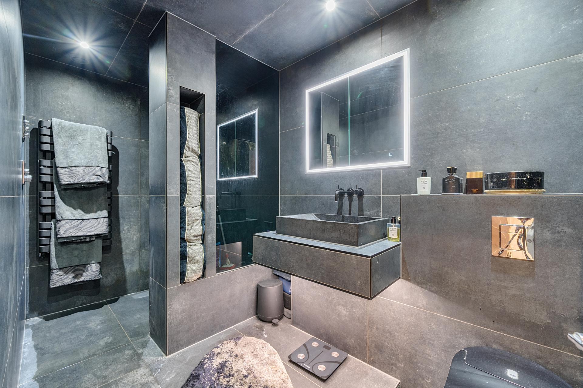 Upon entry, you walk into the reception hall with an expansive and vaulted ceiling and large picture windows, which leads directly into the modern kitchen/dining room/family room. The kitchen is contemporary and sleek in style and is fitted with a range of integral Gagganau appliances, a Grohe stainless steel double sink with a Zipp hydro tap, double wine fridges and water softener. With a porcelain tiled floor and underfloor heating, the kitchen/diner/family room has two sets of bi-fold doors leading onto the garden. In addition to the ground floor, there is a fully fitted utility room plus double wine fridges and a cloakroom with Japanese style toilet.