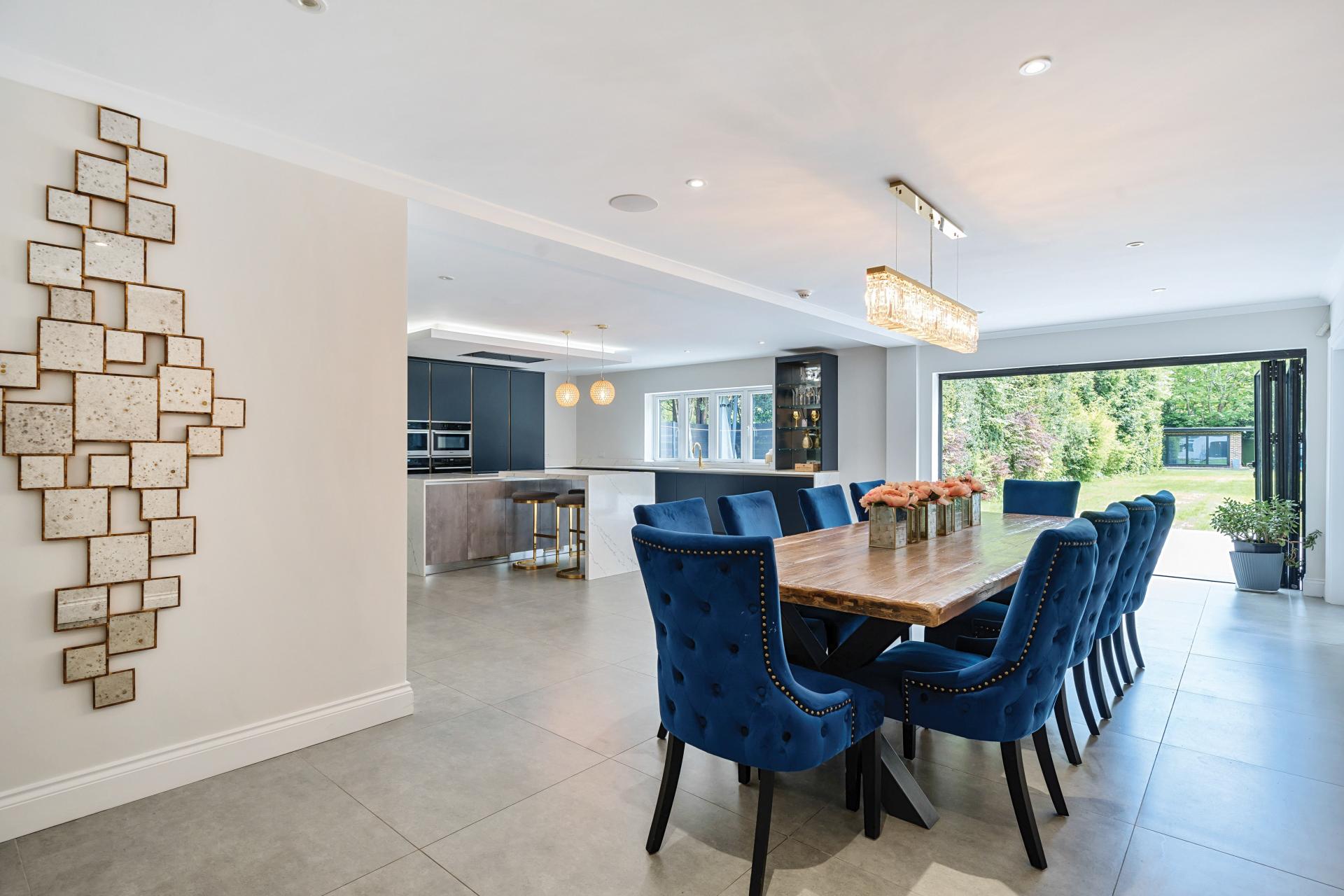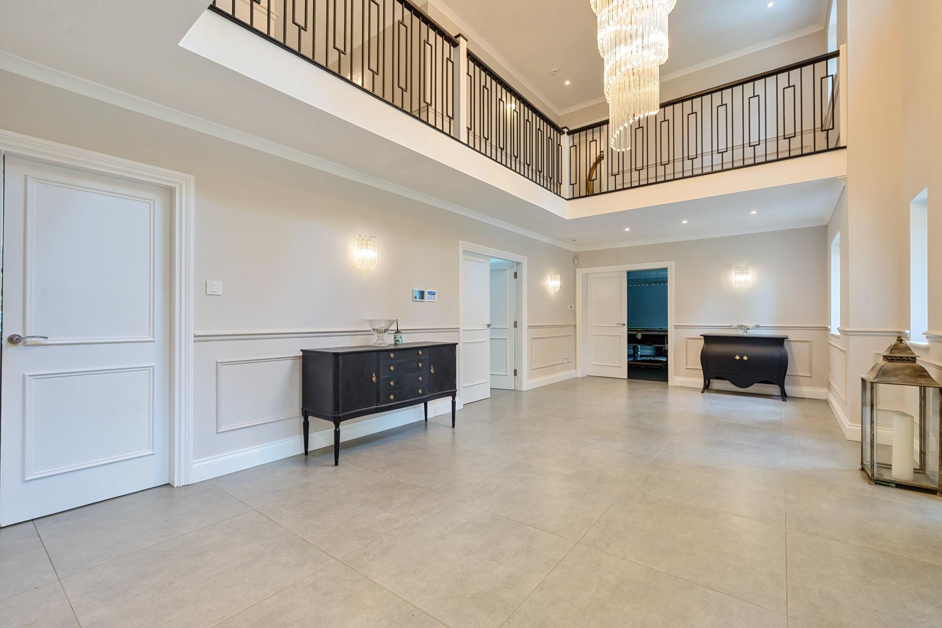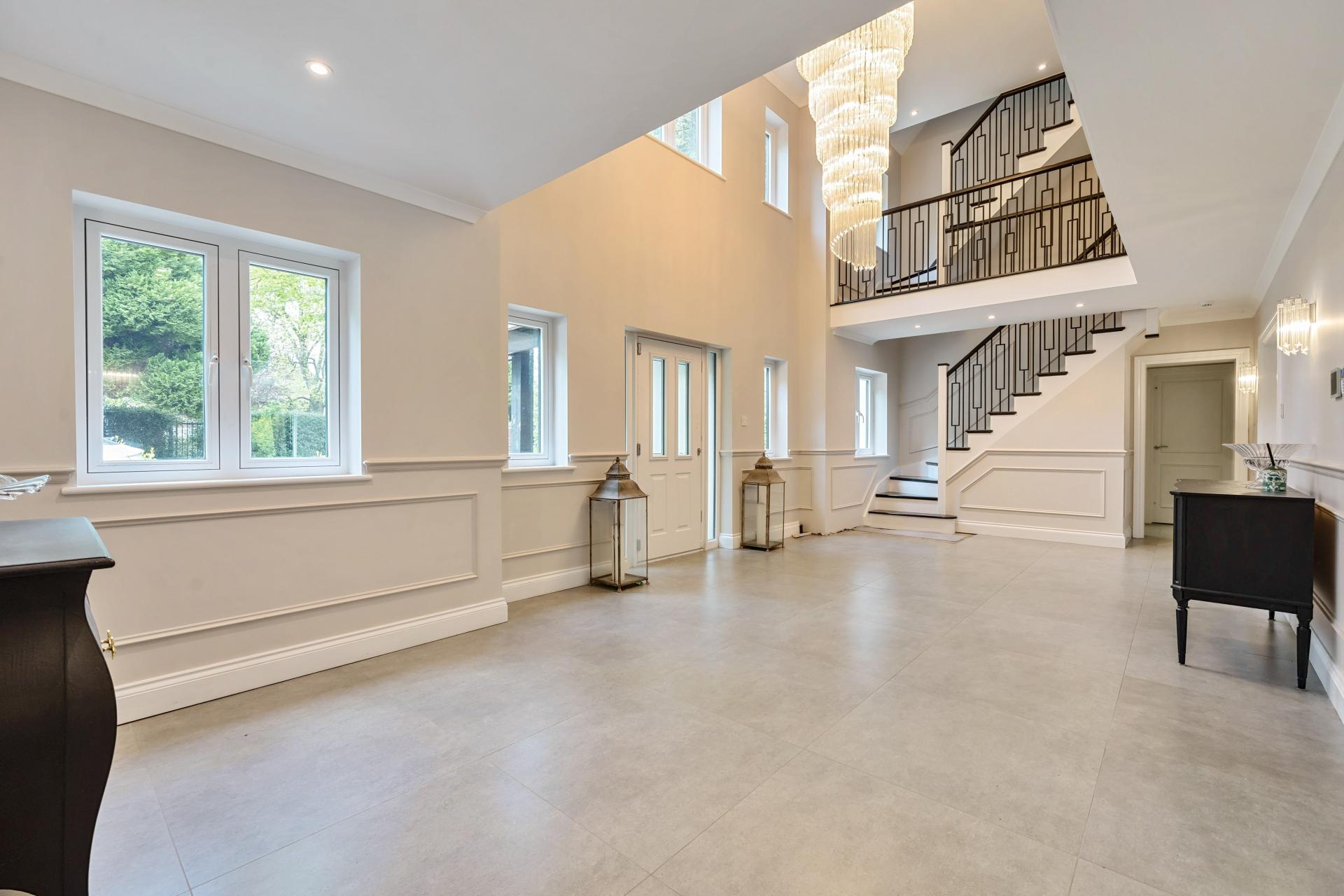 Positioned within this tree lined road, this outstanding home offers exceptional space inside and out. An impressive reception hall with a galleried landing provides access to a large front facing games room and three reception rooms to the rear. An open plan kitchen/dining room is undoubtedly the hub of the home with a sitting room and media room/snug also accessible and all with bi folding doors to the garden. There is also a utility room, integral garage and a cloakroom.