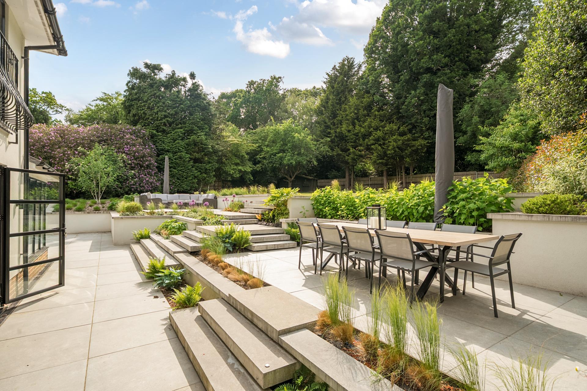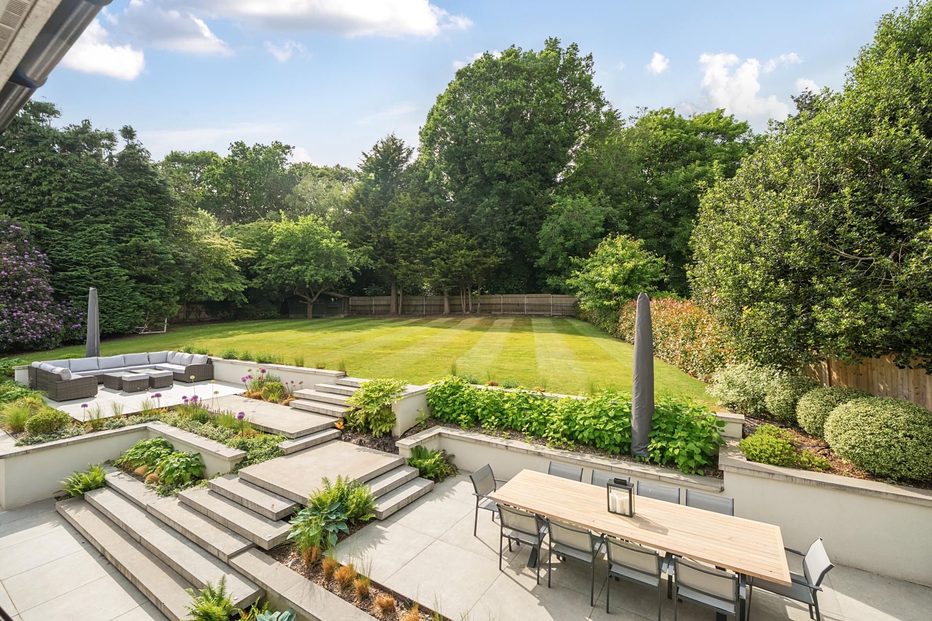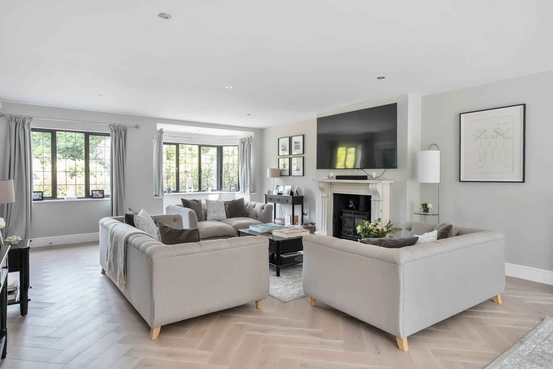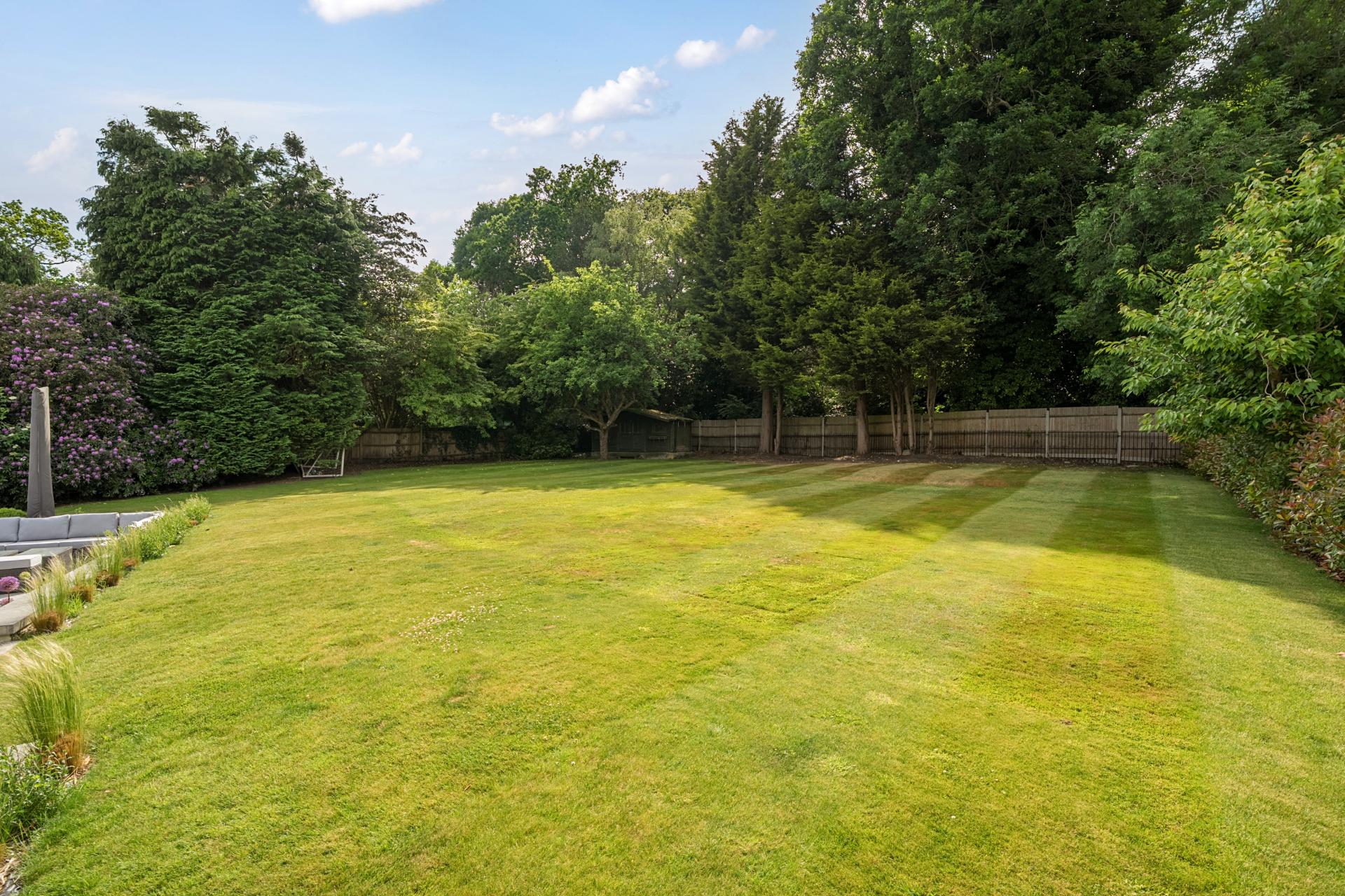 The rear garden has been designed to a high standard and is contemporary in style and perfect for outside entertaining, with zoned seating and dining areas and a large lawn area. Accessed from the rear of the double garage is a useful storeroom and in addition a garden cabin. To the front of the property is a sweeping carriage driveway, large lawn, and dawn to dusk exterior lighting.