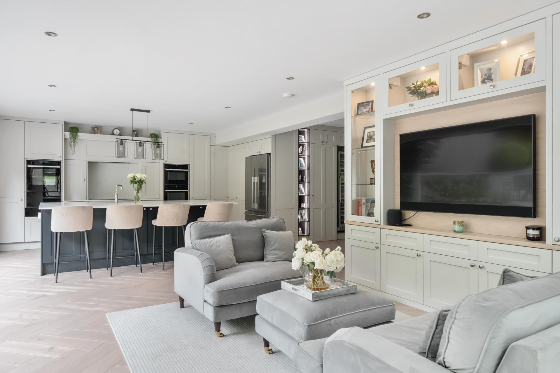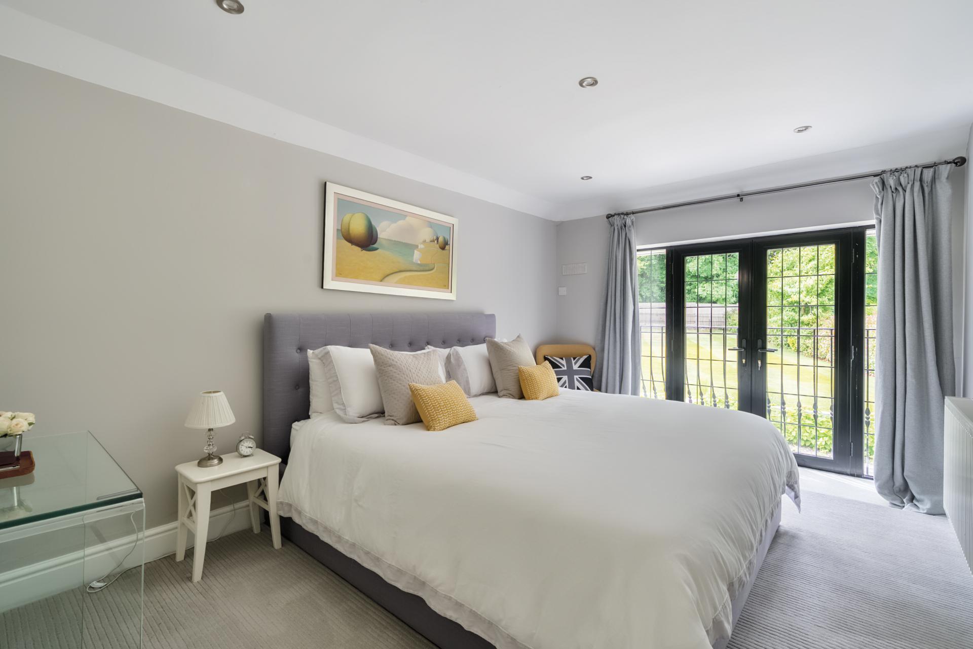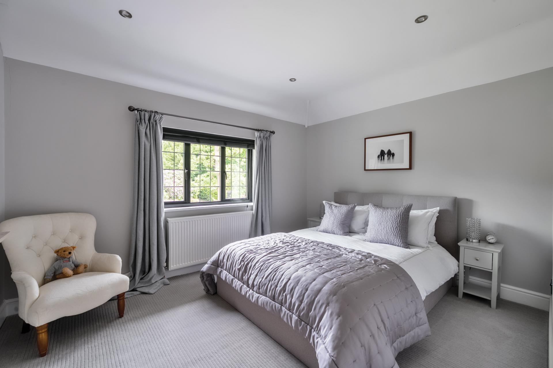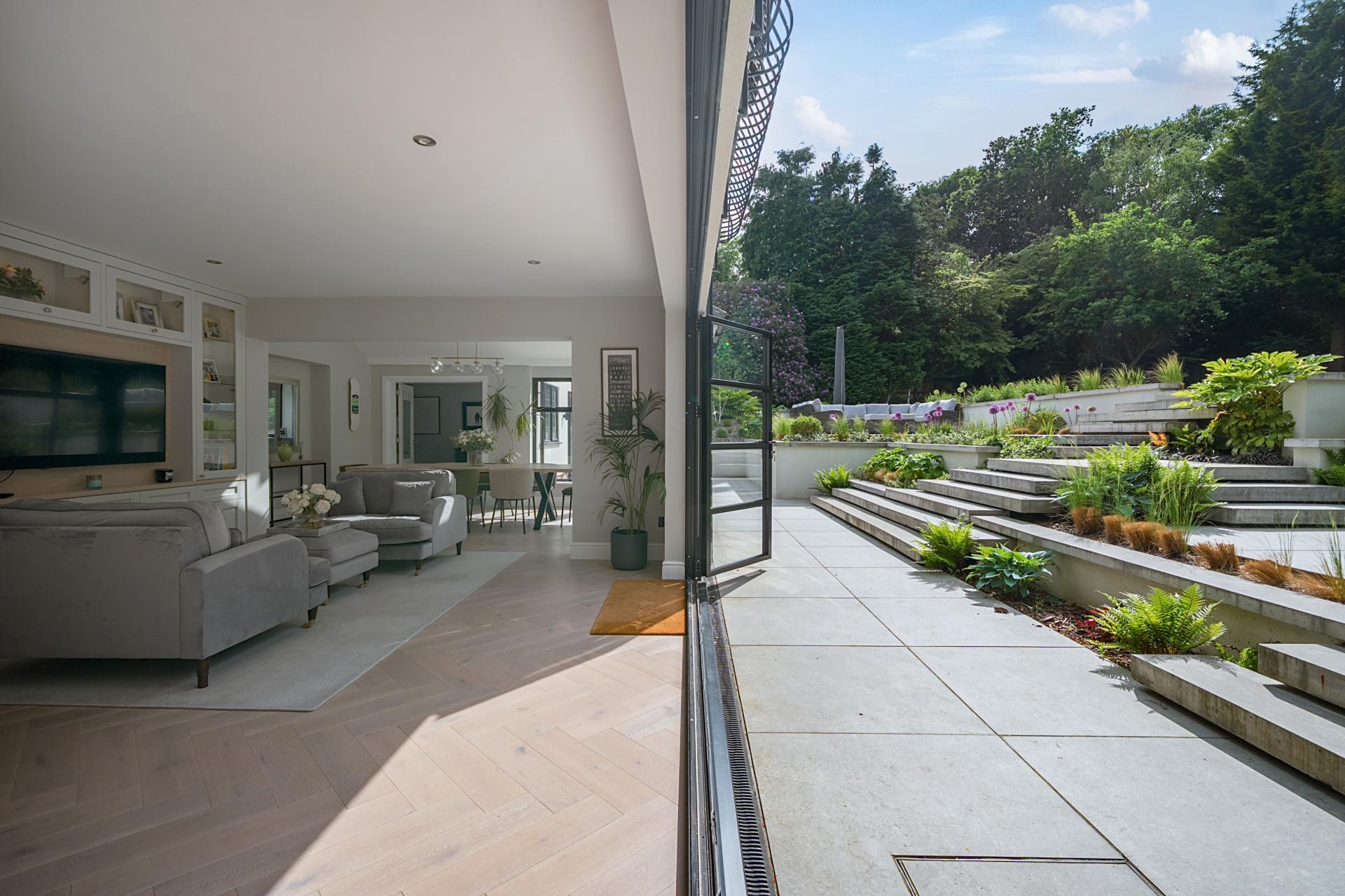 The rear garden has been designed to a high standard and is contemporary in style and perfect for outside entertaining, with zoned seating and dining areas and a large lawn area. Accessed from the rear of the double garage is a useful storeroom and in addition a garden cabin. To the front of the property is a sweeping carriage driveway, large lawn, and dawn to dusk exterior lighting.