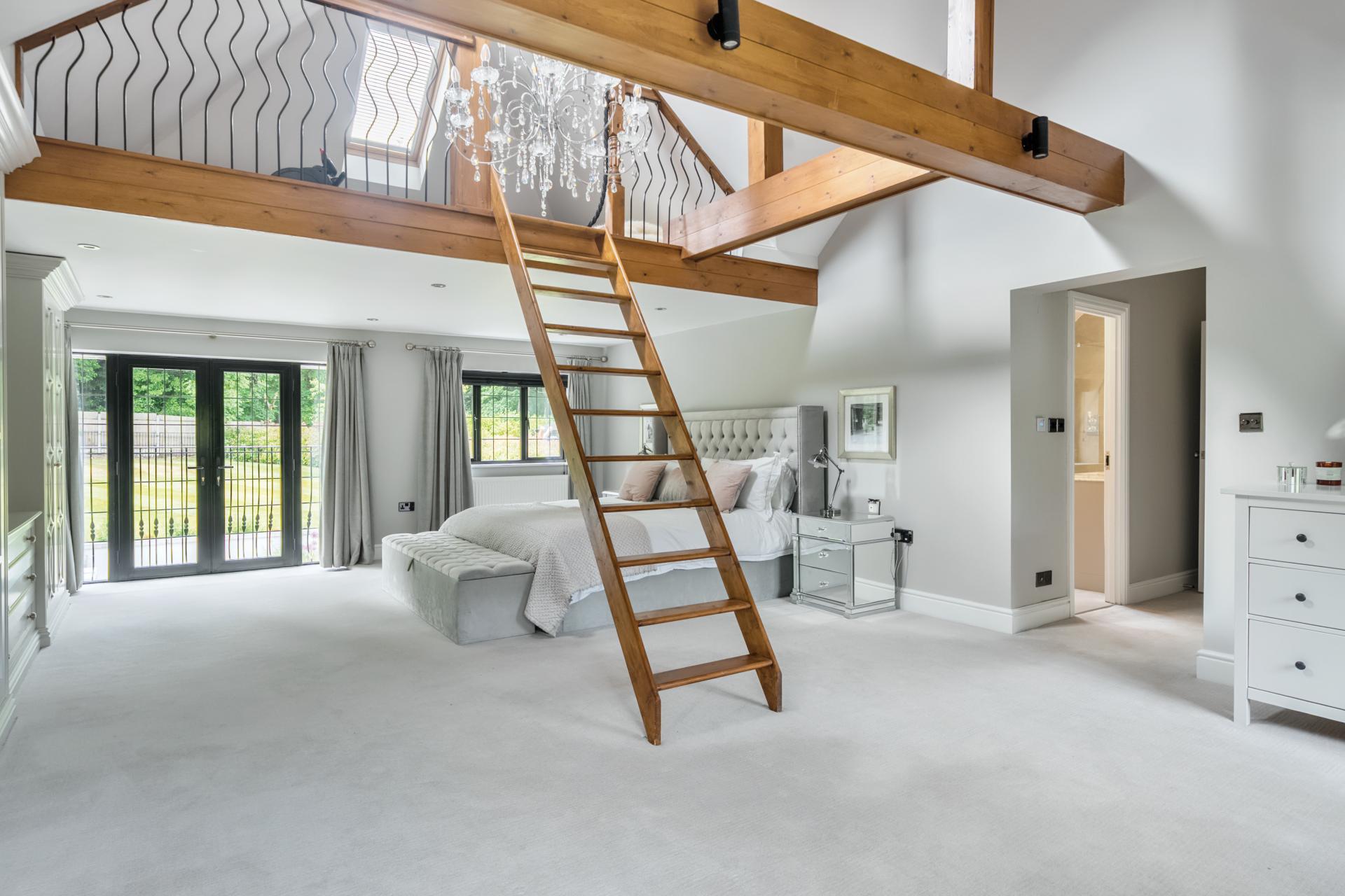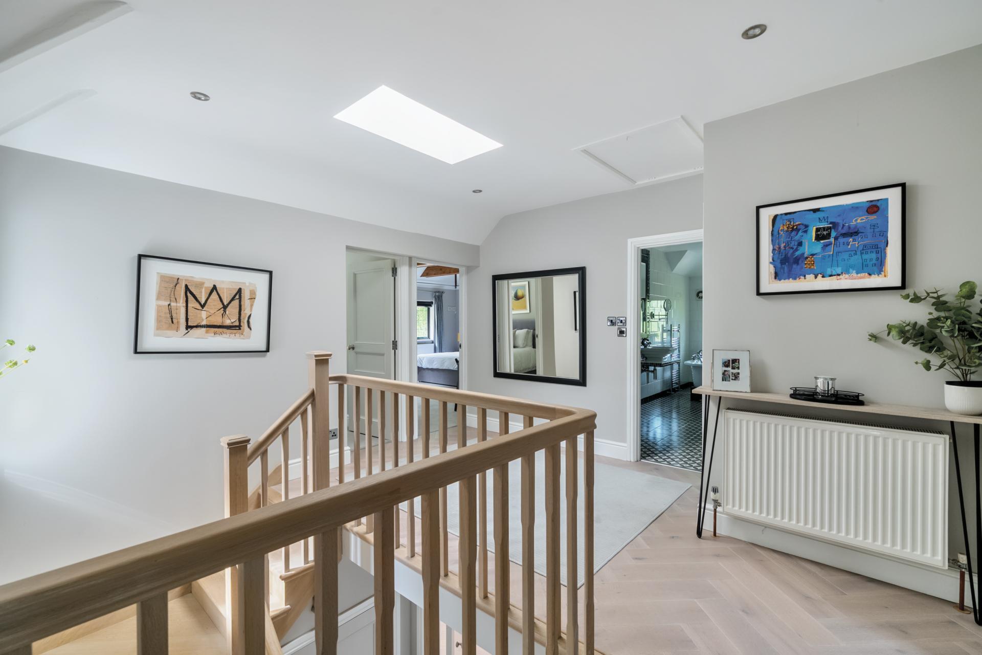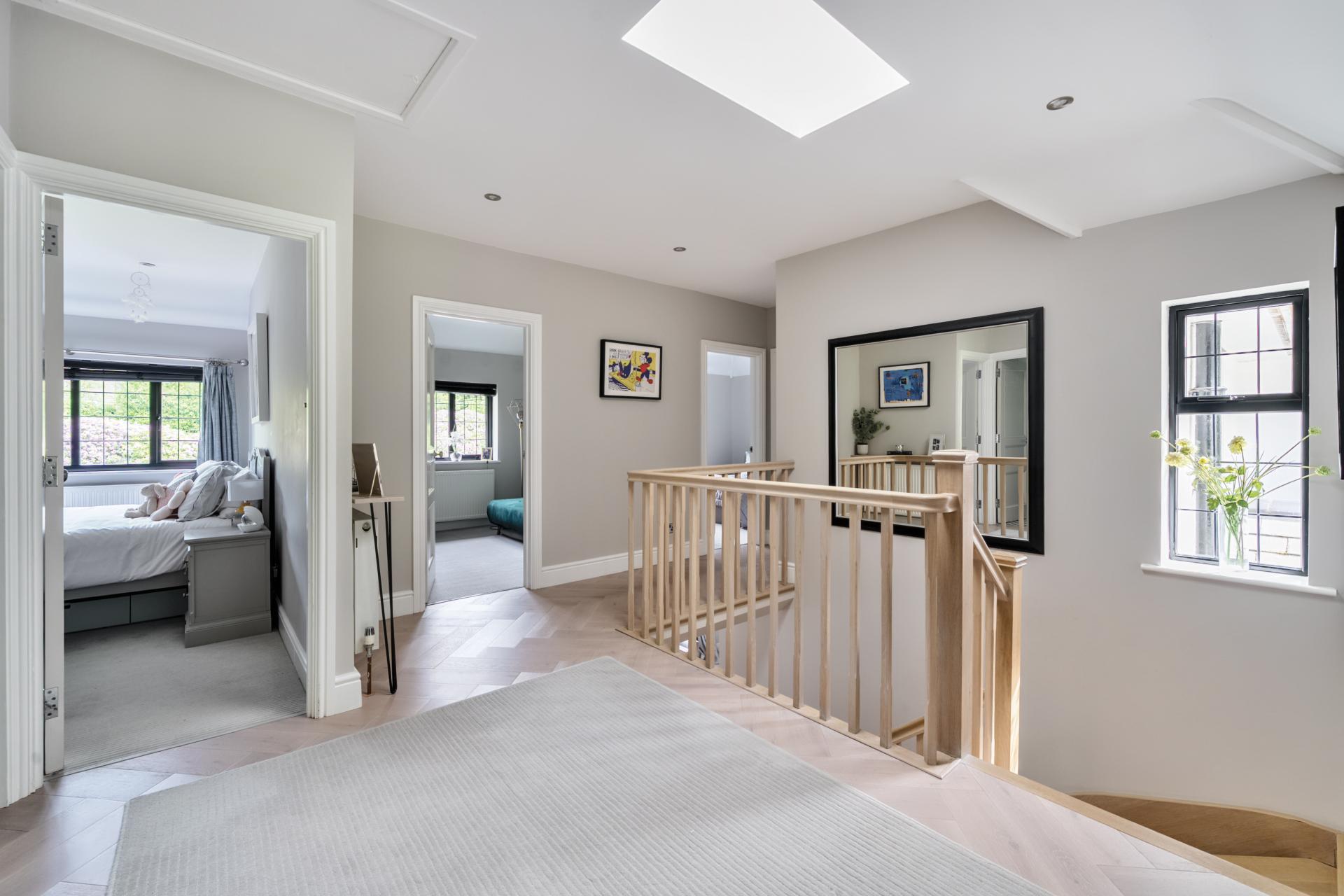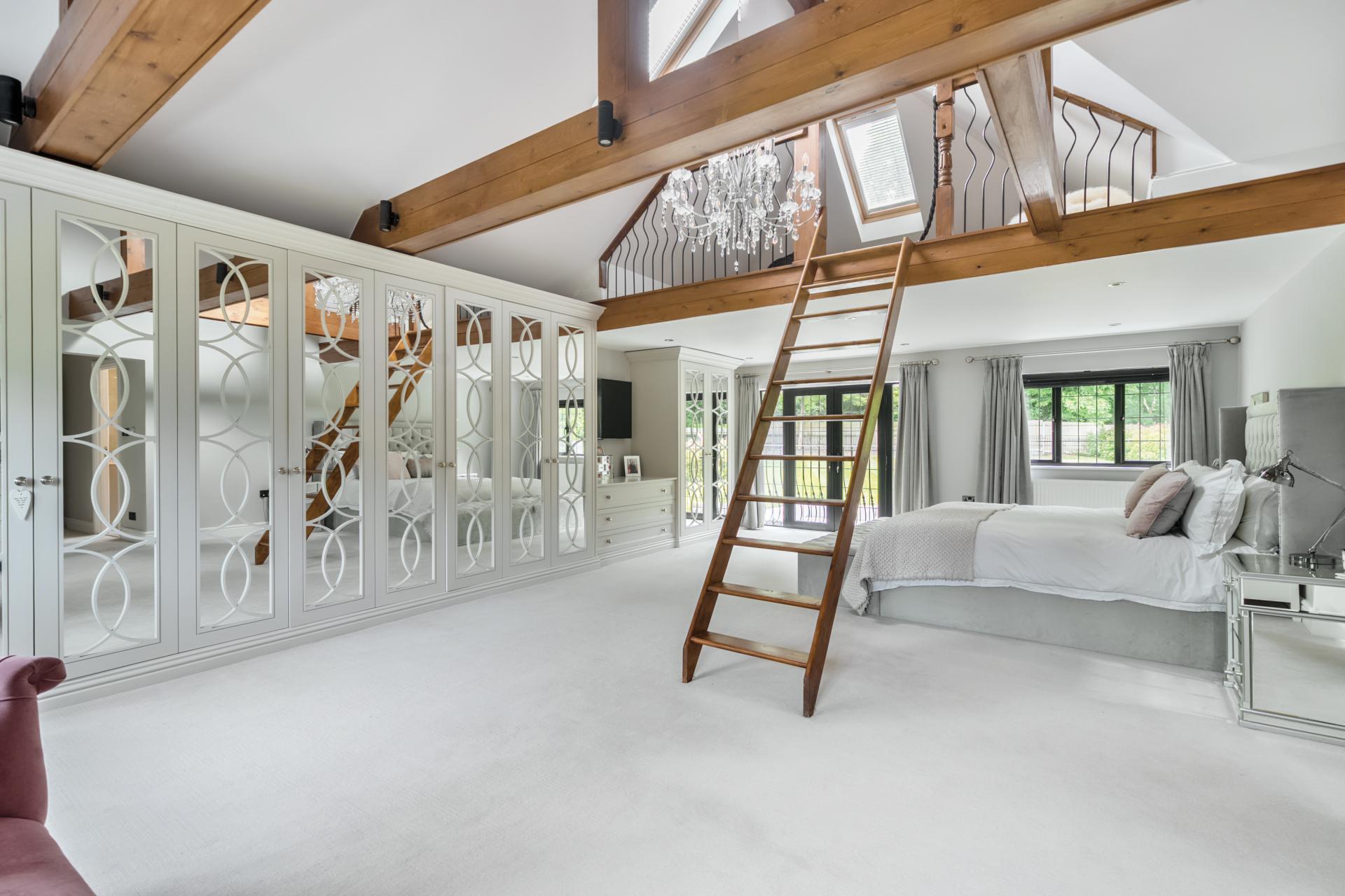 With a solid oak staircase rising to the first floor, the stunning principal bedroom is double aspect with a vaulted ceiling, mezzanine area and skylights. The bedroom also boats fitted wardrobes, designed and fitted by Heritage Wardrobes, a Juliette balcony, an ensuite with Lusso double sink unit and underfloor heating. There are two further double bedrooms with ensuite shower rooms, three further bedrooms serviced by a family bathroom, with bedroom six currently being used as a study.