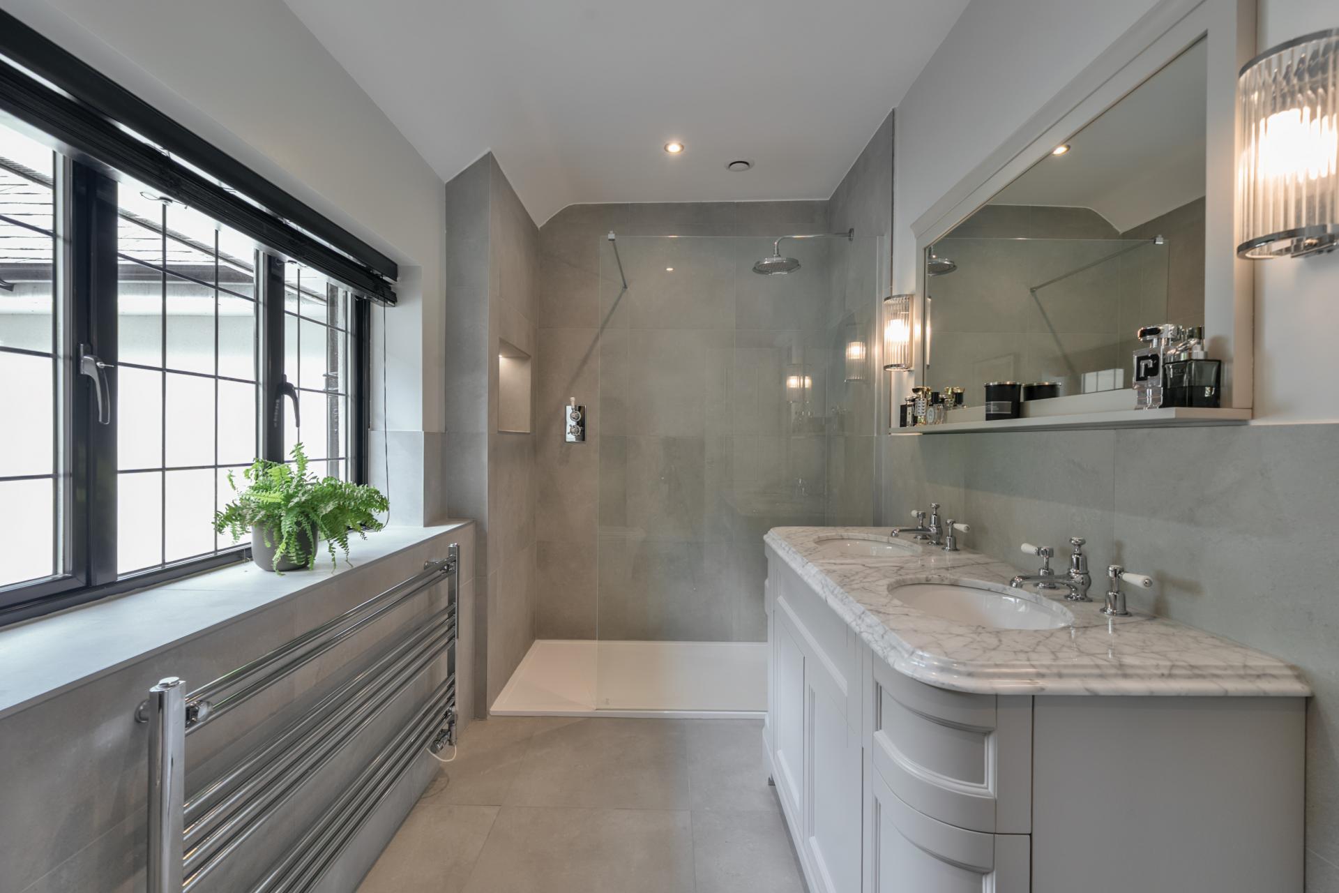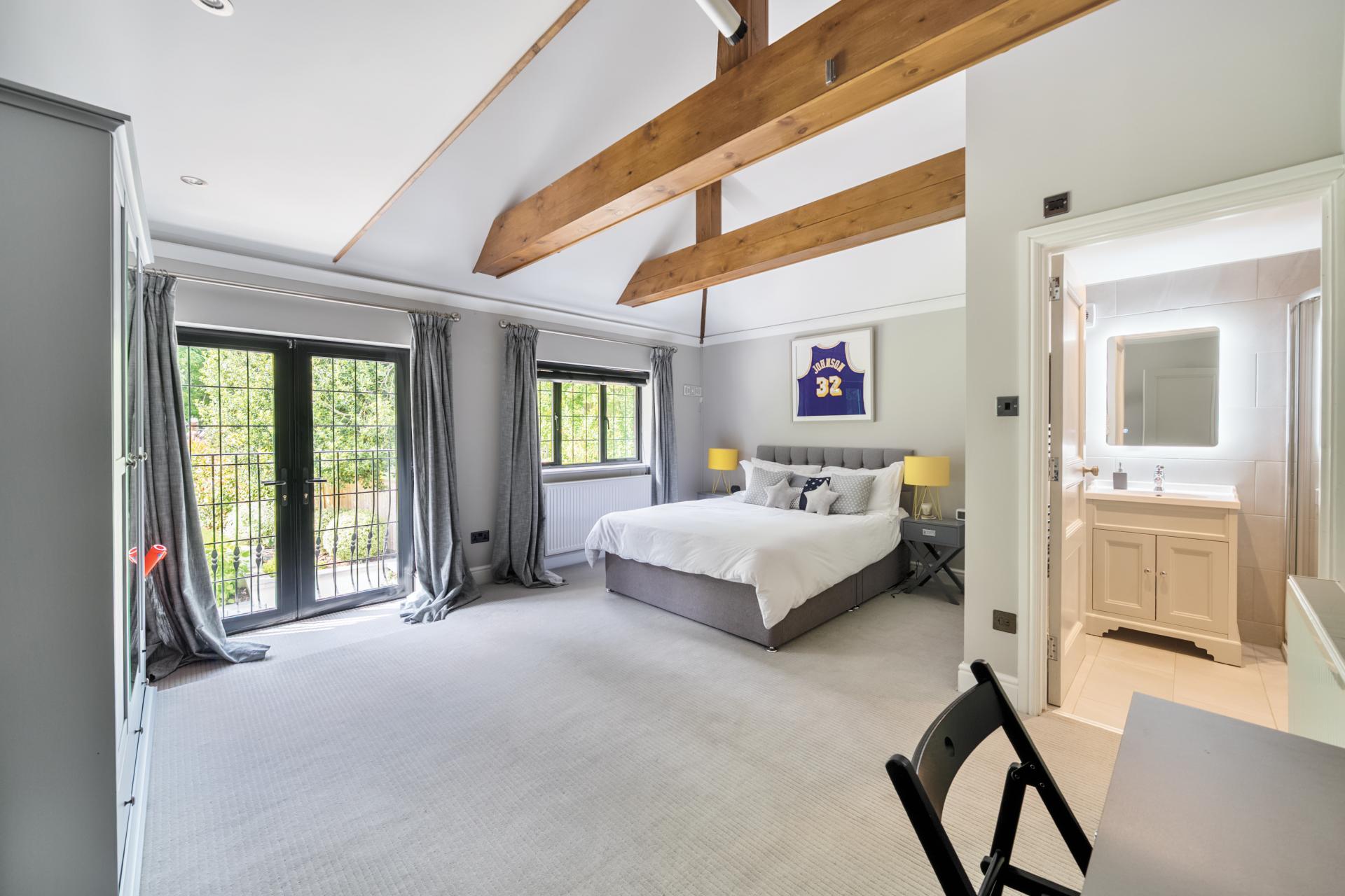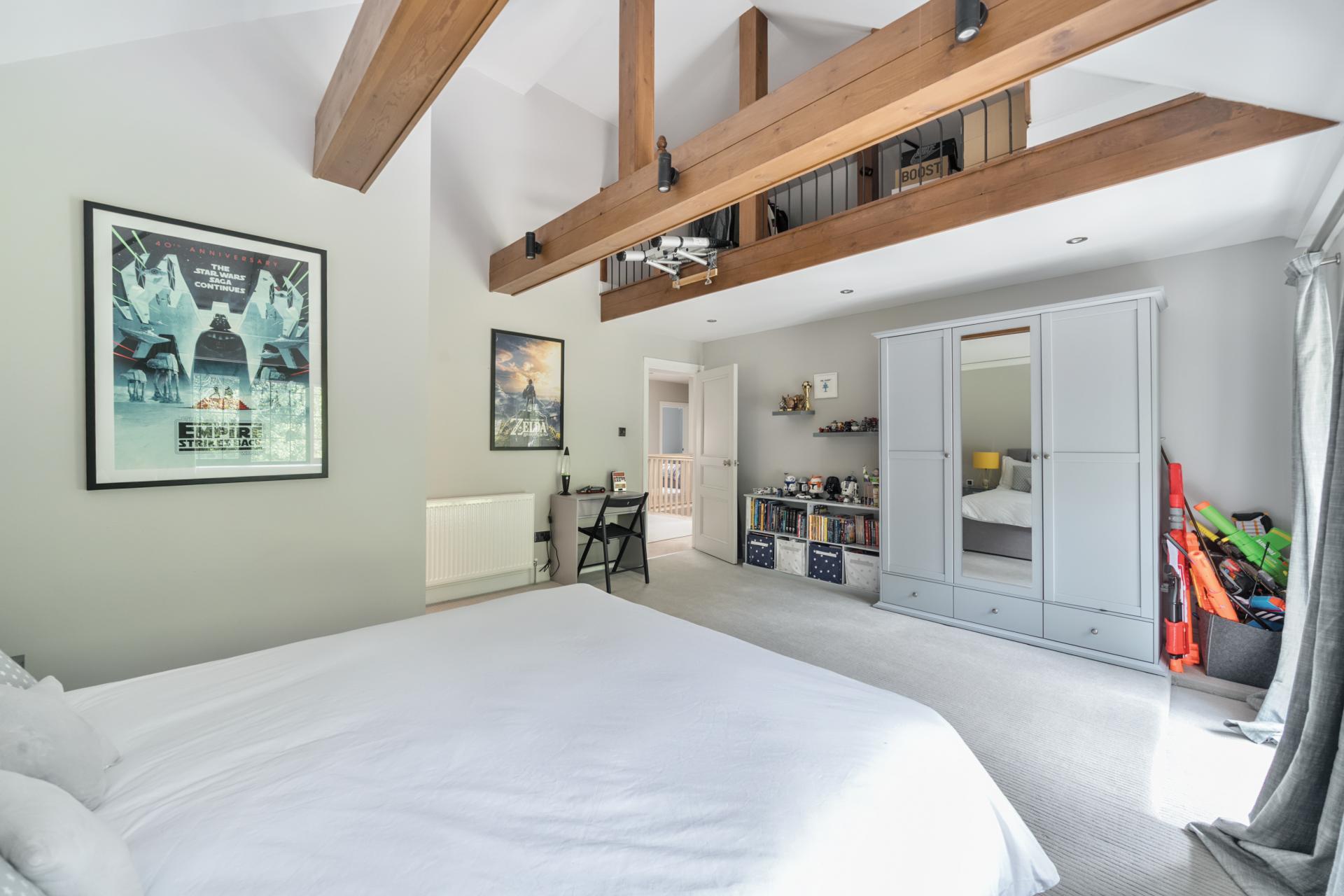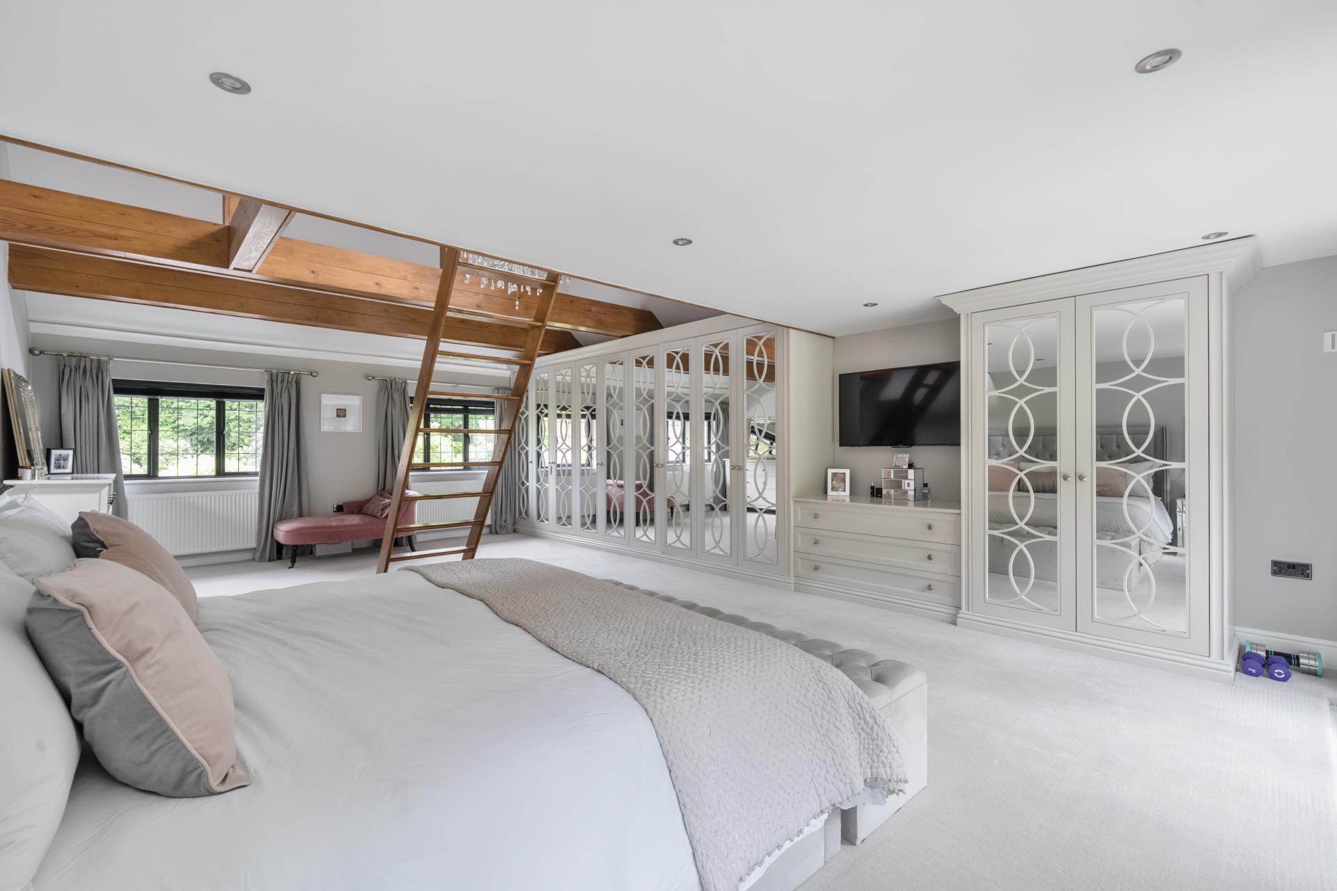 With a solid oak staircase rising to the first floor, the stunning principal bedroom is double aspect with a vaulted ceiling, mezzanine area and skylights. The bedroom also boats fitted wardrobes, designed and fitted by Heritage Wardrobes, a Juliette balcony, an ensuite with Lusso double sink unit and underfloor heating. There are two further double bedrooms with ensuite shower rooms, three further bedrooms serviced by a family bathroom, with bedroom six currently being used as a study.