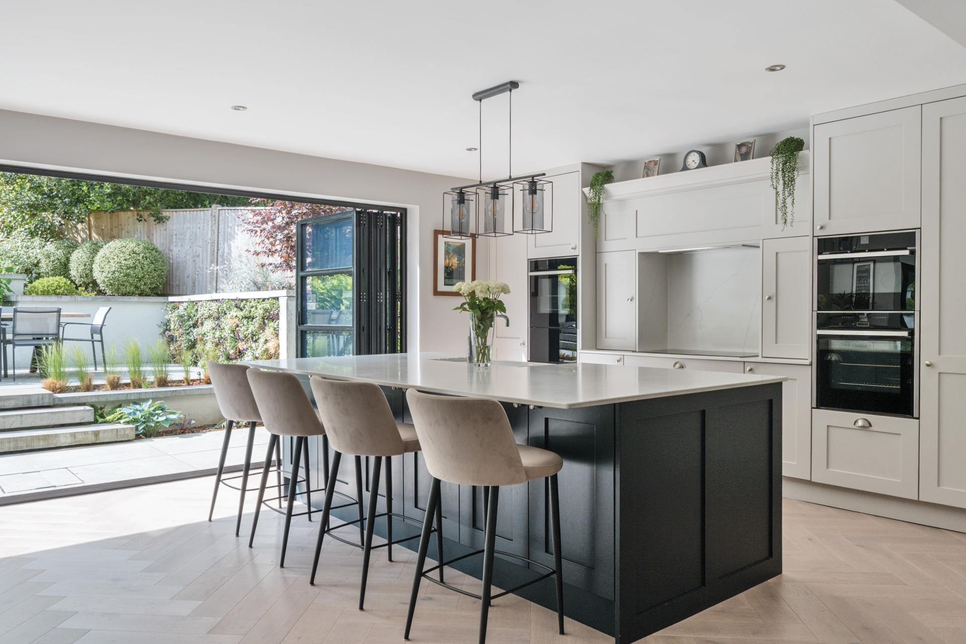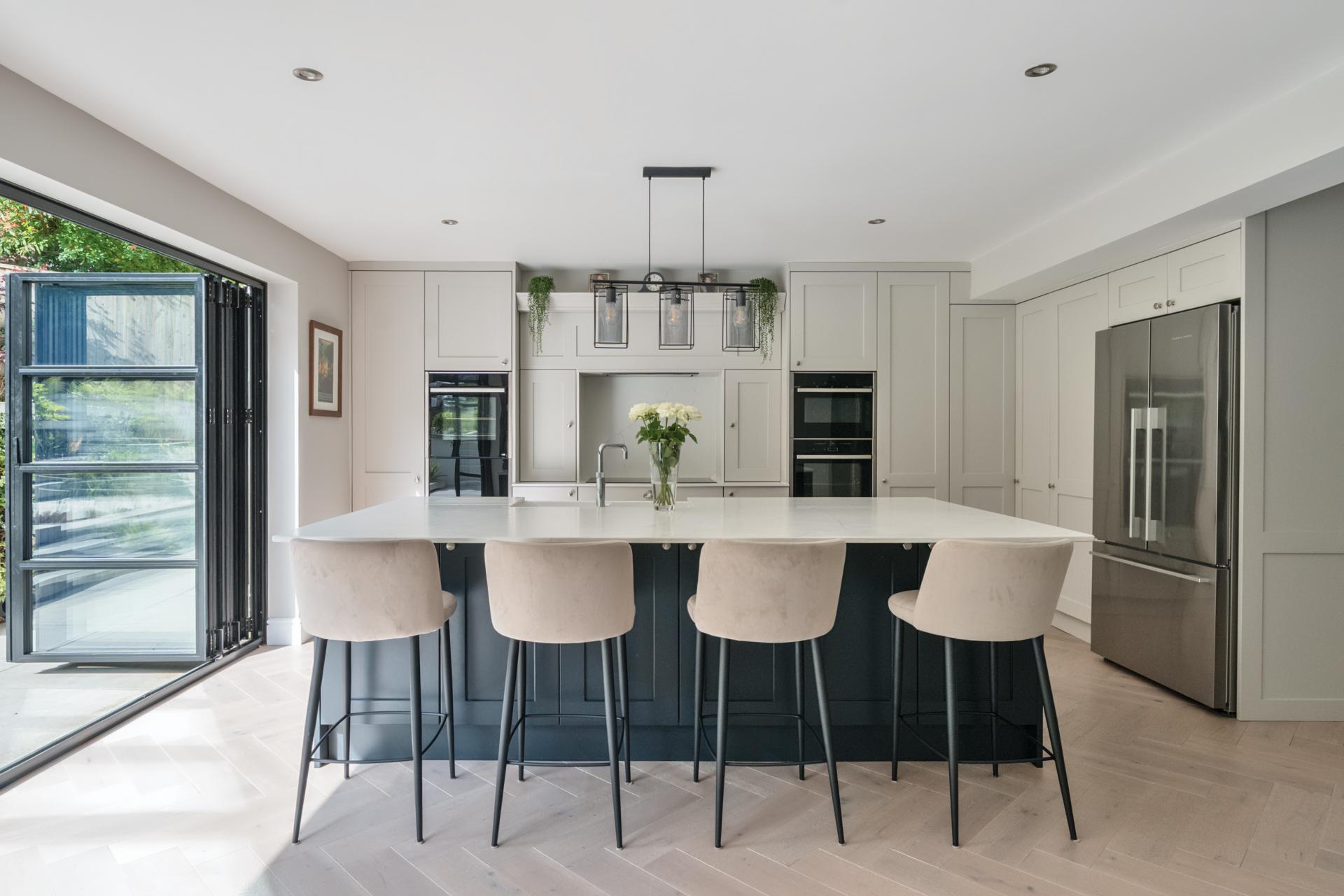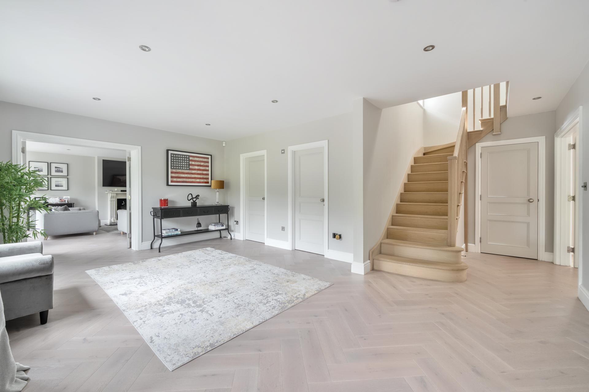 Upon entering, the large reception hall provides access through to the main reception rooms. There is a large drawing room on one side with a woodburner and doors onto the garden. The kitchen/diner/family room is the heart of this home, with 6 metre bi-fold doors opening onto the terrace, which spans the width of the property. The kitchen is fitted with a shaker style units, with Silestone work tops and boasts Neff appliances, Fisher & Paykel Fridge/Freezer and 5 in 1 Quooker tap. The sitting room overlooks the front garden, which in turn leads into a well presented study. In addition, there is a downstairs cloakroom, coat cupboard and utility room. The whole of the ground floor is fitted with underfloor heating and is laid with white engineered oak flooring throughout.