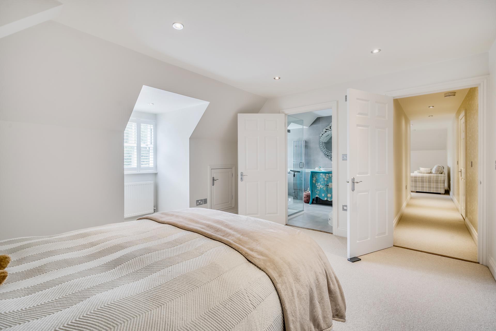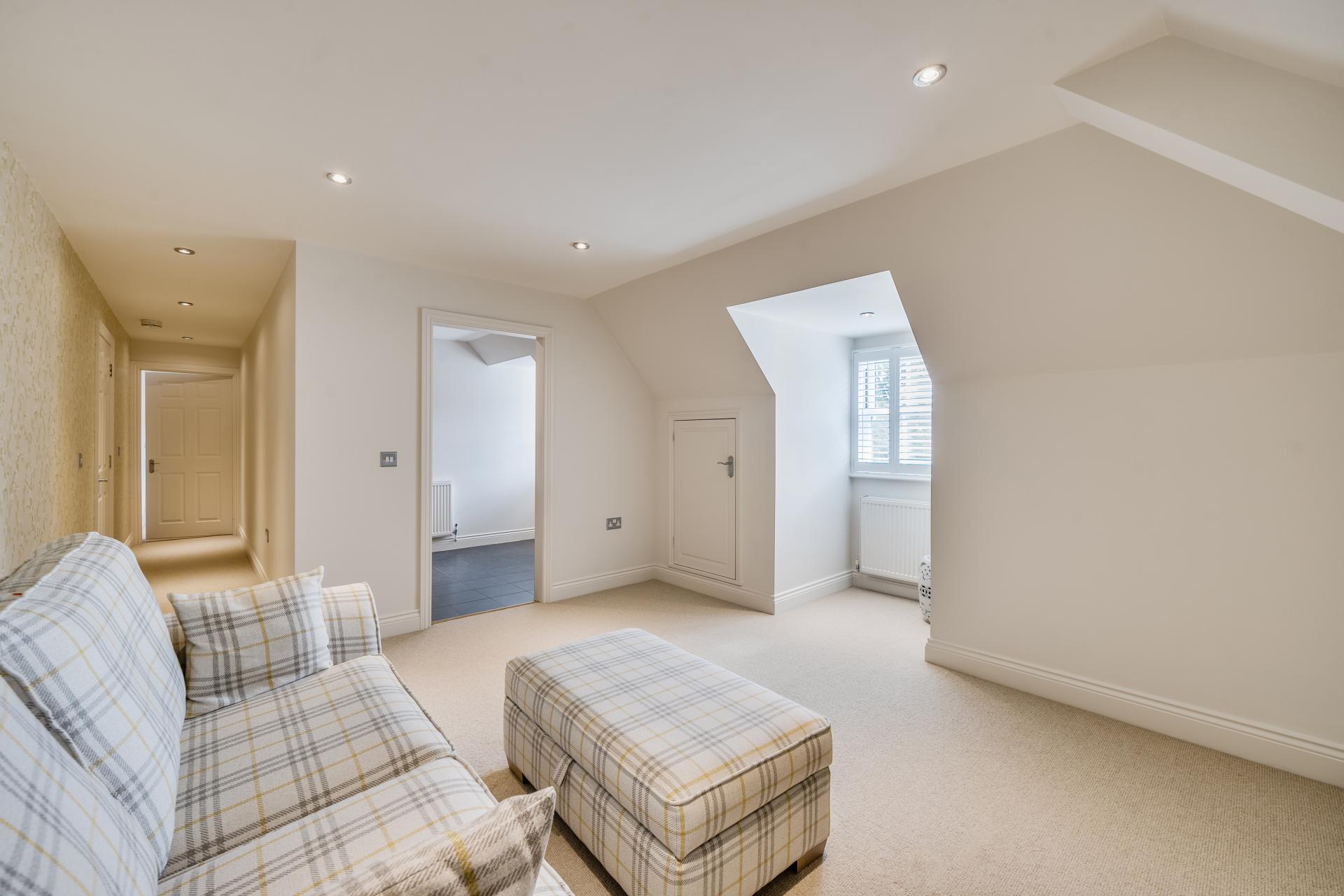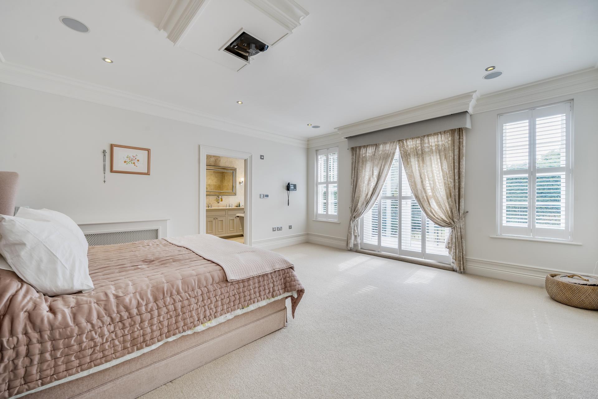 On the first floor a galleried landing leads to the Principal suite with a large walk-in wardrobe, luxury bath/shower room and a south facing balcony overlooking the garden. There are four further double bedrooms each with en-suite facilities, two of which offer walk in wardrobes. The one bedroom apartment is situated on the second floor with a further double bedroom, dressing room, sitting room, kitchen, laundry room and an en-suite bathroom. Outside the property sits in an acre plot with a gated entrance and drive leading to the triple garage and access to level south westerly grounds.