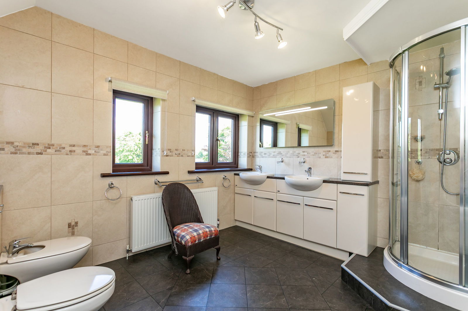 The stairs with oak balustrades rise to the first floor with an attractive half landing and feature window. Off the first floor landing is the bedroom accommodation. The principal bedroom has a wall of joiner made wardrobes and an ensuite shower room. The second double bedroom has a suite of fitted furniture and an attractive architectural feature of three parallel windows. Finally, there is a third double bedroom with a dual aspect, a fourth single bedroom and a family bathroom with bath, shower, twin wash basins, WC, bidet, excellent storage and Amtico flooring. From all the bedrooms the views are particularly fine, being, we are told, “very restful to wake up to.”