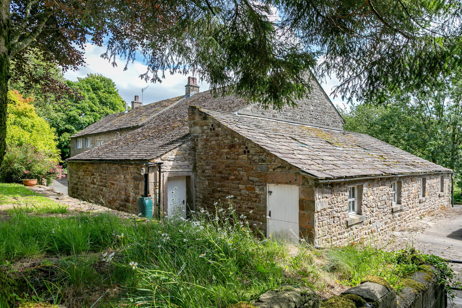 The front garden is accessed through a clematis clad arch, lawned with established trees and shrubs around the edges including greengage, camelia, flowering currants and cherry, a picture of white blossom in spring. A flagged seating area provides a lovely setting for relaxing or eating outdoors. Beyond the front garden is a field, bordered by Warm Beck.