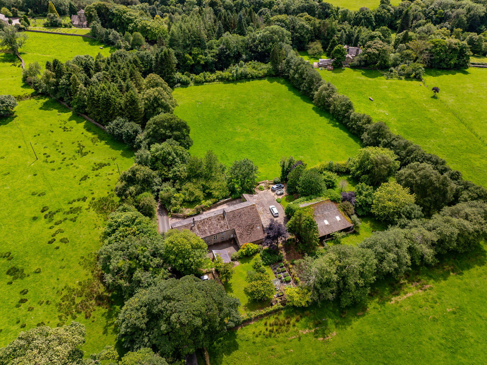 The grounds include gardens, two fields and across the lane, pockets of woodland through which a steam, Warm Beck runs. The garden and fields amount to c.3.5 acres with an c. 1.48 acres additional of woodland, in all, c. 4.98 acres.