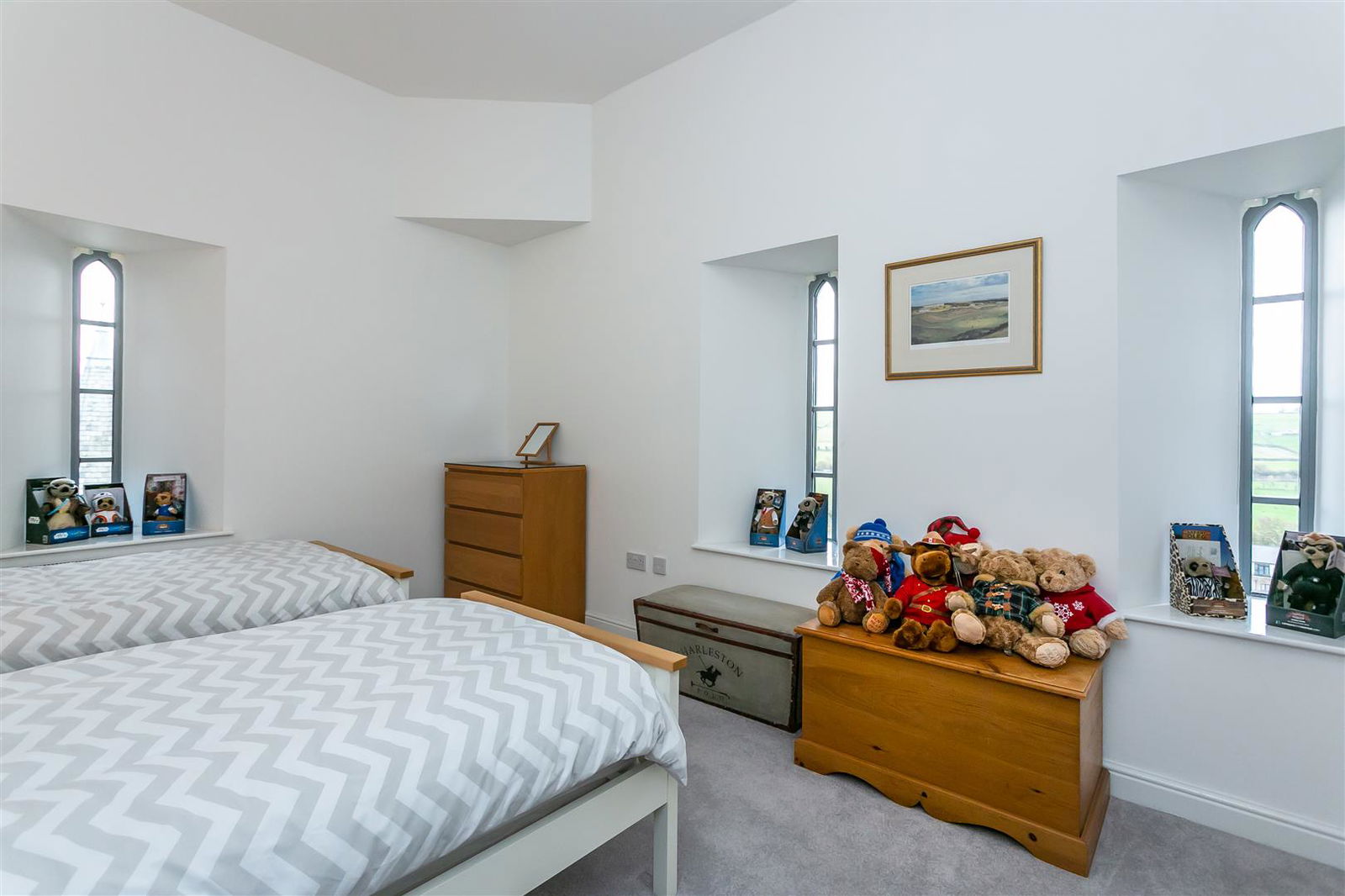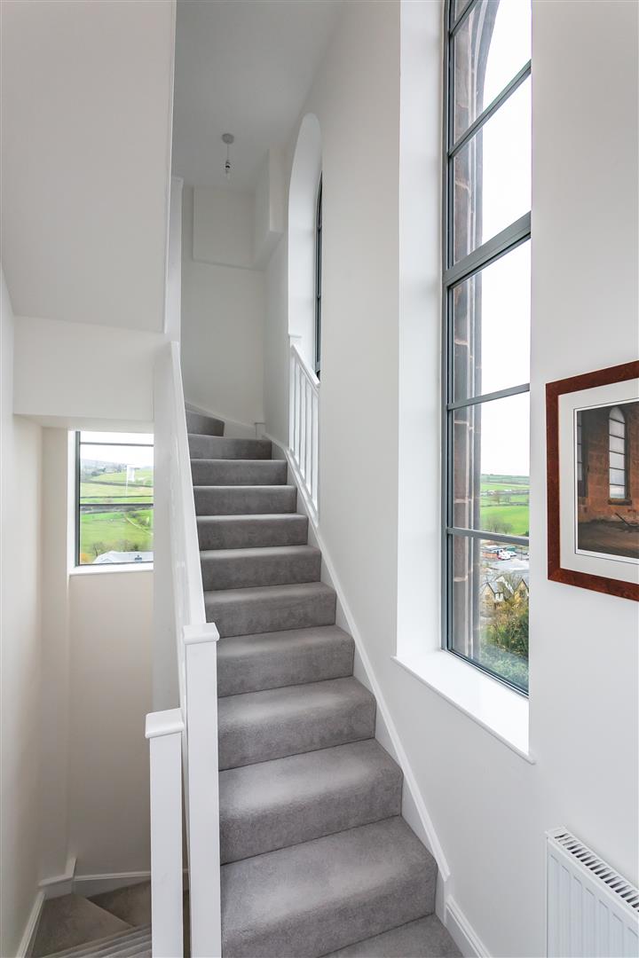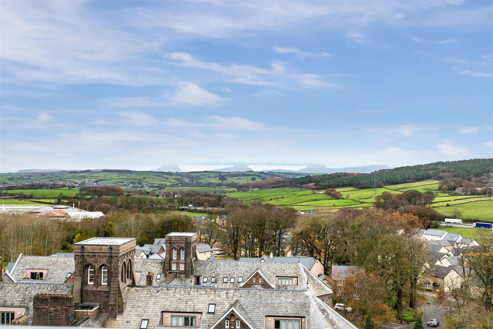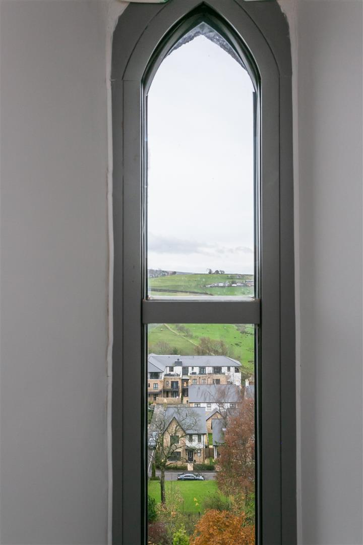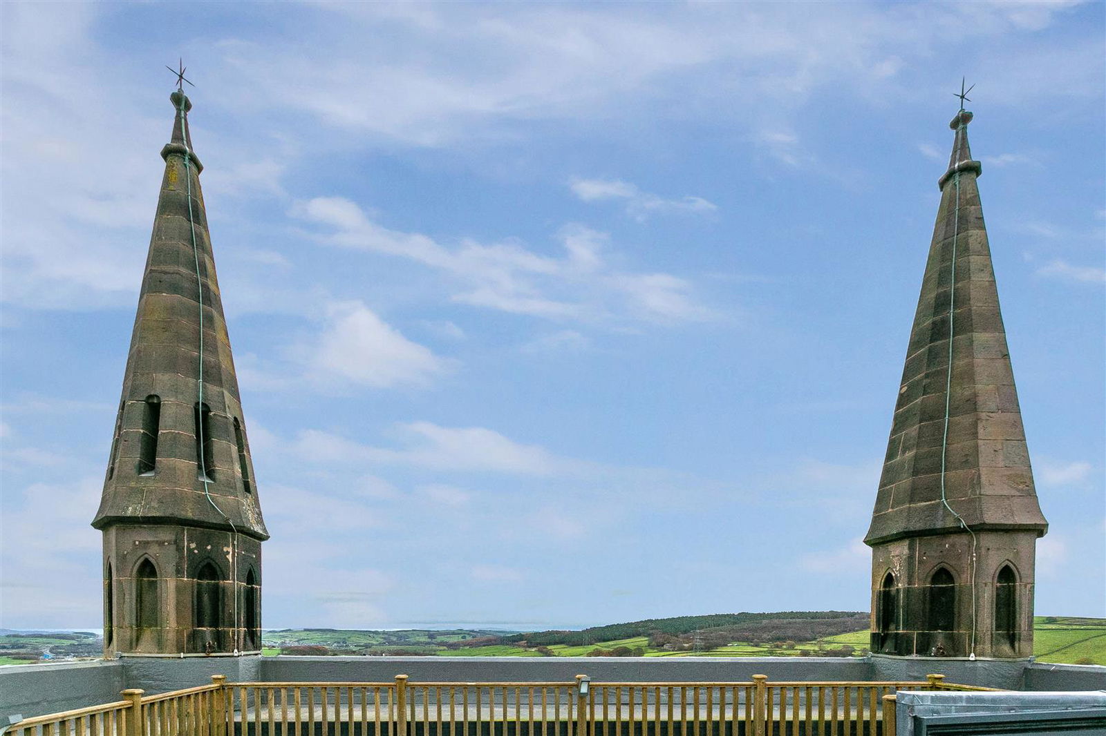 Another generously proportioned reception room that features the instantly recognisable large circular windows of this prominent gothic building. This room has been utilised as the ultimate home office although it is hard to imagine how much work could be completed with such a stunning and ever changing outlook. It therefore includes a large fitted desk and storage units. There is also a WC to this floor. Finally, the stairs continue to a brilliant observatory deck, the impressive roof terrace that is accessed by an electric sliding glazed panel that opens up to reveal this unique open air space. The perfect private haven, it offers 360 degree views out across Lancaster, Morecambe Bay and the surrounding countryside and is not overlooked by any other building. Finished with timber decking, it is a great protected sun trap but the tall walls mean it can also be enjoyed throughout the seasons.