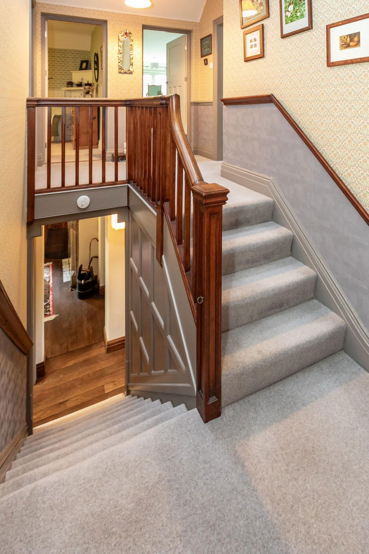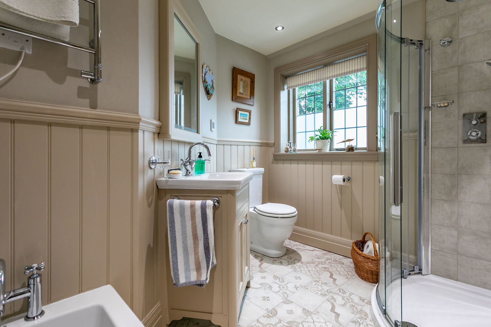 The dining kitchen is a sociable and hospitable room with a space to cook and also eat in the light drenched dining area. The kitchen is attractively fitted with painted cabinets and Silestone worktops and is well equipped for the keen cook. The dining area includes a fitted dresser, made to match the cabinets, flooring throughout is laid with large square Italian ceramic stone look tiles. This continues through into the ancillary domestic offices, a utility room where the cabinets co-ordinate with those in the kitchen for a continuous look, this time with oak worktops. There are two shelved pantries, a door to the rear porch and a part paneled cloakroom with contemporary toilet and vanity unit. The cellar room offers space for storage and has an original fire surround. On the first floor, the principal bedroom is a lovely light room with a cast iron fireplace and a built-in linen store. Fitted wardrobes provide plenty of storage and there is an ensuite shower room with part boarded walls and heritage style appointments complimented by a heated tiled floor, dual fuel heated towel rail and an illuminated mirror. The second bedroom has a delightful bay window, a painted fireplace with Delph tiles, a fitted wardrobe and door to useful eaves storage room. The third and fourth double bedrooms both have painted paneling to dado height, one possesses an unusual corner fireplace with Delph tiles. The fifth small double bedroom is currently being used as a home office with a fitted desk having two workstations. There’s a painted fire surround in here, two shelved alcoves and a deep walk-in cupboard. The family bathroom is similarly appointed to the ensuite but has both a bath and a large rainfall shower.