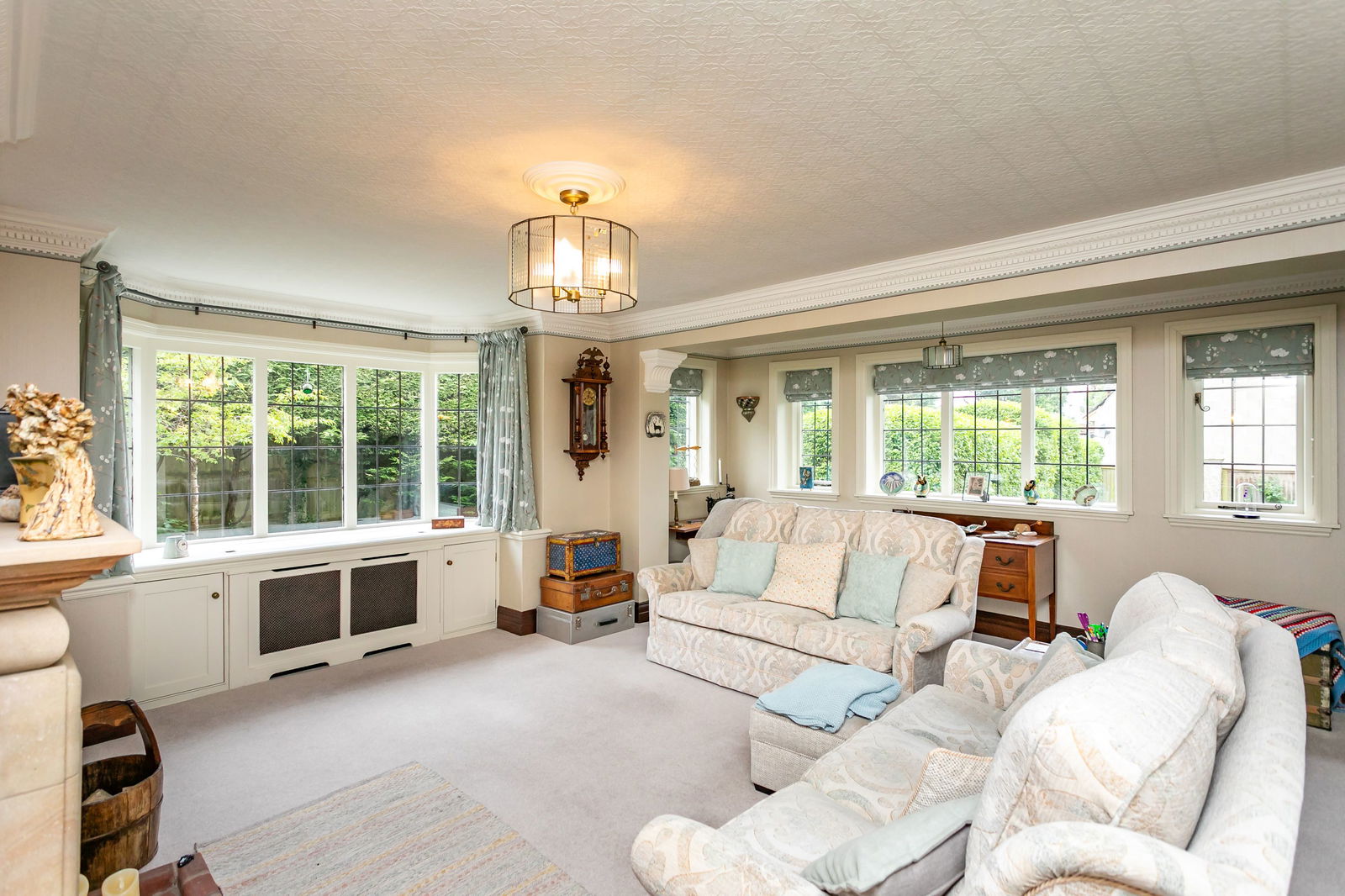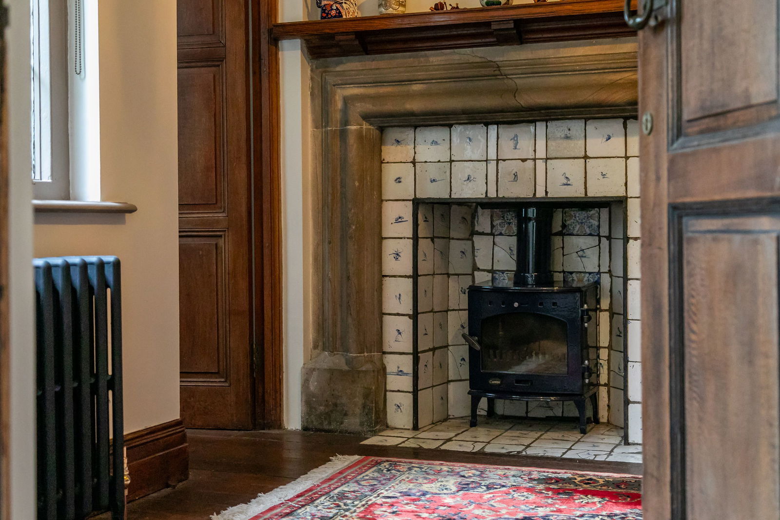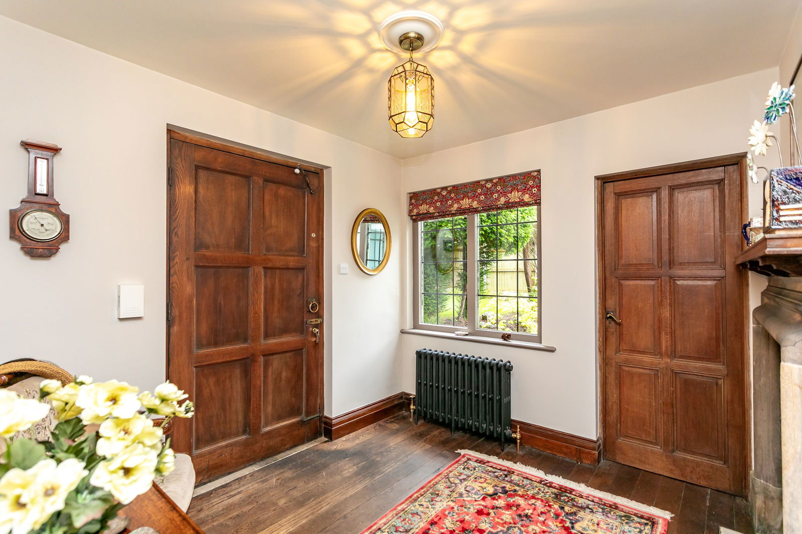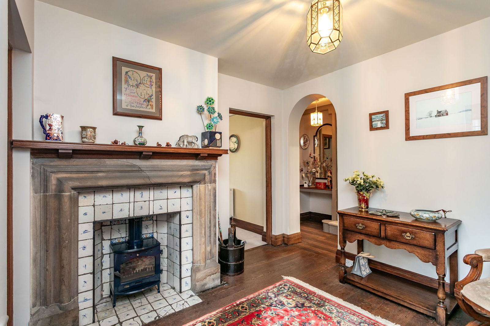 The imposing covered entrance is flagged with the original wide oak front door opening to a delightful and generously proportioned entrance hall with a large sandstone fireplace, Delph tiles and wood burning stove making this a striking focal point. Off is a cloakroom with room to store coats, shoes, boots and the like. The light filled sitting room is an elegant and refined room, the dual aspect provides lovely garden views with a bay window, fitted with a cabinet concealing a pop-up TV. A second sandstone fireplace, this time with an open grate, brick hearth and surround makes a noteworthy feature. When the kitchen was extended to provide room for dining, the formal dining room was repurposed as a snug with two walls of floor to ceiling shelving for books and display. The bay window is an original feature and has sandstone mullions and the original leaded glazed (the rest of the house has double glazing, but this window was retained). The fireplace in here is very similar to the one in the sitting room, a restful room for reading or home working. The morning room has a new oak floor, painted tongue and groove dado boarding, a fitted alcove cupboard and a characterful restored range within a painted surround.