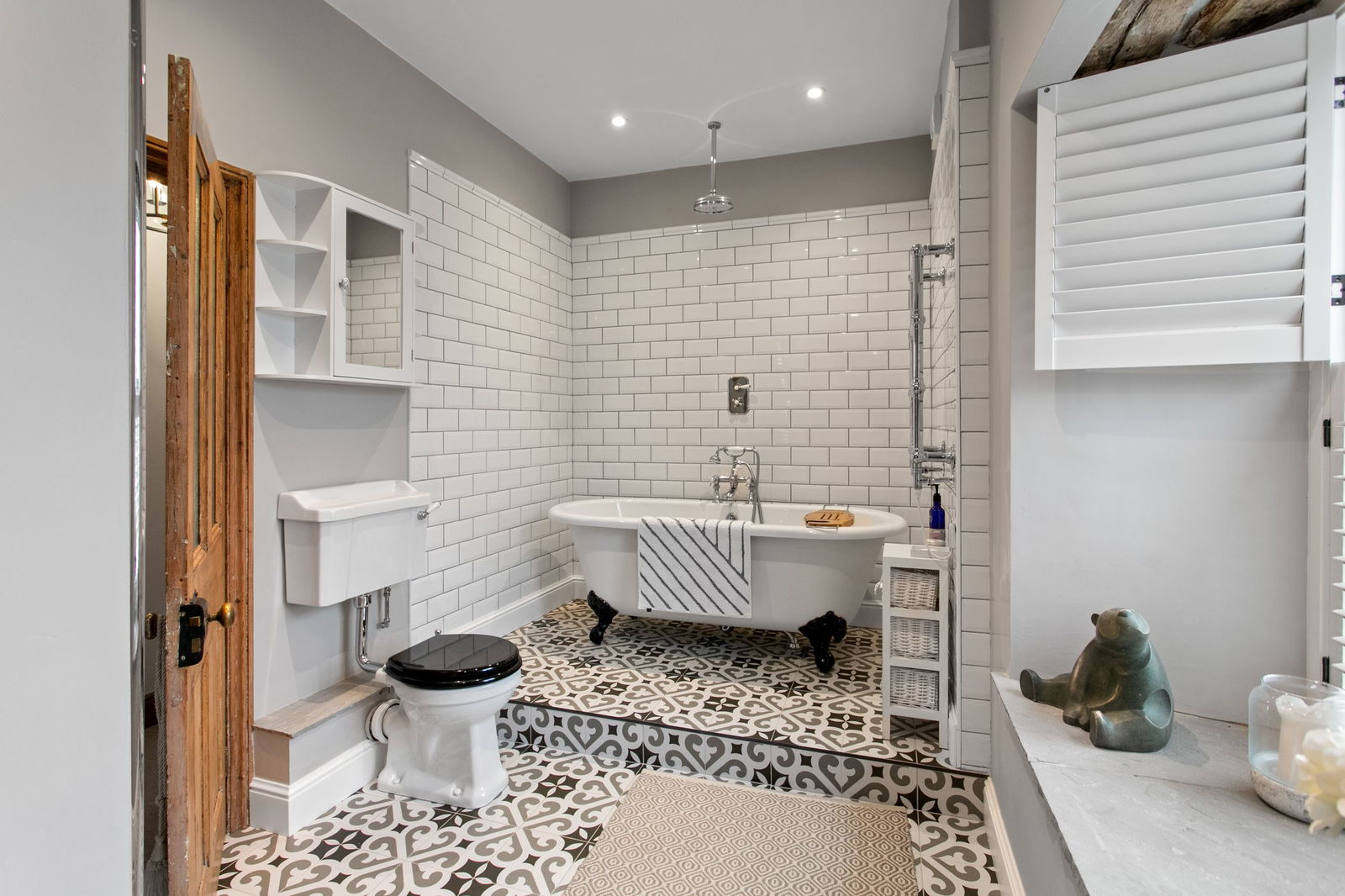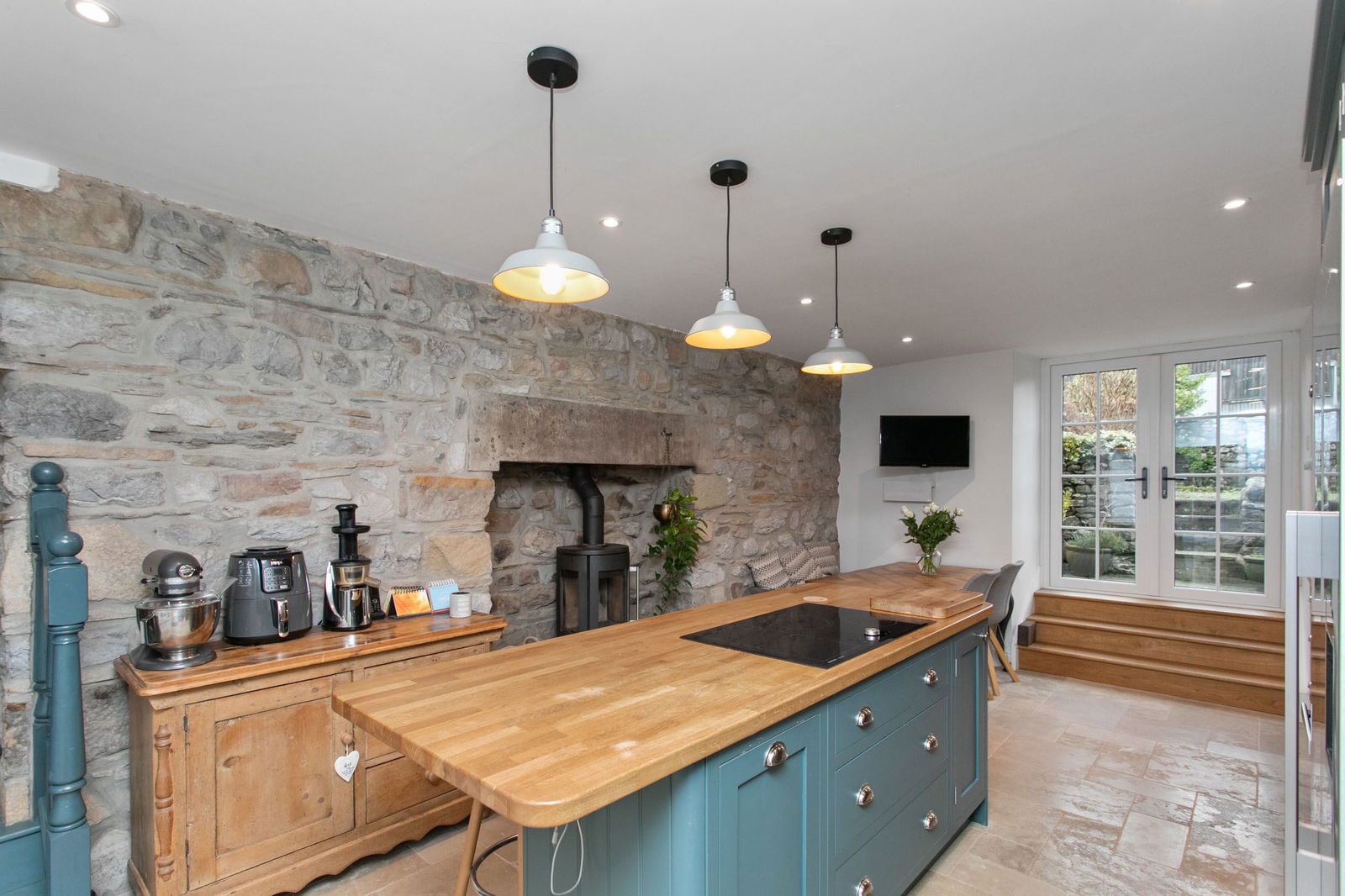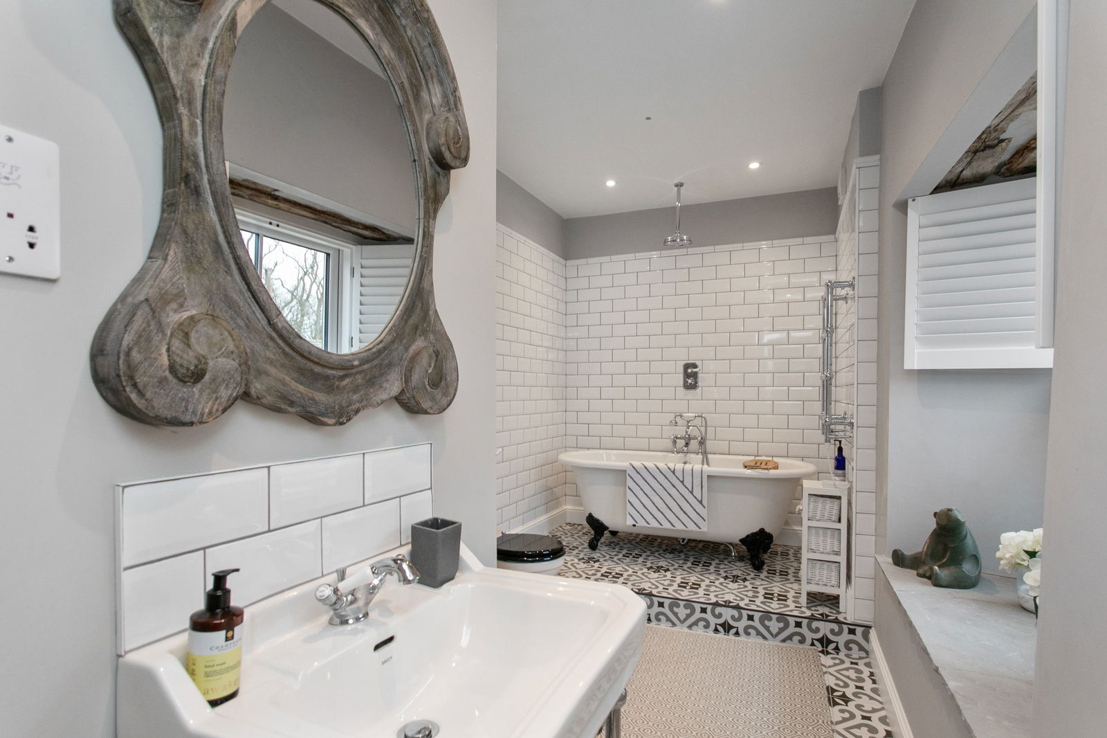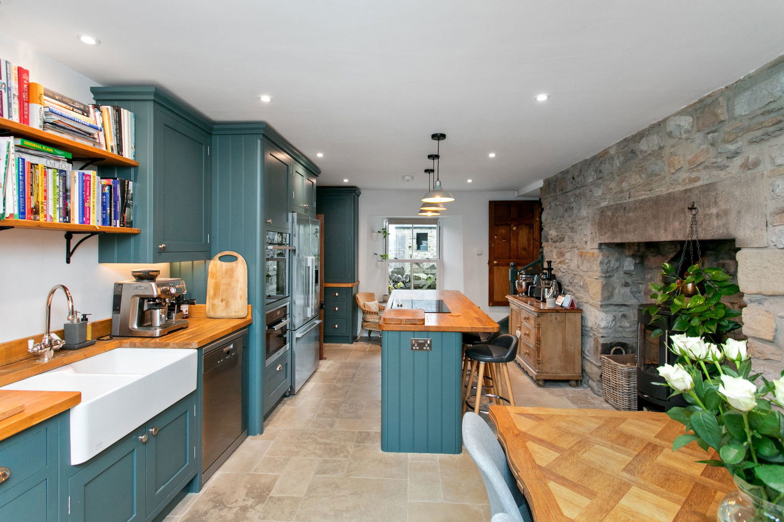 Fixtures and fittings were also replaced. A luxury handcrafted kitchen was installed by local company Lund & Law, built of solid wood and painted in Farrow & Ball’s Inchyra Blue with oak worktops, a larder cupboard and matching island unit. The island extends into a breakfast bar for informal dining leaving room for a dining table next to the French windows leading out to the garden. This is most definitely a room made for both family life and entertaining friends; it includes one of the three wood burning stoves within the house. Supporting the kitchen and approached from a side hall is a practical utility area which encompasses storage space for coats and boots, laundry machines, the boiler and water tank (themselves within a large cupboard, ideal for drying off outdoor gear) and a shower room. The house bathroom has a period aesthetic including a free-standing bath with claw and ball feet and a most attractive wash basin on a stand. The ensuite and ground floor shower rooms both channel a more contemporary look – throughout the house the blend of old and new styles works well as the choice of colour, materials and textures unifies the whole with great success.
