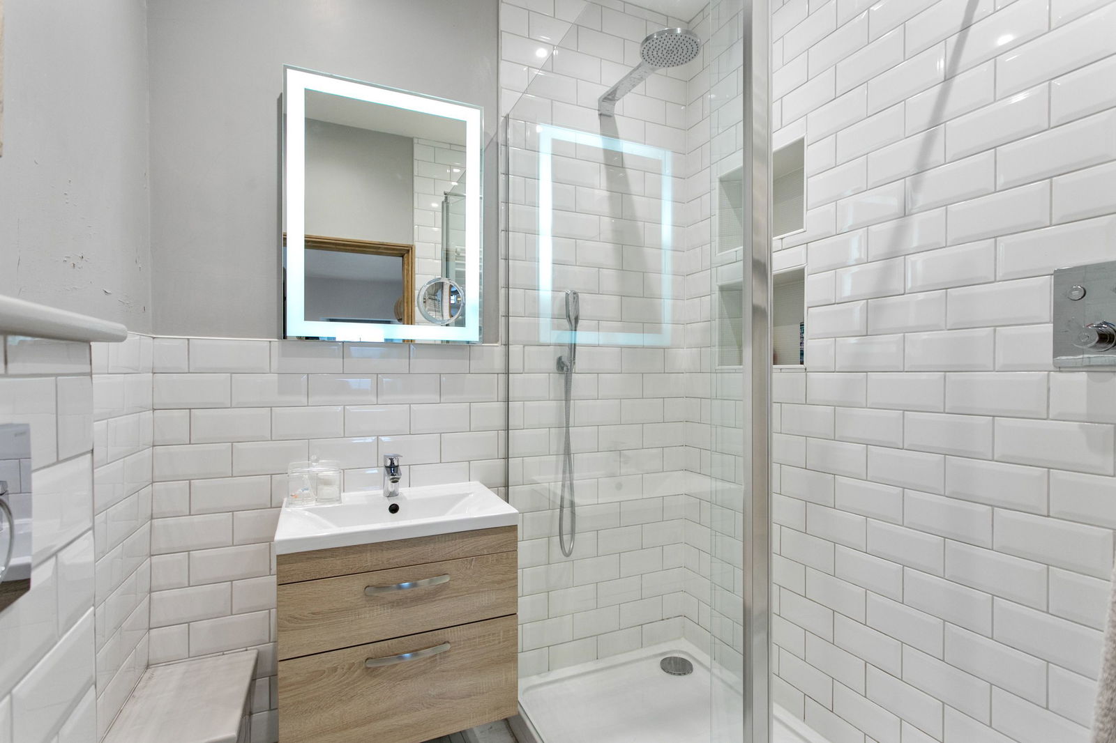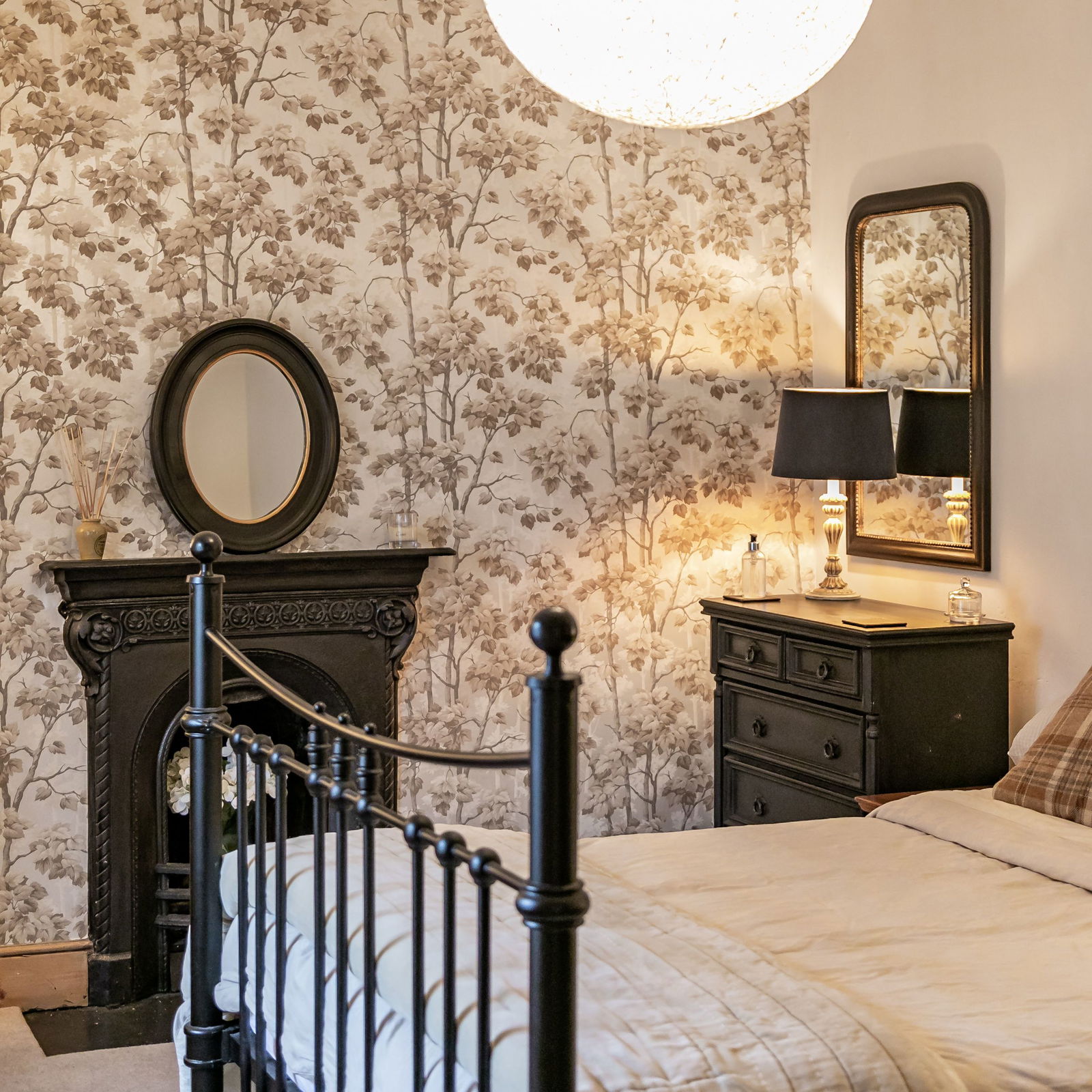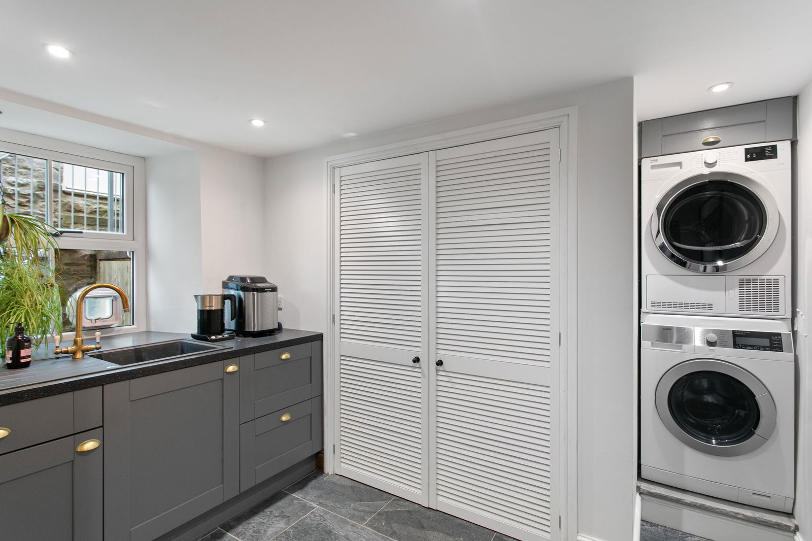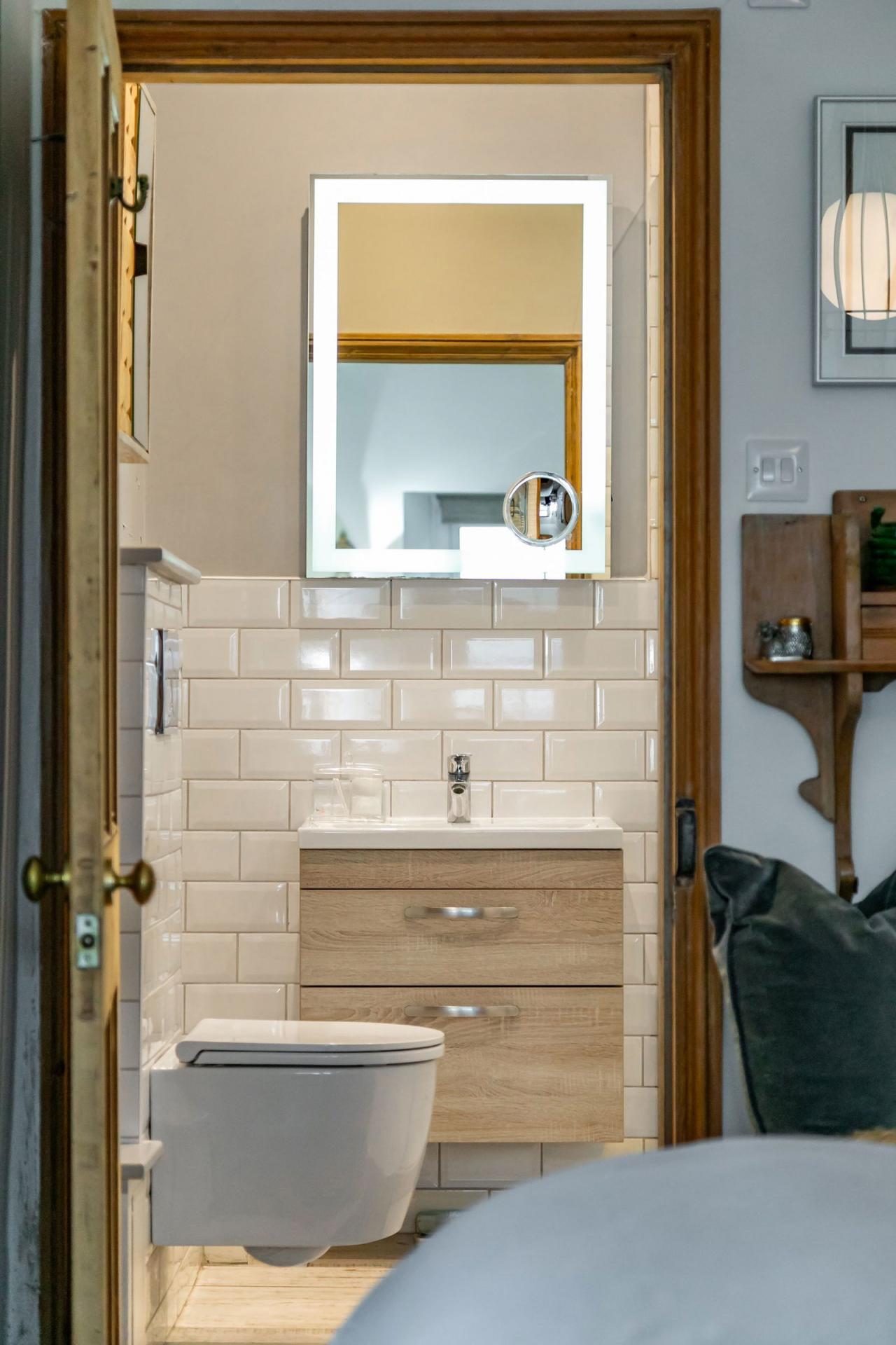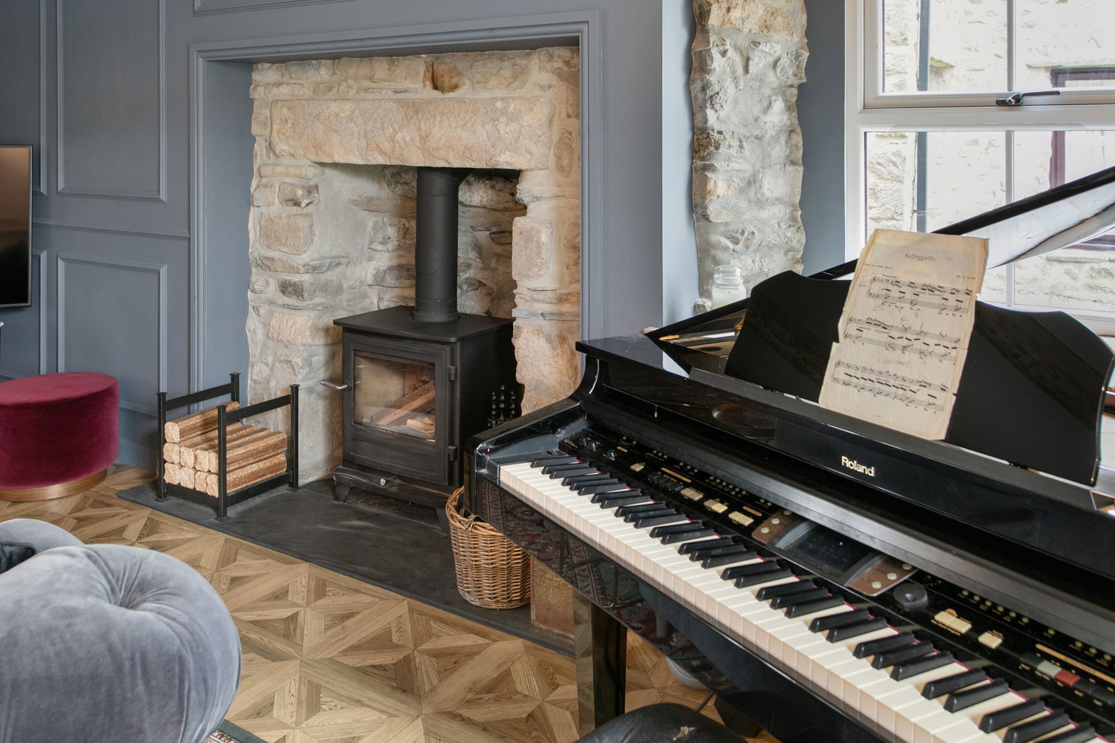 Fixtures and fittings were also replaced. A luxury handcrafted kitchen was installed by local company Lund & Law, built of solid wood and painted in Farrow & Ball’s Inchyra Blue with oak worktops, a larder cupboard and matching island unit. The island extends into a breakfast bar for informal dining leaving room for a dining table next to the French windows leading out to the garden. This is most definitely a room made for both family life and entertaining friends; it includes one of the three wood burning stoves within the house. Supporting the kitchen and approached from a side hall is a practical utility area which encompasses storage space for coats and boots, laundry machines, the boiler and water tank (themselves within a large cupboard, ideal for drying off outdoor gear) and a shower room. The house bathroom has a period aesthetic including a free-standing bath with claw and ball feet and a most attractive wash basin on a stand. The ensuite and ground floor shower rooms both channel a more contemporary look – throughout the house the blend of old and new styles works well as the choice of colour, materials and textures unifies the whole with great success.