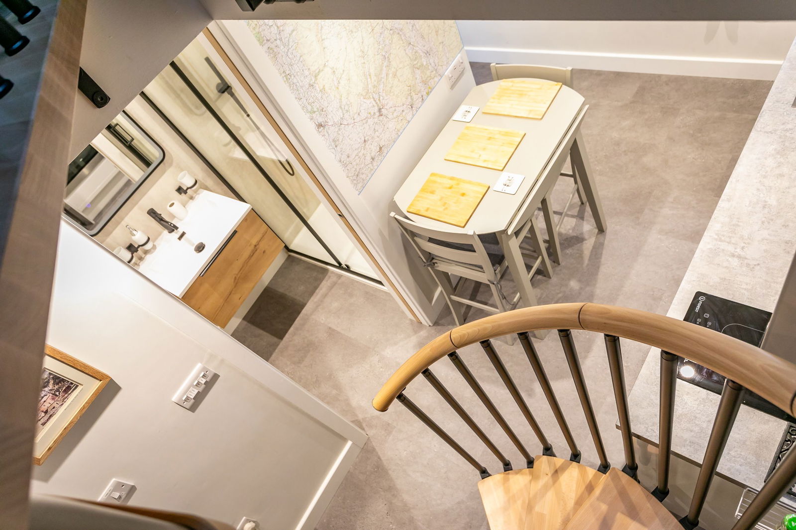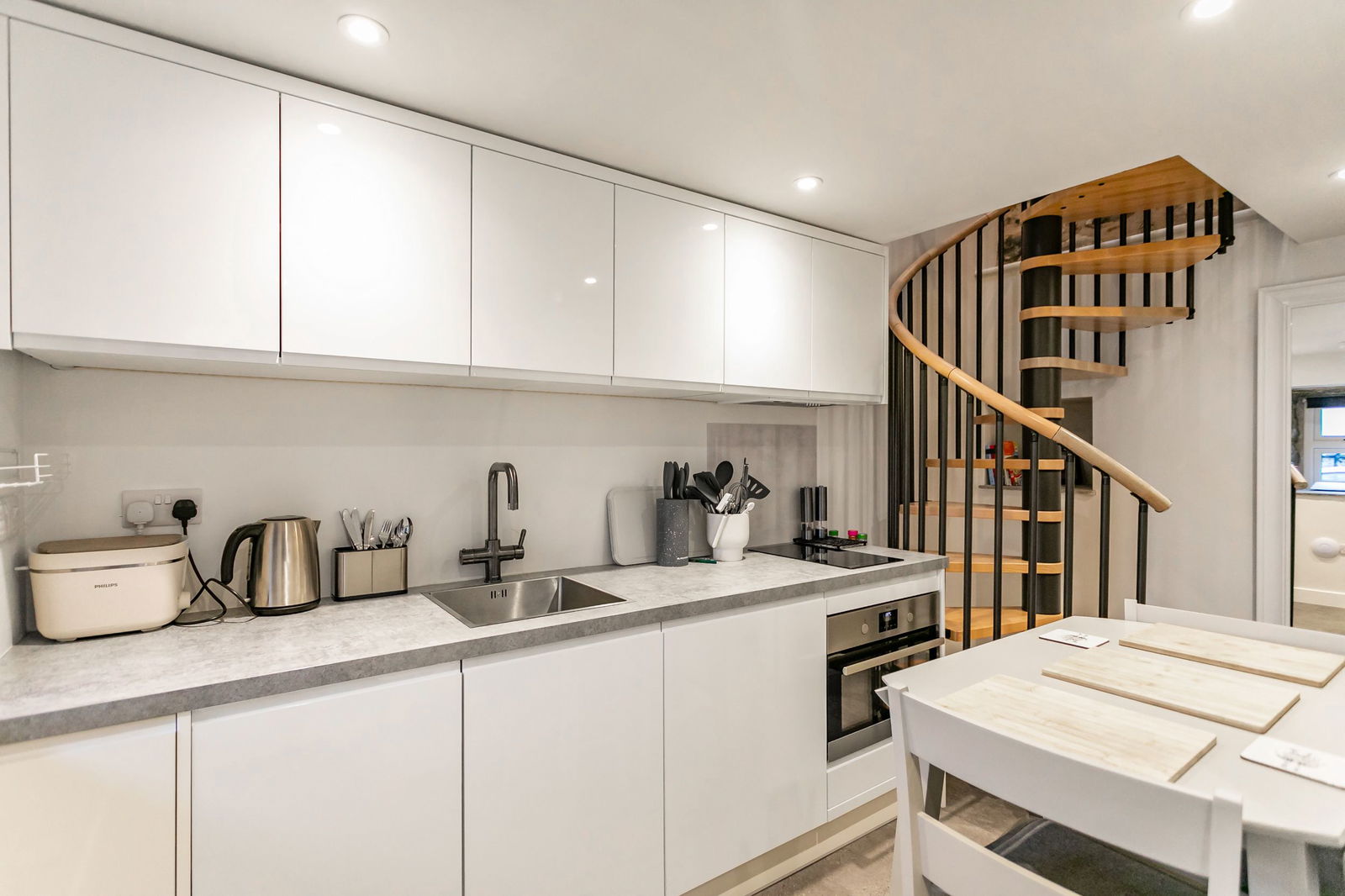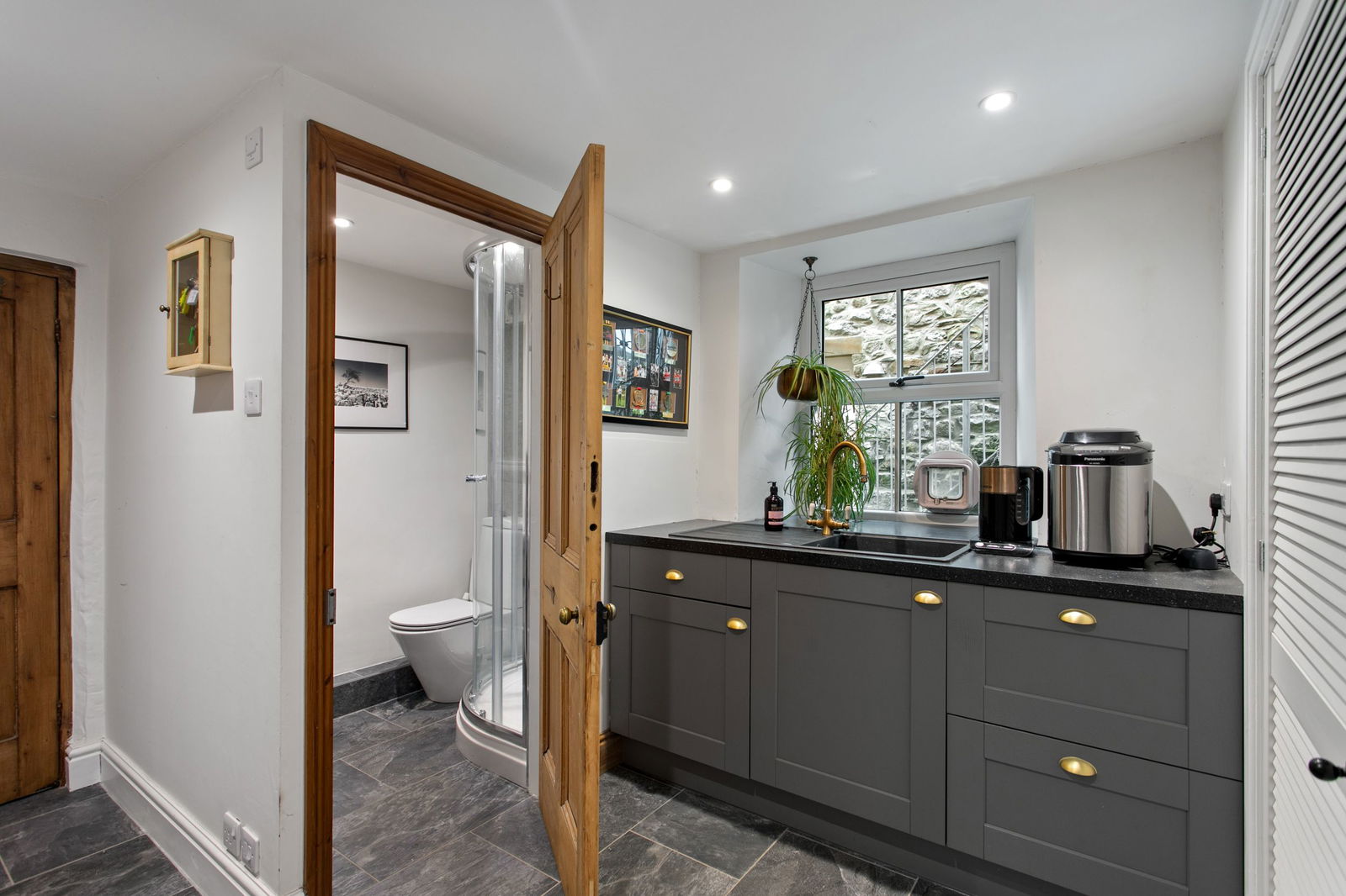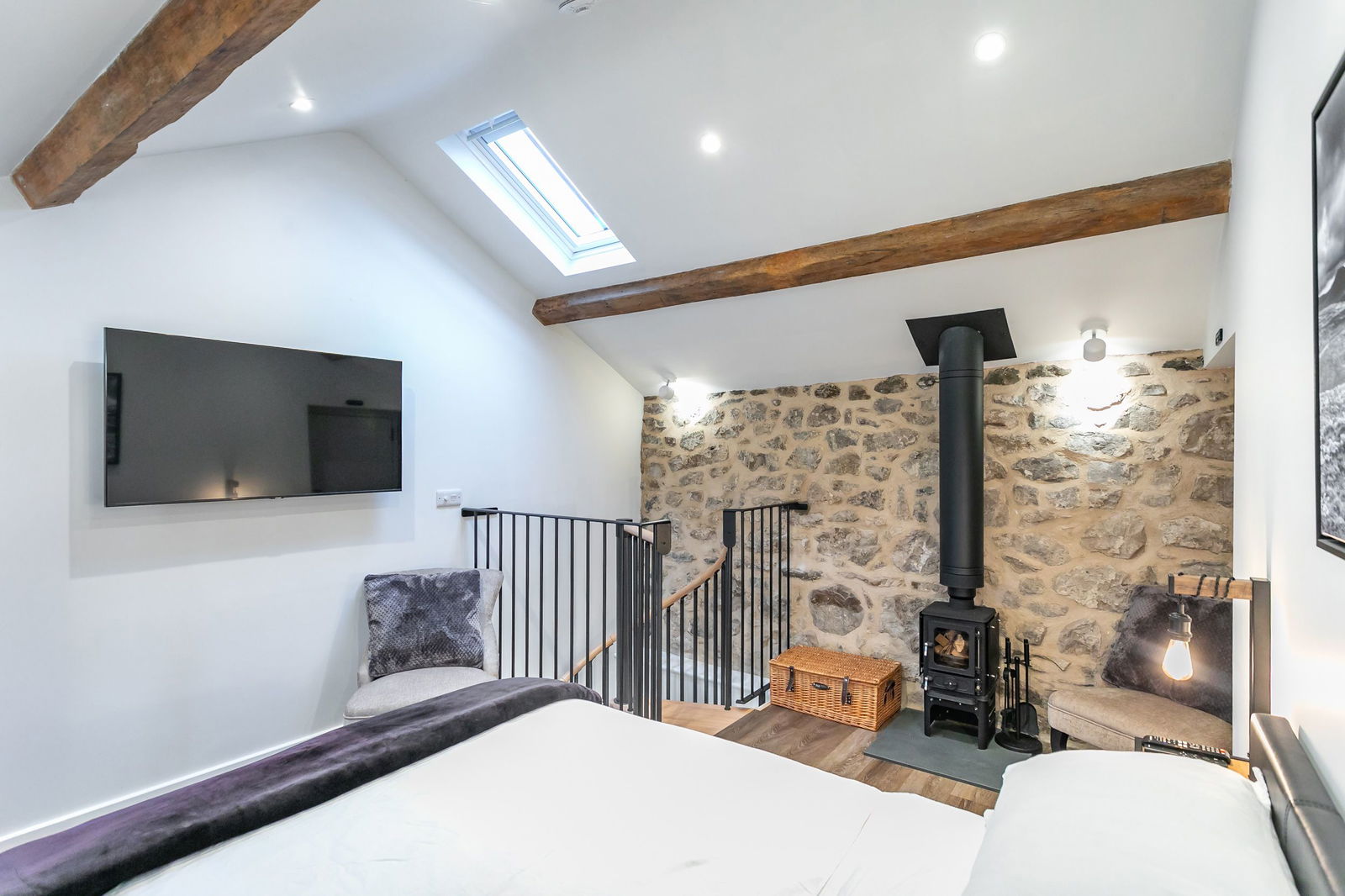Converted from a former barn in 2024, Skylight Retreat is self-contained and perfect for various users; as a guest suite, for dependent family members or as a commercial holiday let as it currently operates. A thoughtful micro-barn conversion, with a dining kitchen on the ground floor as well as a shower room and approached via a spiral set of stairs, a combined bed/sitting room (there’s also an external set of stone steps to the first floor). Absolutely charming it has a ceiling rising to the apex of the roof, a dinky wood burning stove and a panoramic far-reaching view.