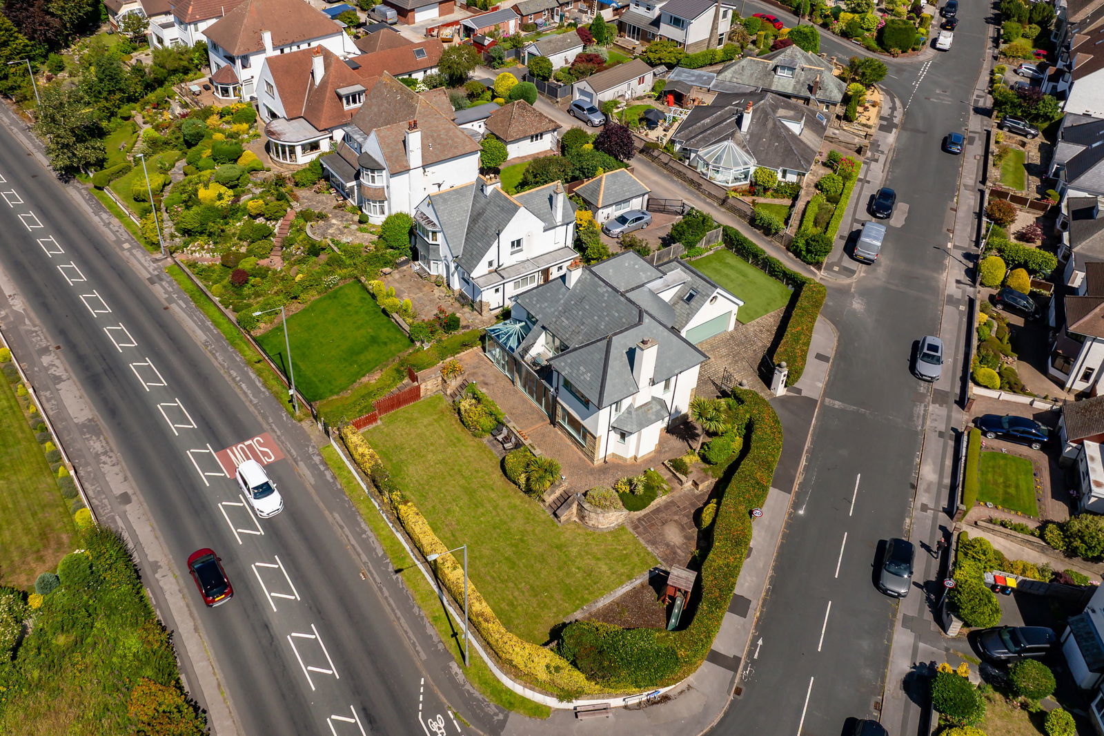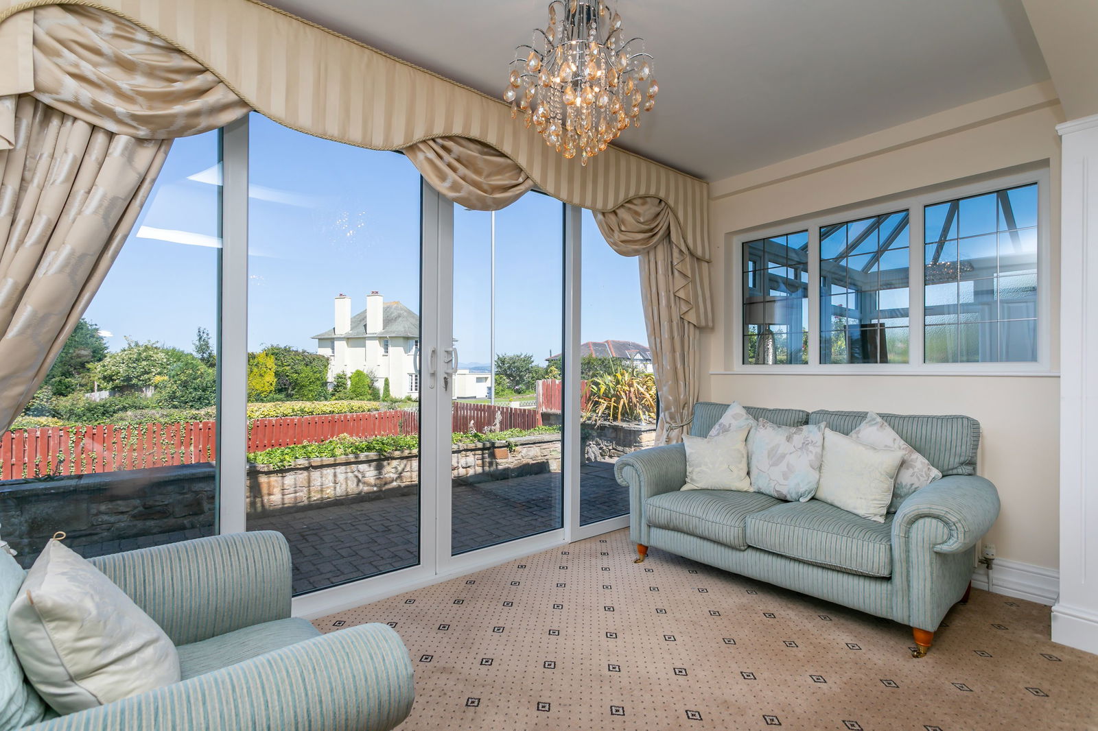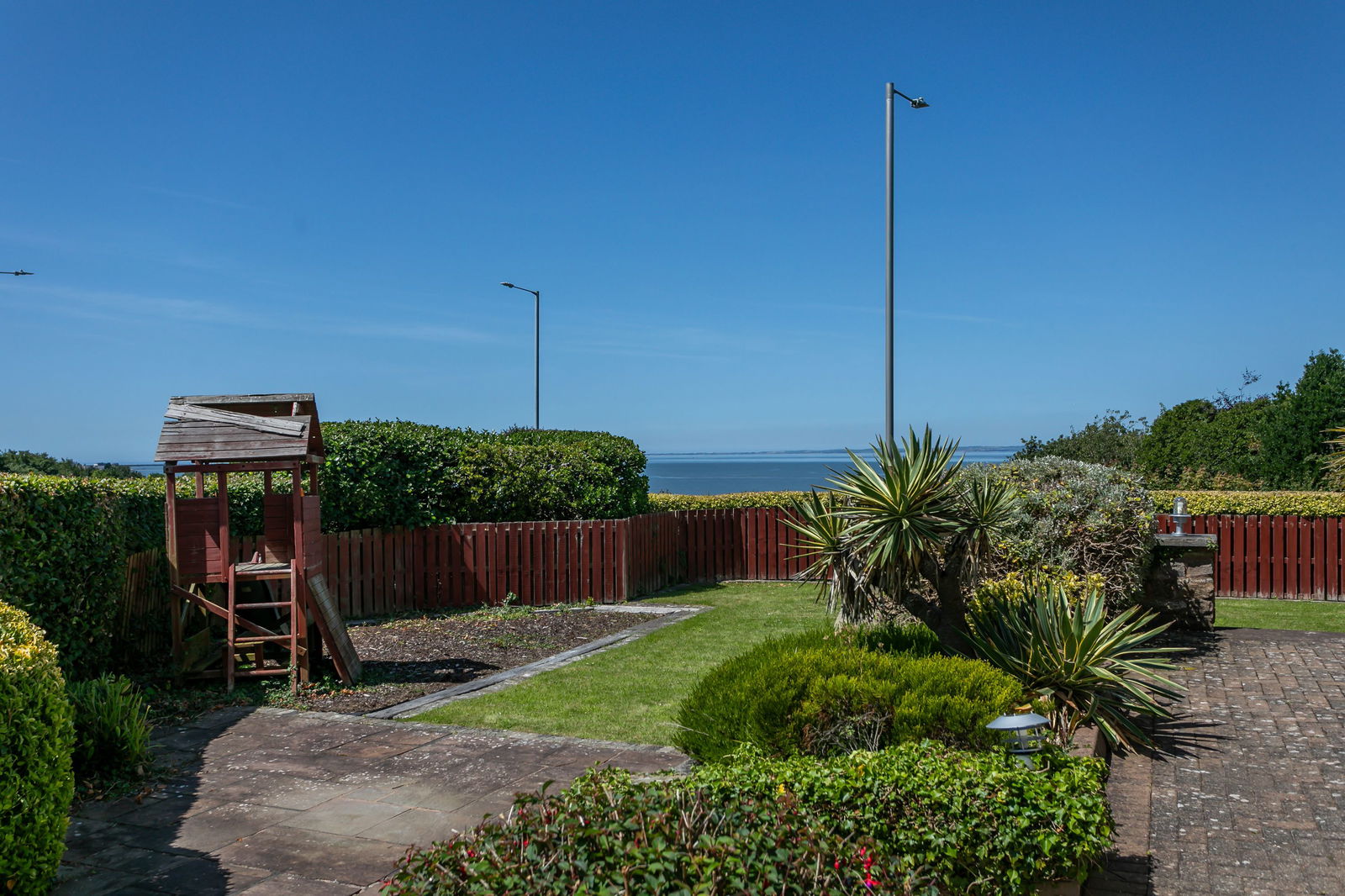 To the front of the property, with an enviable west facing position to make the most of the bay views and fabulous sunsets, is a seating terrace spanning the full width of the property. It’s a generous area with plenty of room to set up a couple of arrangements of garden furniture. From the terrace, five steps lead down to a lower lawn. As a handy shortcut when on foot, there is gated pedestrian access down to Marine Drive.