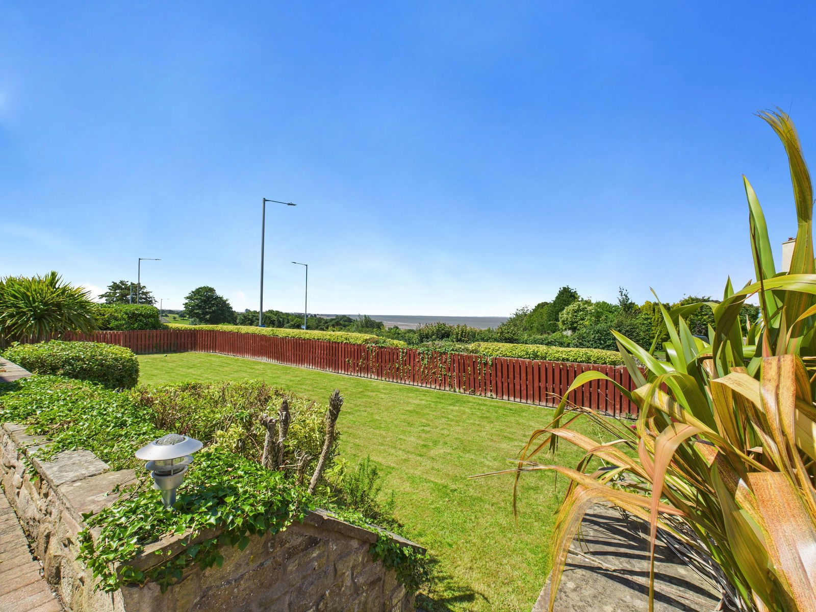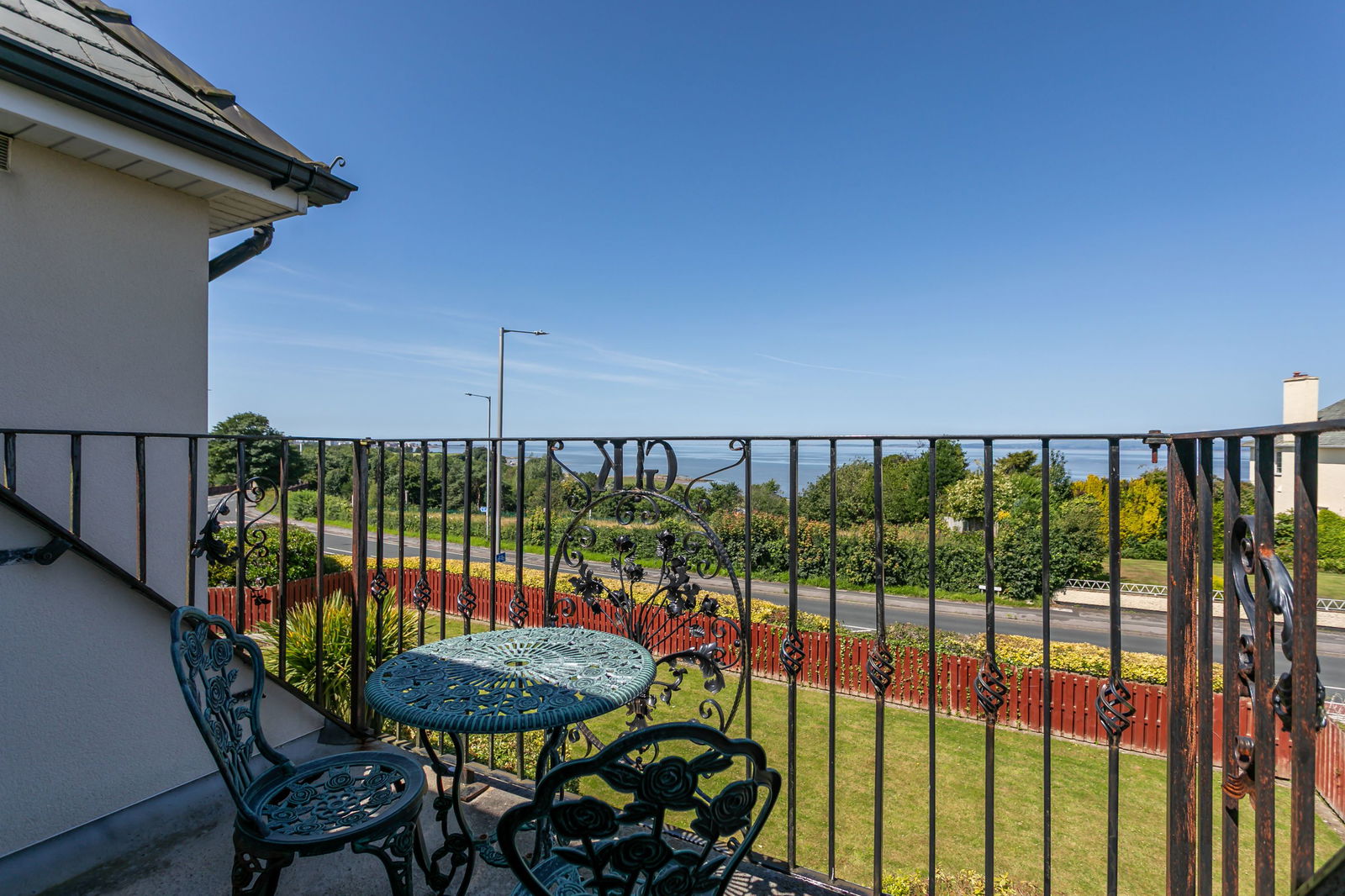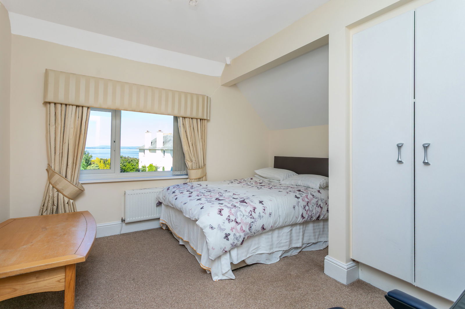 To the front of the property, with an enviable west facing position to make the most of the bay views and fabulous sunsets, is a seating terrace spanning the full width of the property. It’s a generous area with plenty of room to set up a couple of arrangements of garden furniture. From the terrace, five steps lead down to a lower lawn. As a handy shortcut when on foot, there is gated pedestrian access down to Marine Drive.
