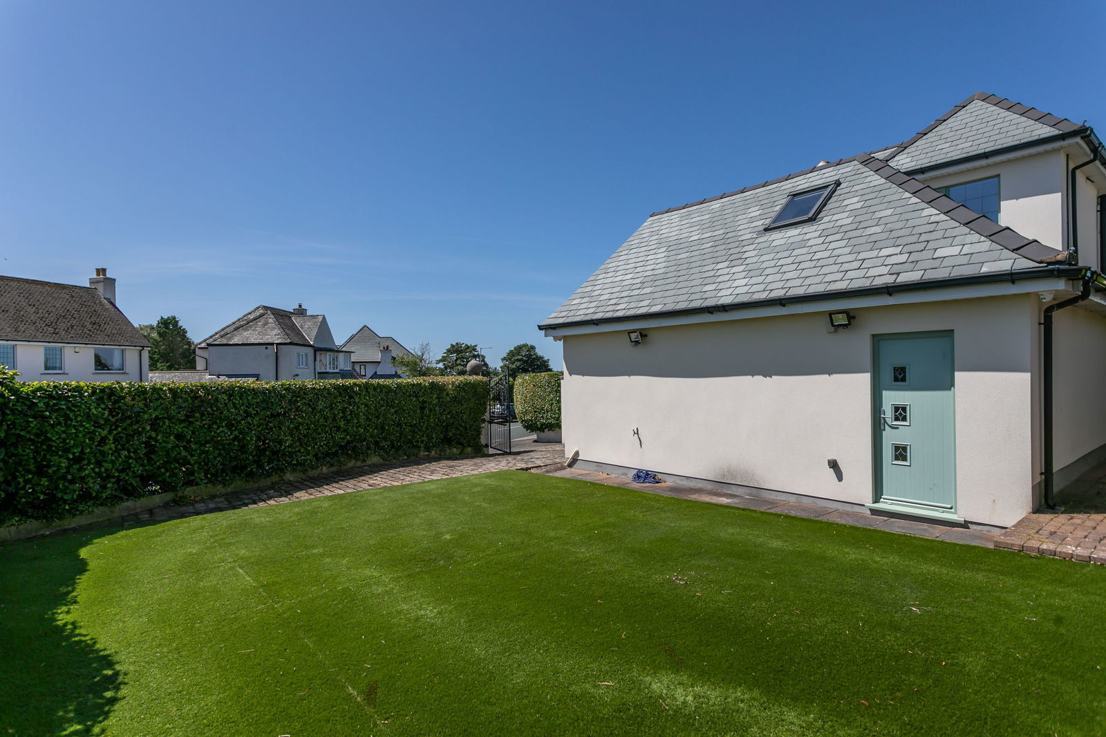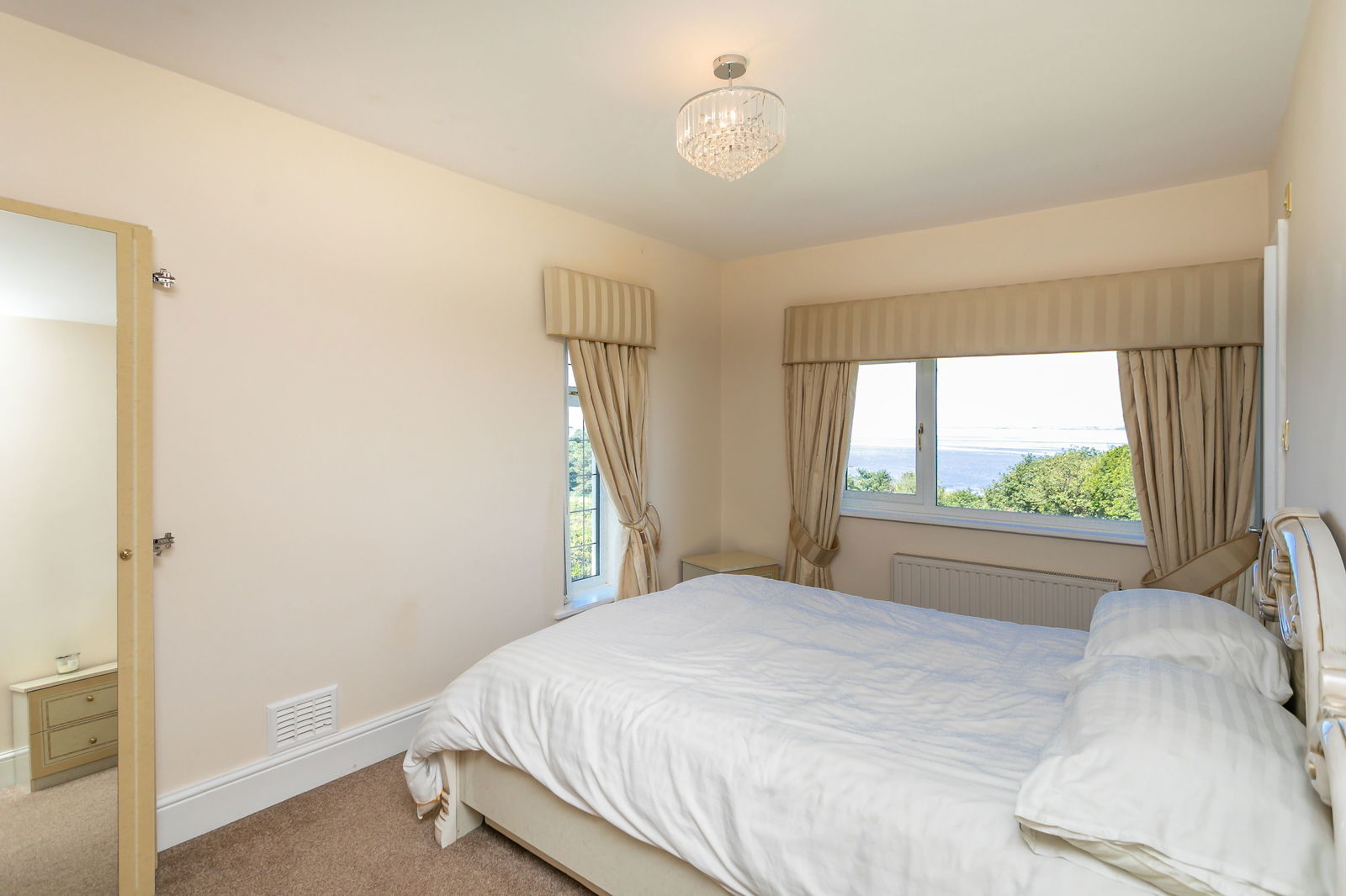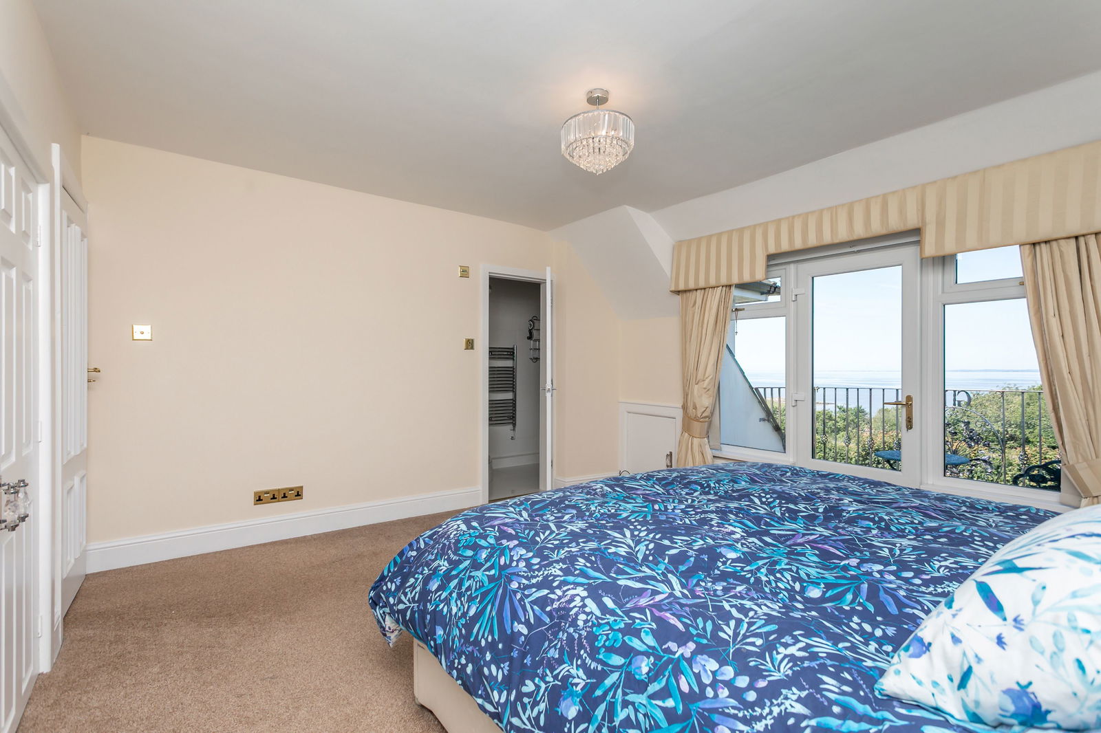 The first floor landing is spacious, the principal bedroom has fabulous bay views to wake up to and a private balcony on which to sit and enjoy them. There are built in wardrobes and a fully tiled ensuite shower room with shower, vanity unit and WC. The second double bedroom also has the same excellent view with an ensuite cloakroom of wash basin and WC. There are two further double bedrooms, one has a bay view and deep built in wardrobe, the other looks east and enjoys the morning sun and has both fitted wardrobes and a dressing table. There is an additional small room, fitted with wardrobe, dressing table and shelving. It would make a delightful nursery, dressing room or home office. Built over the garage is a fifth double bedroom or possibly a games room or den. With a vaulted ceiling built into the apex of the room with under eaves storage space, two Velux skylights and a feature round window. Finally, there is an impressive and glamorous house bathroom with striking high gloss marble look tiling. Spacious and beautifully fitted, this is a stylish addition to the house and has a luxurious double ended bath from which to watch the