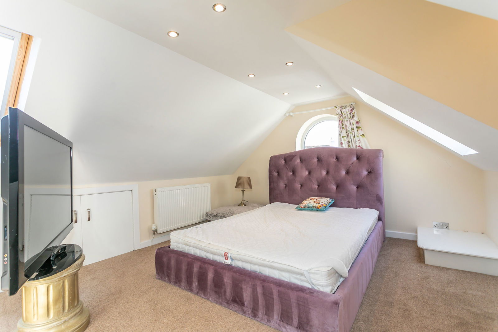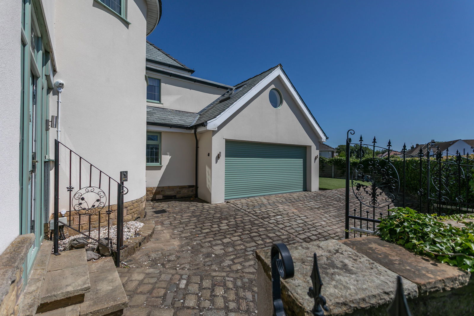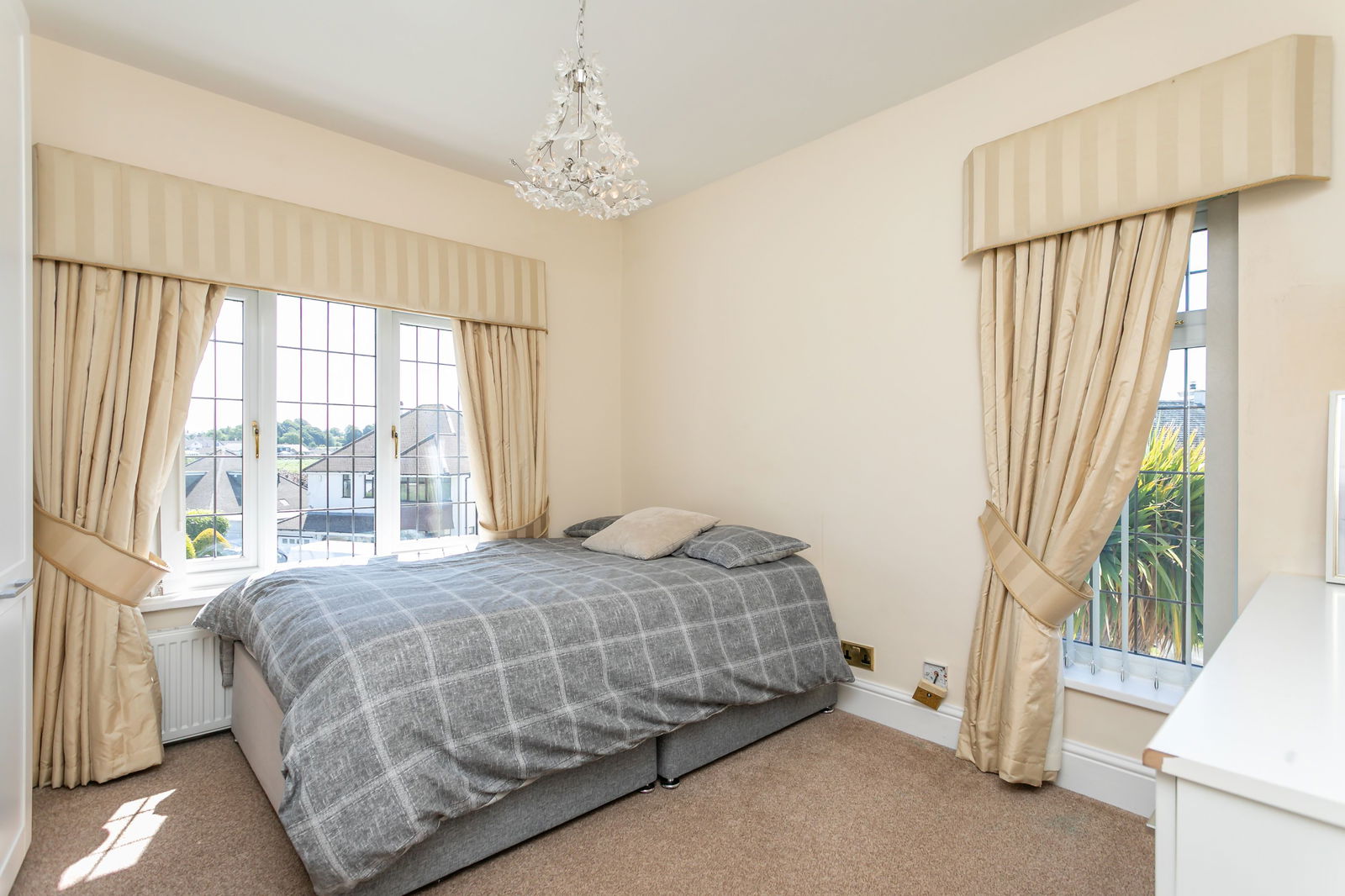 The first floor landing is spacious, the principal bedroom has fabulous bay views to wake up to and a private balcony on which to sit and enjoy them. There are built in wardrobes and a fully tiled ensuite shower room with shower, vanity unit and WC. The second double bedroom also has the same excellent view with an ensuite cloakroom of wash basin and WC. There are two further double bedrooms, one has a bay view and deep built in wardrobe, the other looks east and enjoys the morning sun and has both fitted wardrobes and a dressing table. There is an additional small room, fitted with wardrobe, dressing table and shelving. It would make a delightful nursery, dressing room or home office. Built over the garage is a fifth double bedroom or possibly a games room or den. With a vaulted ceiling built into the apex of the room with under eaves storage space, two Velux skylights and a feature round window. Finally, there is an impressive and glamorous house bathroom with striking high gloss marble look tiling. Spacious and beautifully fitted, this is a stylish addition to the house and has a luxurious double ended bath from which to watch the