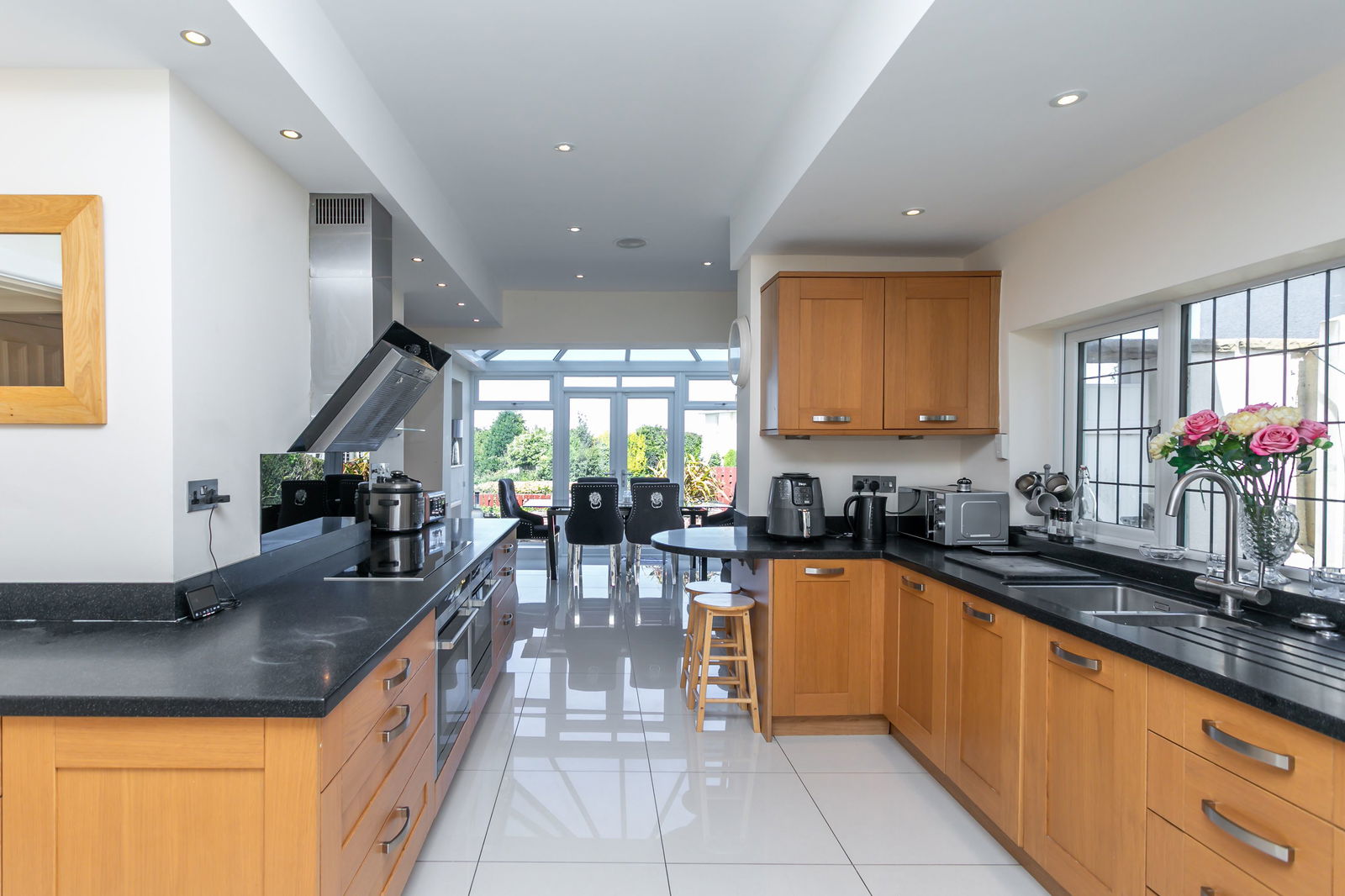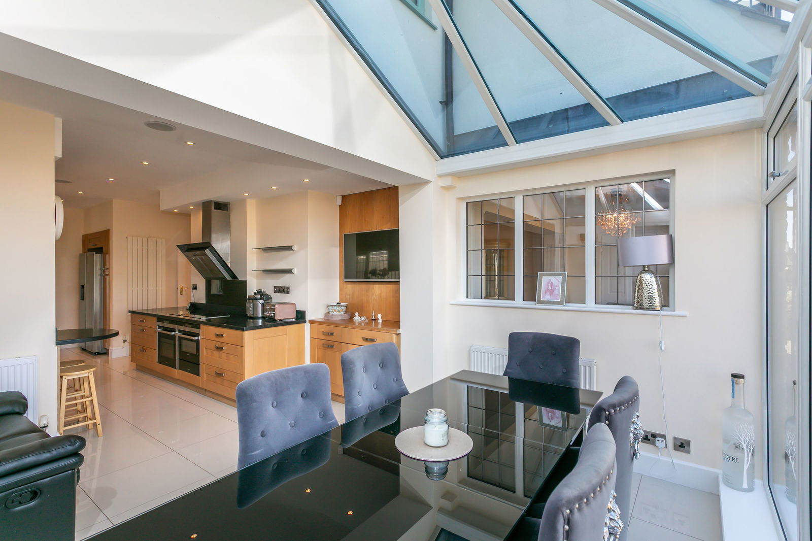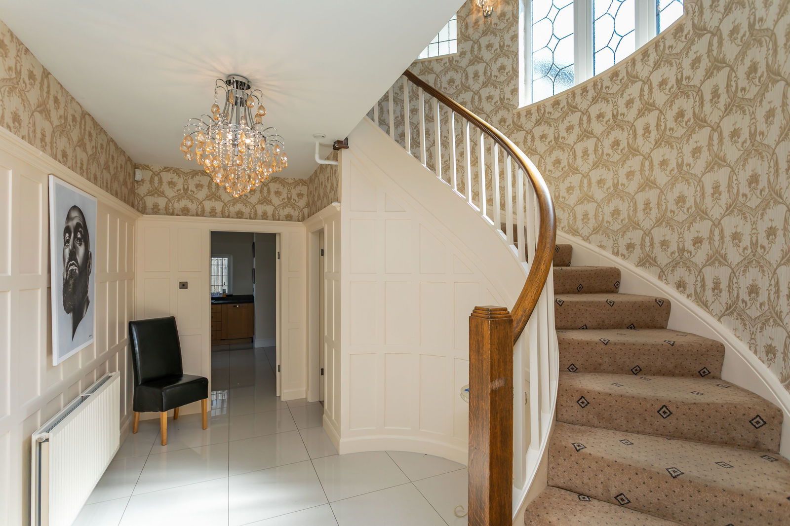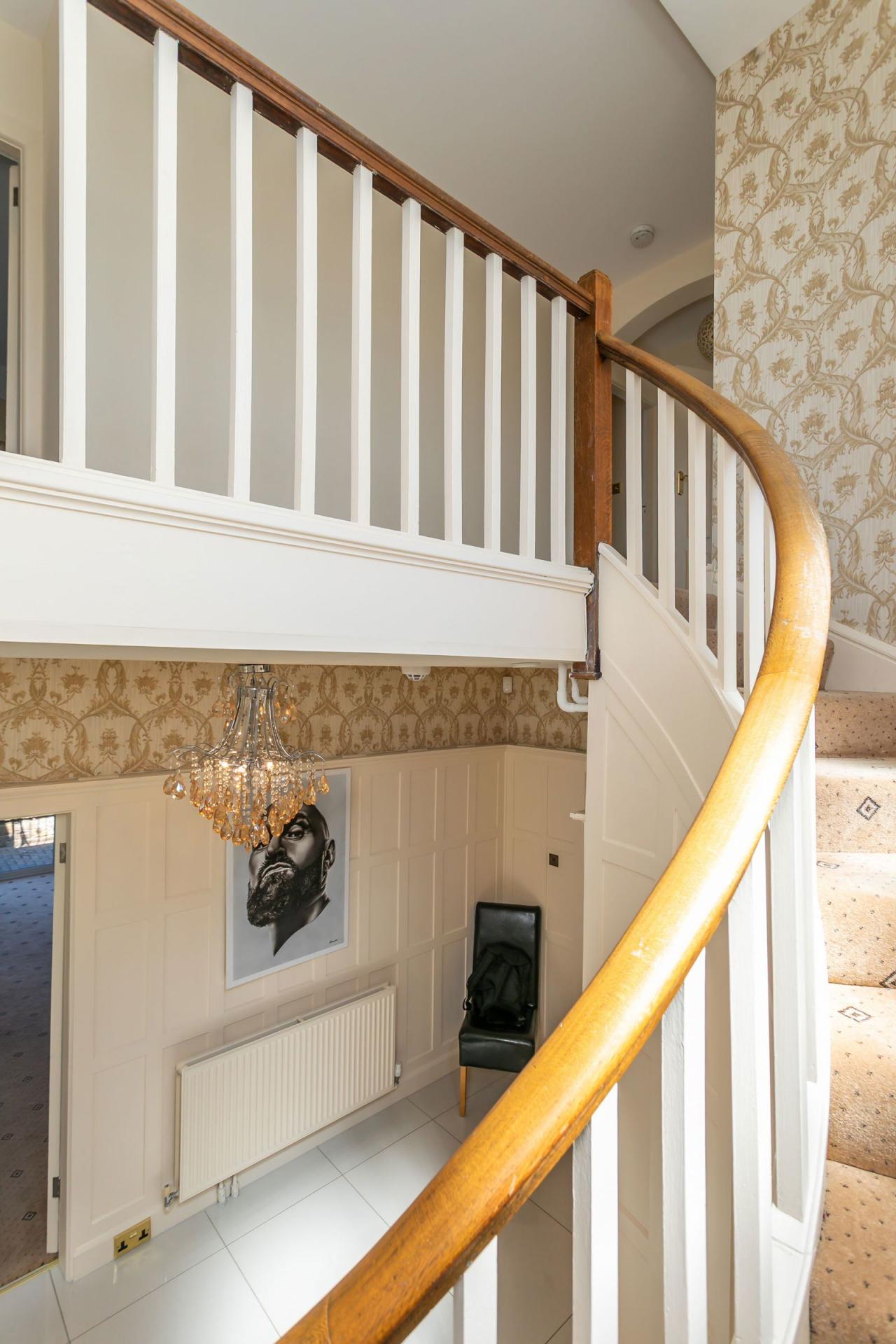 The front door opens into an entrance vestibule with the original oak inner door leading through into the staircase hall which has a gracefully curved staircase with original oak handrail and a series of feature windows. Polished tiles are laid for an elegant, streamlined look which extend into the kitchen, utility, dining area and conservatory.