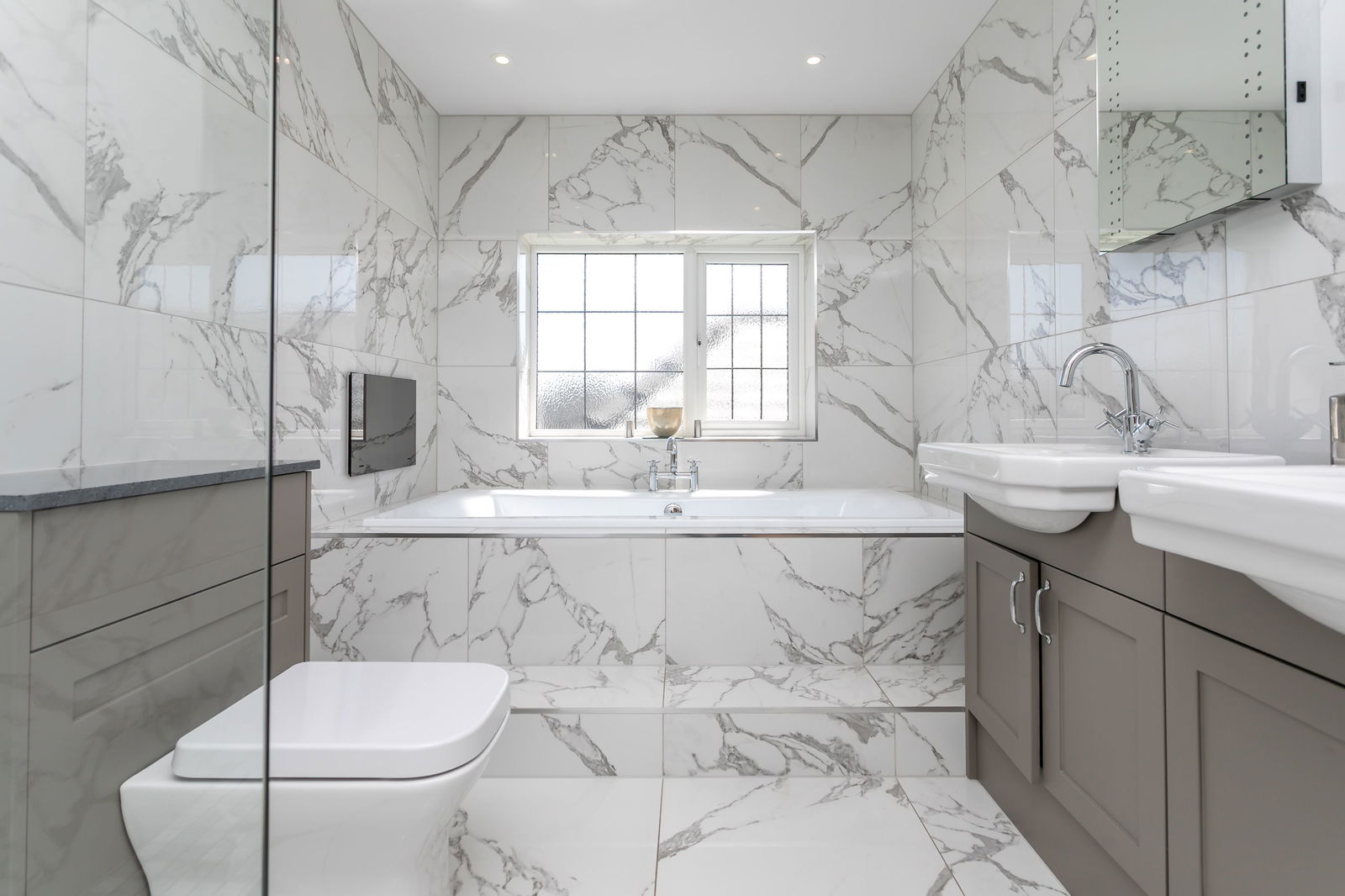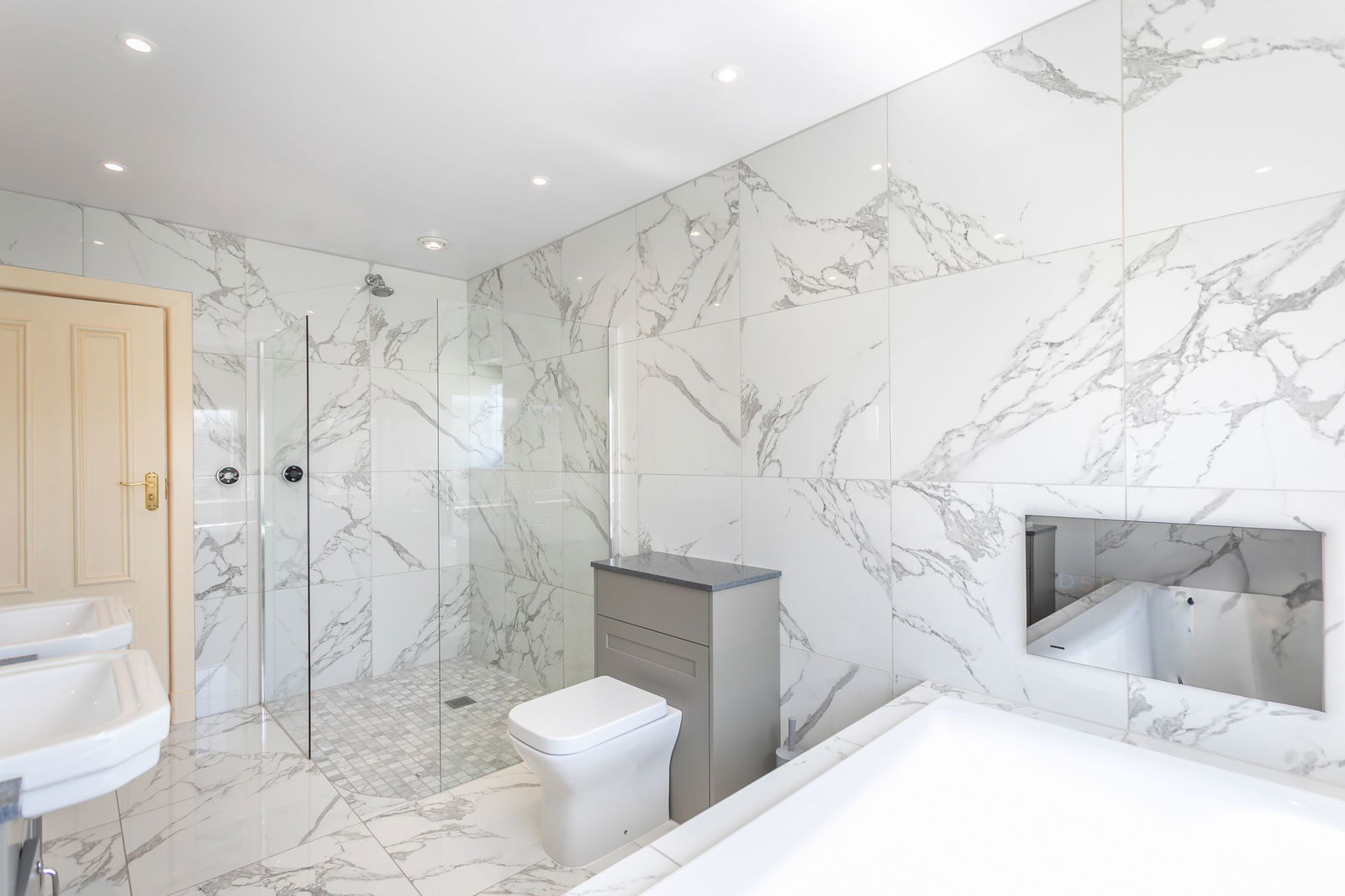 integral TV. Illuminated mirrors sit above twin wash basins, with fitted storage cabinets and a WC.