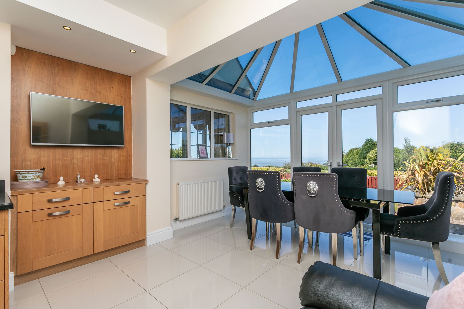 There are two separate reception rooms, the first being a formal sitting room with breathtaking coastal views and a fireplace with electric fire set into an attractive bay. Secondly is a family room, a more informal space, once again benefitting from fabulous bay views. Sliding doors lead out to the front terrace and a gas flame effect fire is set into a polished stone surround.