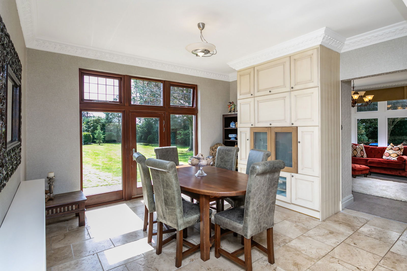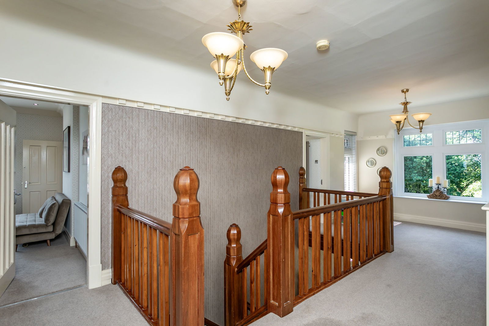 The heart of any home is surely the kitchen and Park Hill offers a series of connected spaces that are adaptable in their use. It’s a sociable, spacious, bright and versatile layout. There are views of the garden in several directions and in the dining area a door opens to the main outside area. The kitchen fittings have classic painted cabinets with walnut tops and an island unit topped with Italian black granite extending to a breakfast bar with space for four stools, above which hangs a Swarovski crystal chandelier. The dining area has a built-in media cupboard incorporating good storage space. Open to the dining area is a family room, providing the opportunity for soft seating or possibly a playroom if you had younger children to consider. Rising to the first floor and there is a generous wrap around landing. The first floor rooms all offer lovely views over the garden and at some points, between the trees, a vista to the countryside beyond.