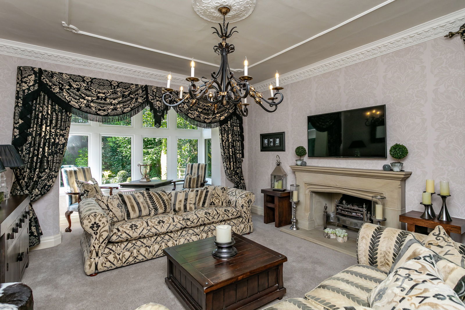 No two ways about it, Park Hill is an impressive property, from the first moment the electric gates swing open, you navigate the turning circle to the steps up to the front door and your entry into the striking front hall. The house is light and spacious with original period features (including the imposing Russian mahogany stairs) which entwine with modern deluxe appointments designed to bring luxury and comfort to your everyday. The reception hall is a room in itself, perfect for welcoming guests with a hardwearing Amtico floor (we are informed by the vendors that they laid this over the original maple wood floor) and double doors with beveled glass opening to the formal and elegant sitting room where an impressive sandstone fireplace makes a welcoming focal point and the large square bay window draws you forward to admire the view of the garden. As open plan or separate as you wish them to be, a second set of double doors open to the snug, which with the click of few buttons, transforms into a cinema room. Cupboards along one wall offer great storage and accommodate a small office set up, neatly tucked away out of everyday sight. From here a concealed door leads through a ventilated void to the pool room. The heated pool itself measures 22’ x 9’ and has a depth ranging from 3’ to 6’. There’s plenty of room for furniture to be set out on the black riven slated surround. The views from the garden are lovely and wrap around this excellent addition which has French doors opening to the garden.