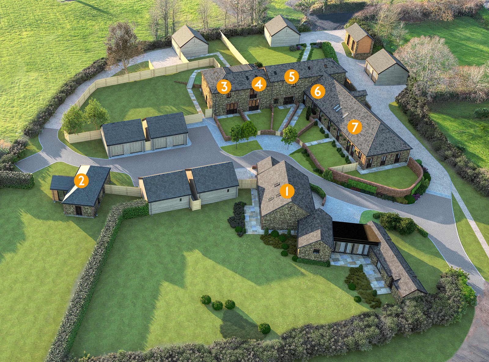Each of the barns have been converted into high quality homes and offer spacious and highly flexible accommodation. Many of the spacious barns will have larger than average gardens and all will have double garages. The properties have a wealth of original features and where possible every effort has been made to utilise reclaimed materials to ensure that the authenticity of the buildings remain. Some features visible include vaulted ceilings, oak doors, exposed brickwork and slate lintels.
