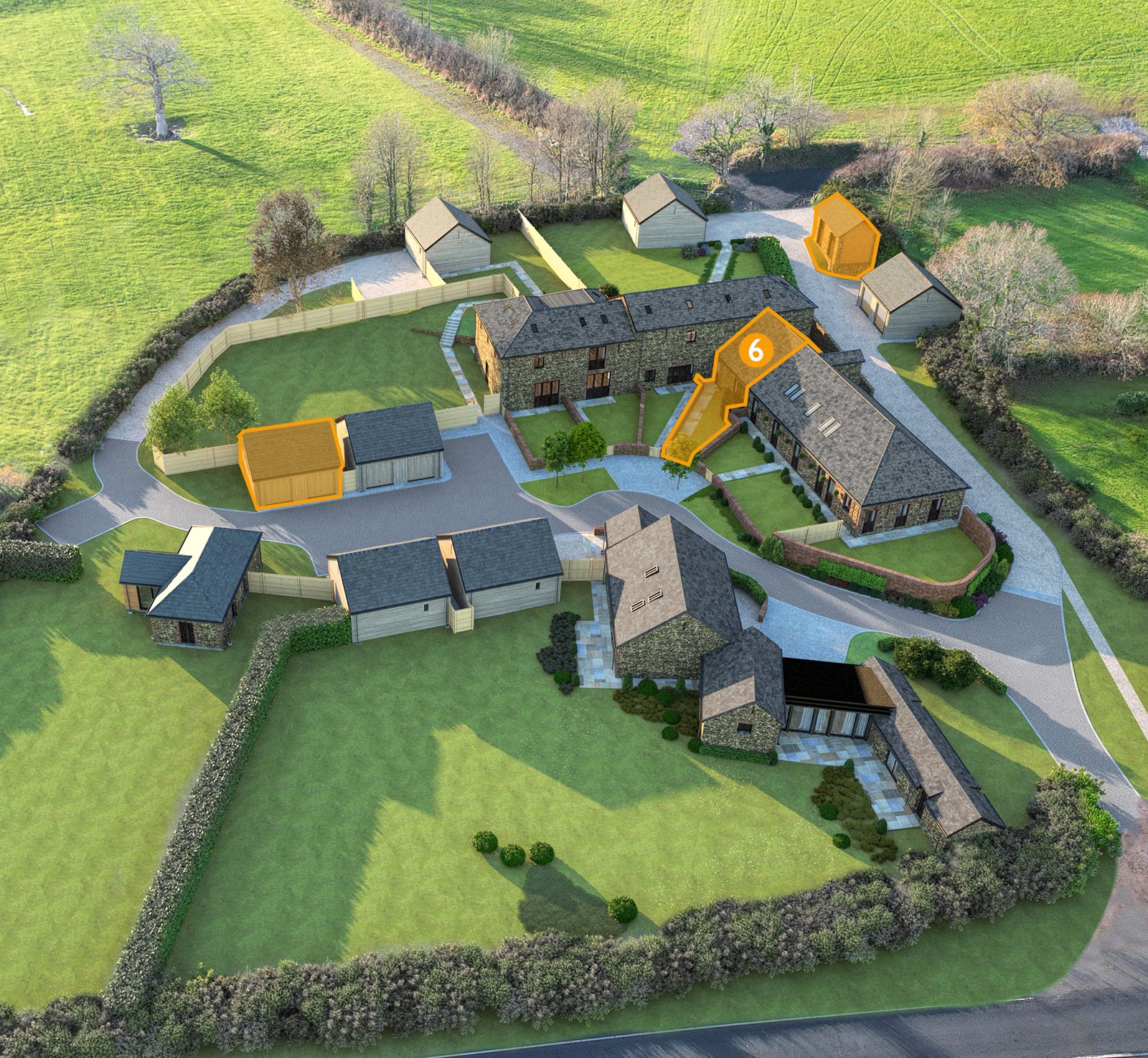 Barn number six is a two double bedroom property with a bedroom on each of the two floors both with en-suite facilities. The comfortable well-appointed living accommodation is open plan on the ground floor with direct access to the front courtyard garden. The main benefit of this barn is the detached studio which is located a few steps away. This could be used as a home office, games or hobbies room, or holds potential (subject to obtaining all consents) to become further accommodation. This barn is perfect for those who work from home or who have a particular hobby as their passion.