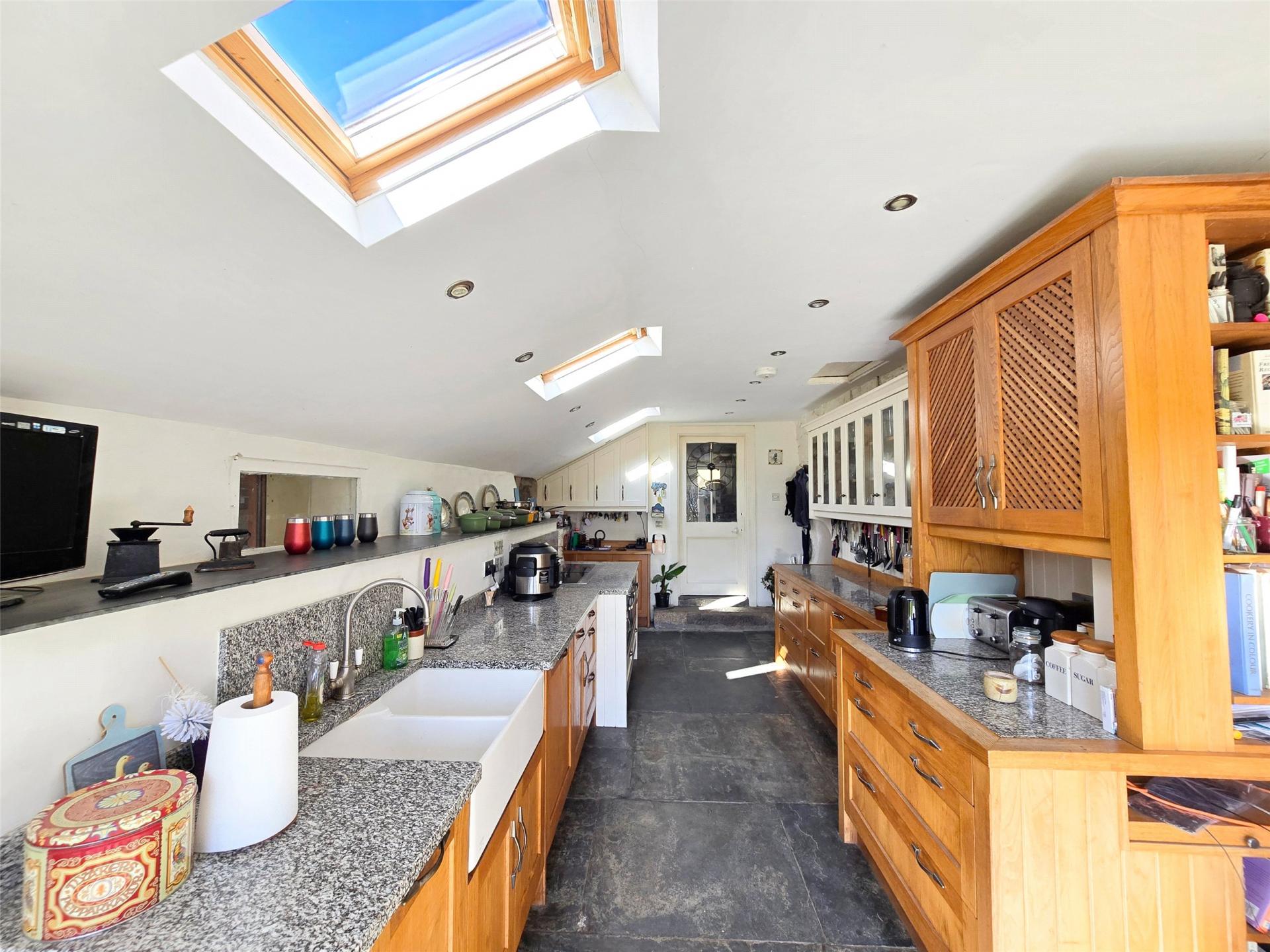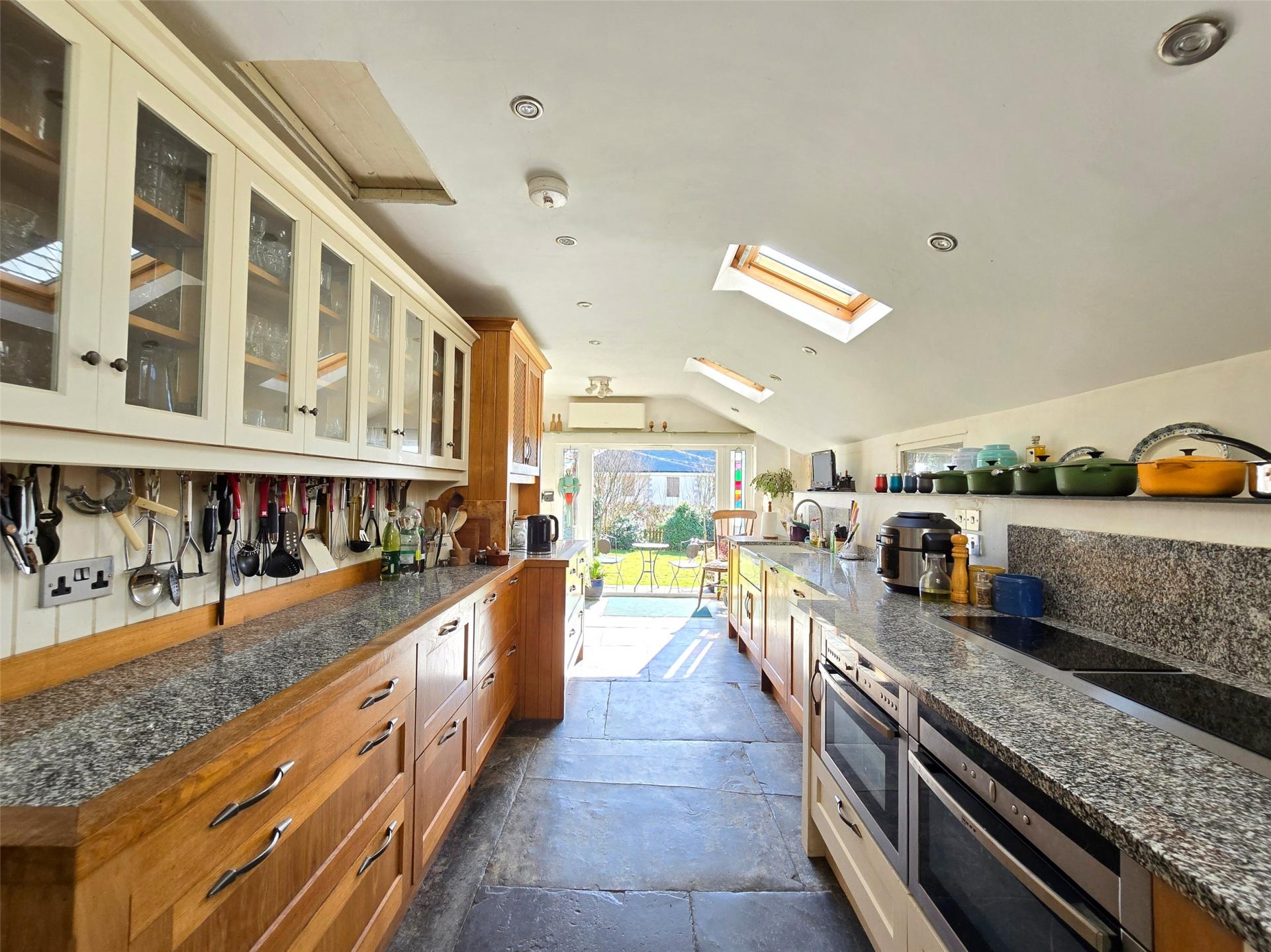 The home is well proportioned and comprises of a spacious yet cosy lounge/dining room which has an attractive fireplace at one end with impressive granite at either side and a clome oven. A woodburning stove sits on a raised slate hearth. The handmade kitchen is of a premium quality and entirely bespoke with solid granite worktops and chestnut units; there are high quality internal appliances such as two electric double ovens and induction hobs above, as well as an integrated dishwasher and easy access refrigerator drawers. At the end of the kitchen there is room for a breakfast table and double doors leading to the garden. To bolster storage there is a second kitchen and a walk-in larder. A snug can be found which again has double doors and a utility room and WC. Concluding the ground floor is the study/fourth bedroom.