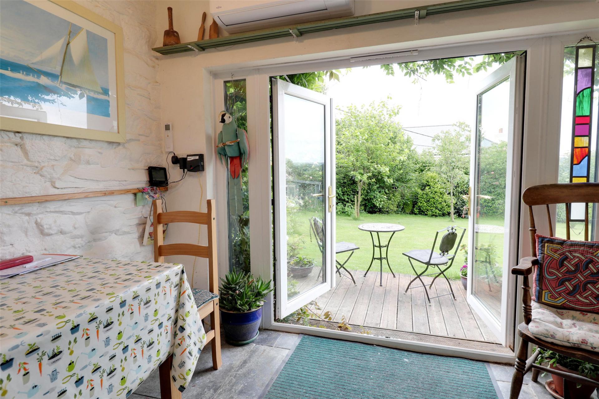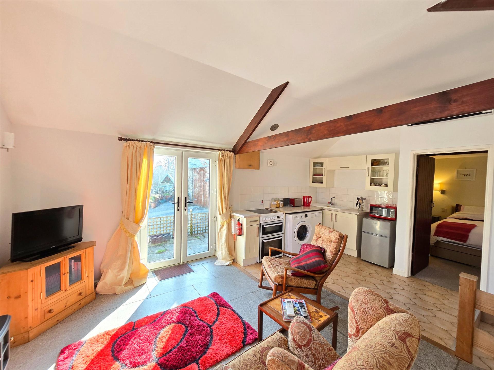 About 30 years ago the comfortable one bedroom single storey annexe known affectionately as “The Cottage” was converted from a former studio. This offers open plan lounge/kitchen/dining room space with impressive ‘A’ frame ceilings; an electric cooker, dishwasher, washing machine and fridge/freezer are included in the sale. The large double bedroom has a built-in wardrobe and an en- suite shower room/WC with electric shower. It has been used as both a holiday let deriving valuable supplementary income and could accommodate overflow family members if required. Our clients inform us that it is fully compliant in terms of regulations for holiday use. It has its own south facing enclosed terraced garden. At the back of the cottage is a useful store which is about the size of an average single garage.