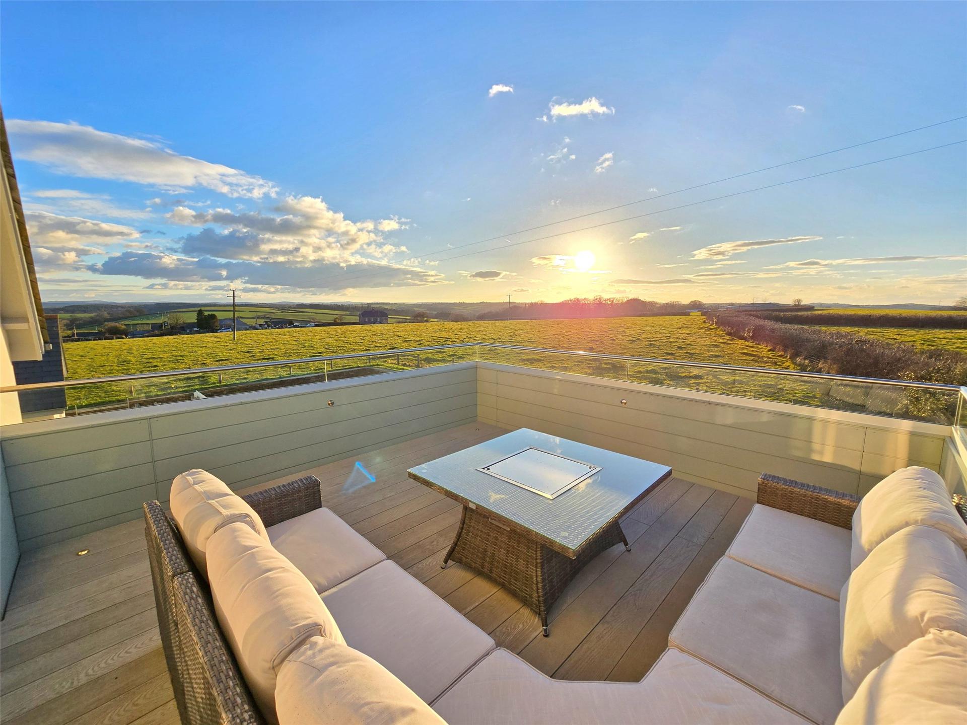 The first floor galleried lounge has engineered oak flooring, a wall mounted LPG gas fire, and bi-fold doors that open to a spacious balcony with panoramic views, ideal for evening drinks. The ground floor includes three double bedrooms, with two of them featuring walk-in dressing areas. The luxurious family bathroom includes a freestanding bathtub and a separate double shower cubicle with a soaker shower.