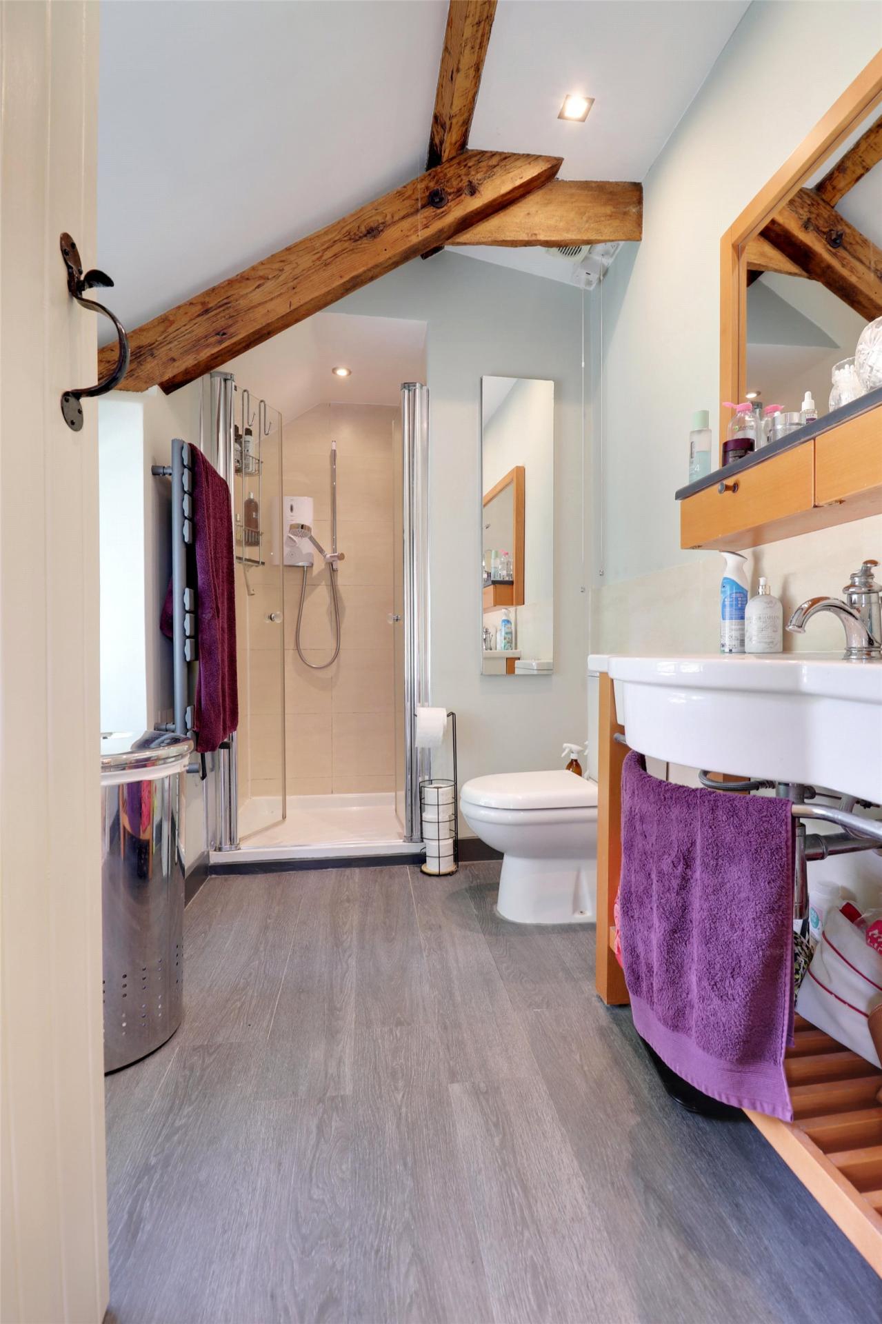 On the first floor is a long landing with a wooden floor that has access to all bedrooms. The master bedroom is dual aspect and the main feature has to be the balcony at the front which (although small) offers the chance to open and enjoy fresh air with a view over the garden. There is an en-suite shower room/WC which is well equipped with a matching suite including a generous sized shower cubicle with electric shower unit. Bedrooms two and three are both large enough to accommodate a double bed and have views over the garden. Bedroom four is a good size single room and can be used as a home office if required. The family bathroom/WC has a premium range of sanitaryware by “fired earth” and includes a wash hand basin, low level WC and enamelled bath with shower attachment above. The bathroom receives light from roof windows like the landing.