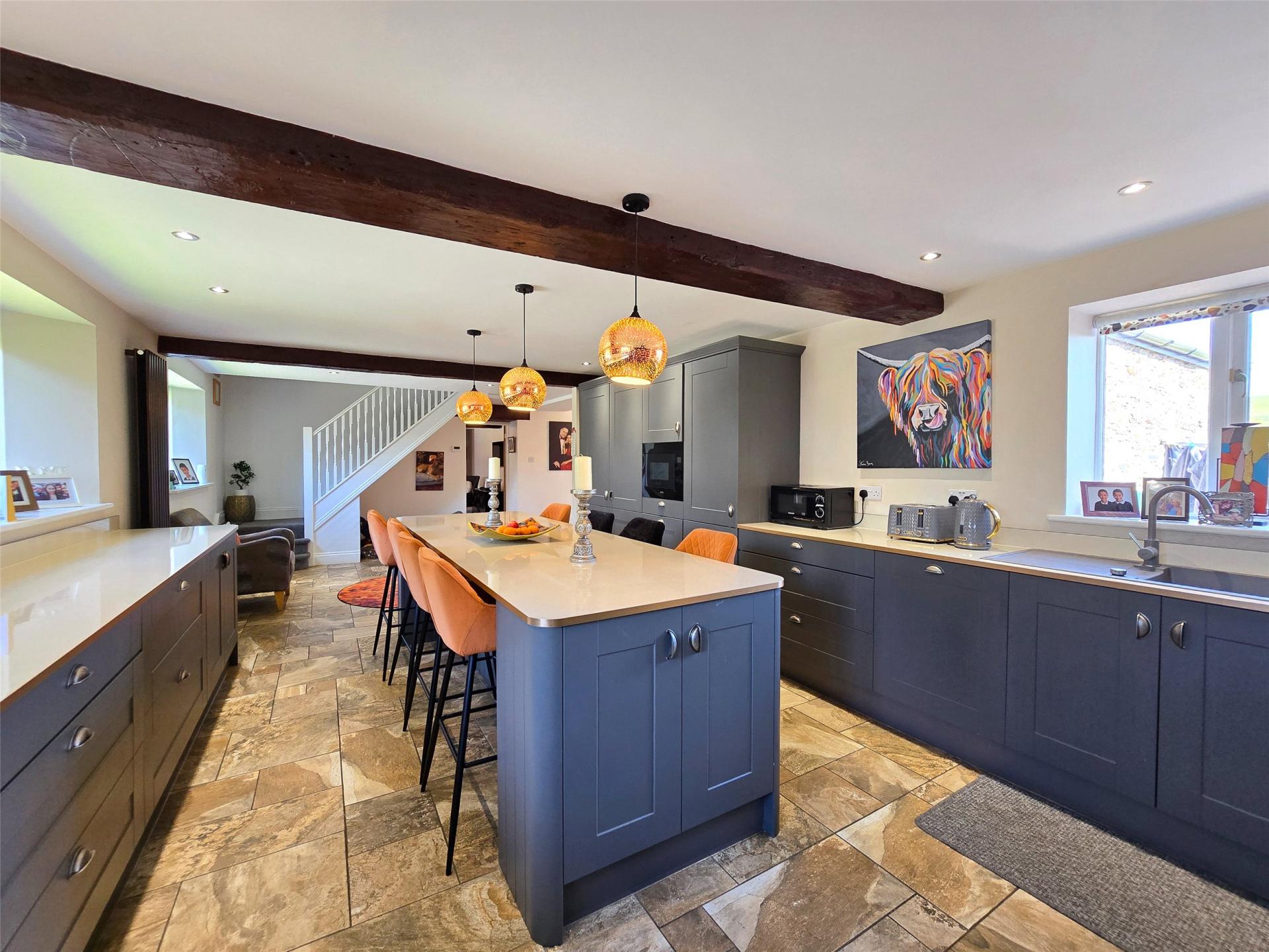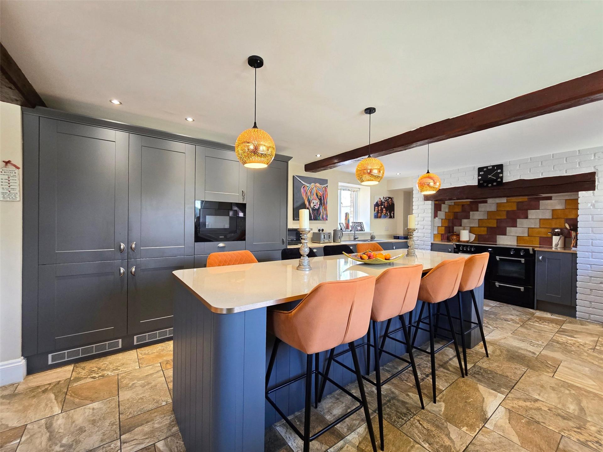 Internally, the accommodation includes a split-level welcoming entrance hall that has under floor heating. Our clients have removed a couple of internal walls allowing the hallway to flow naturally into the kitchen which is a sociable and airy space. This dual aspect room has been completely updated and features a centre island which is substantial with room for at least eight place settings. The kitchen is used daily for dining and comes alive during times of family celebration. The worktops are laminated and have matching up stands. There are light charcoal coloured cupboards with corner carousel units and an attractive painted brick fireplace with cupboards featuring an integrated Stoves range style oven and electric induction hob. Included in the sale is an American style fridge, separate freezer and a dishwasher. There is ceramic flooring and both suspended and recessed downlighting. The utility room has a WC within it and a further range of high quality units and plumbed spaces for necessary appliances. The reception rooms comprise of a sitting room which is spacious having double doors to the outside, the stand out feature is the painted brick and wooden fireplace which has an inset wood burning stove.