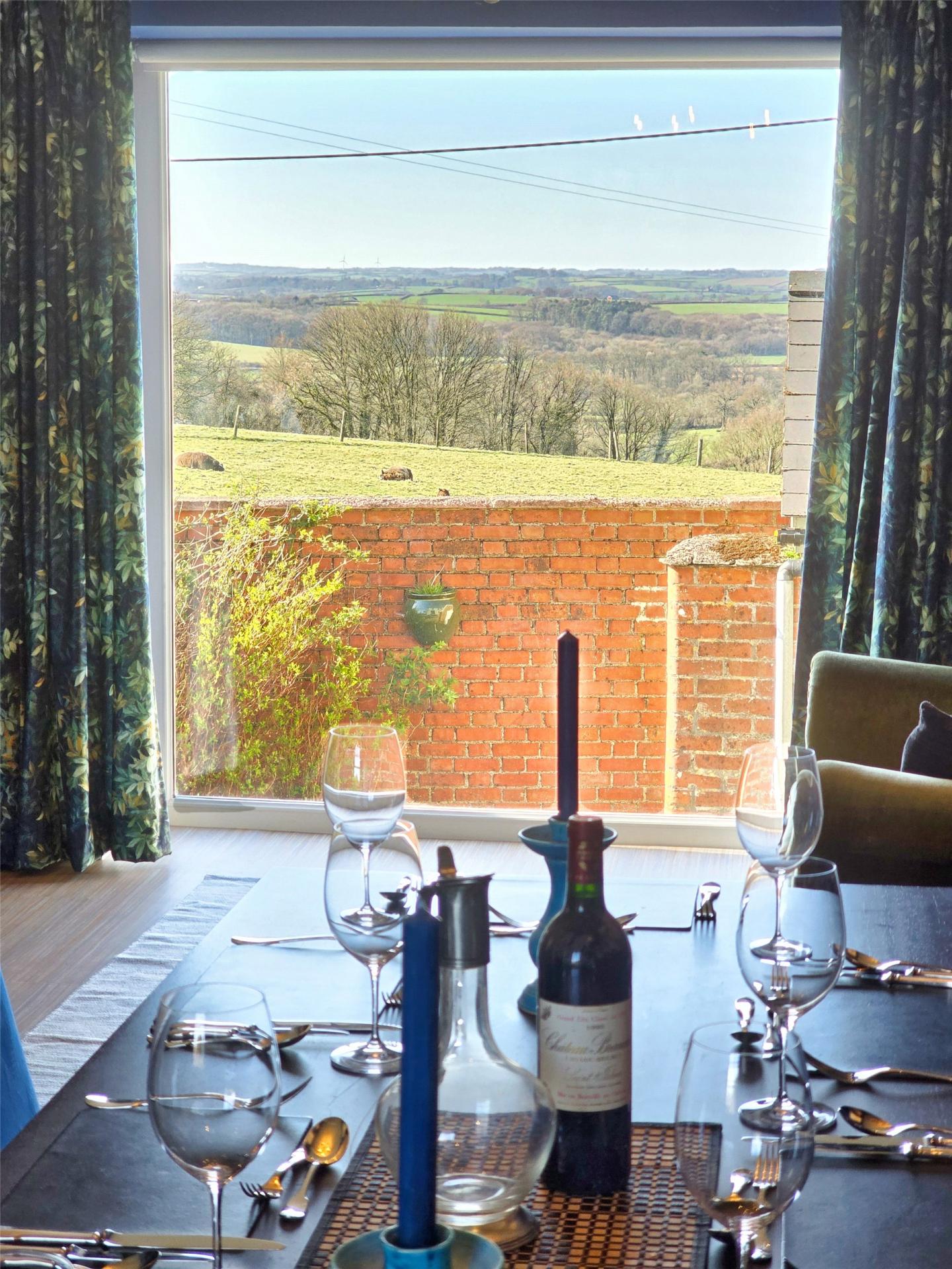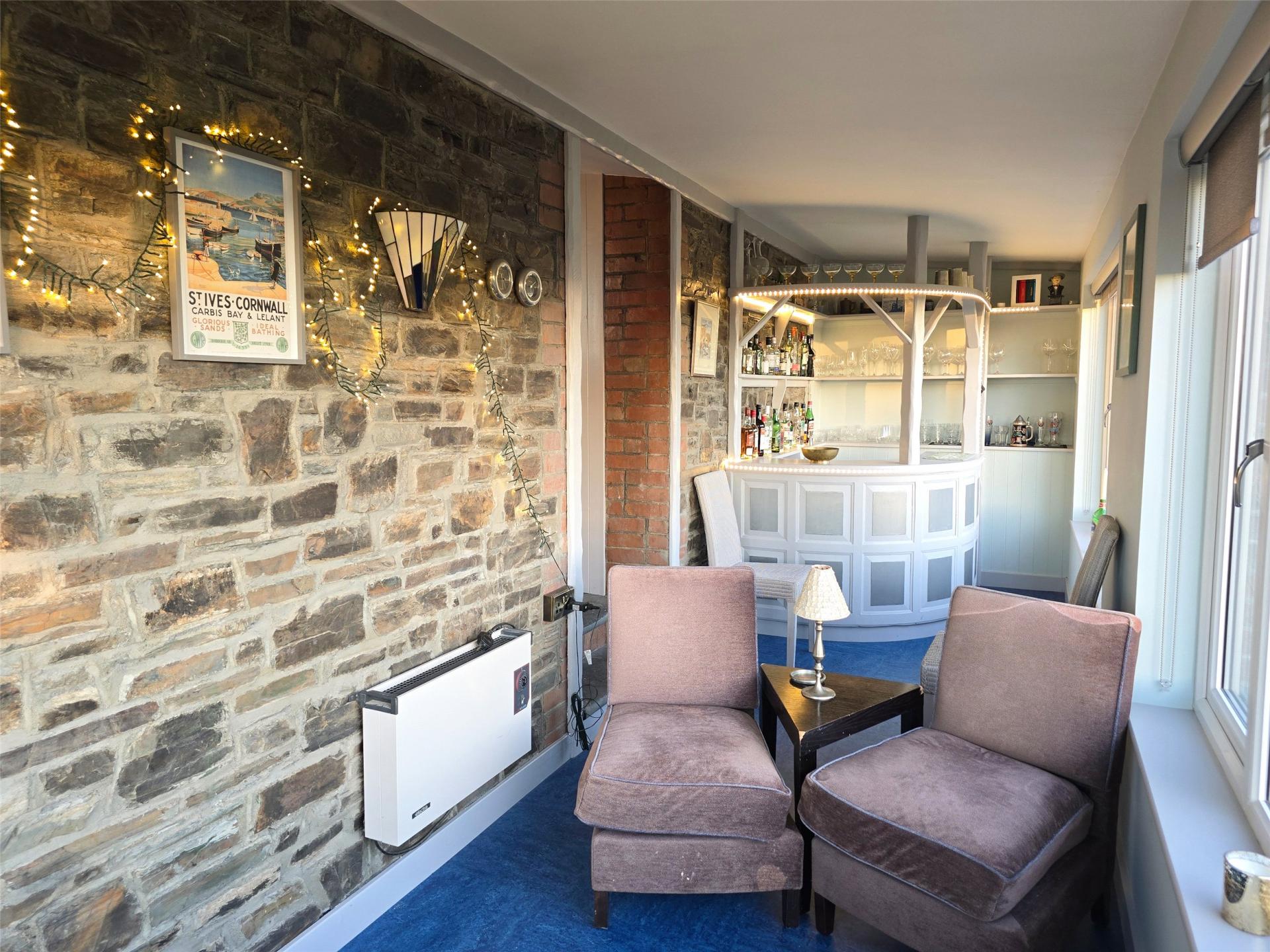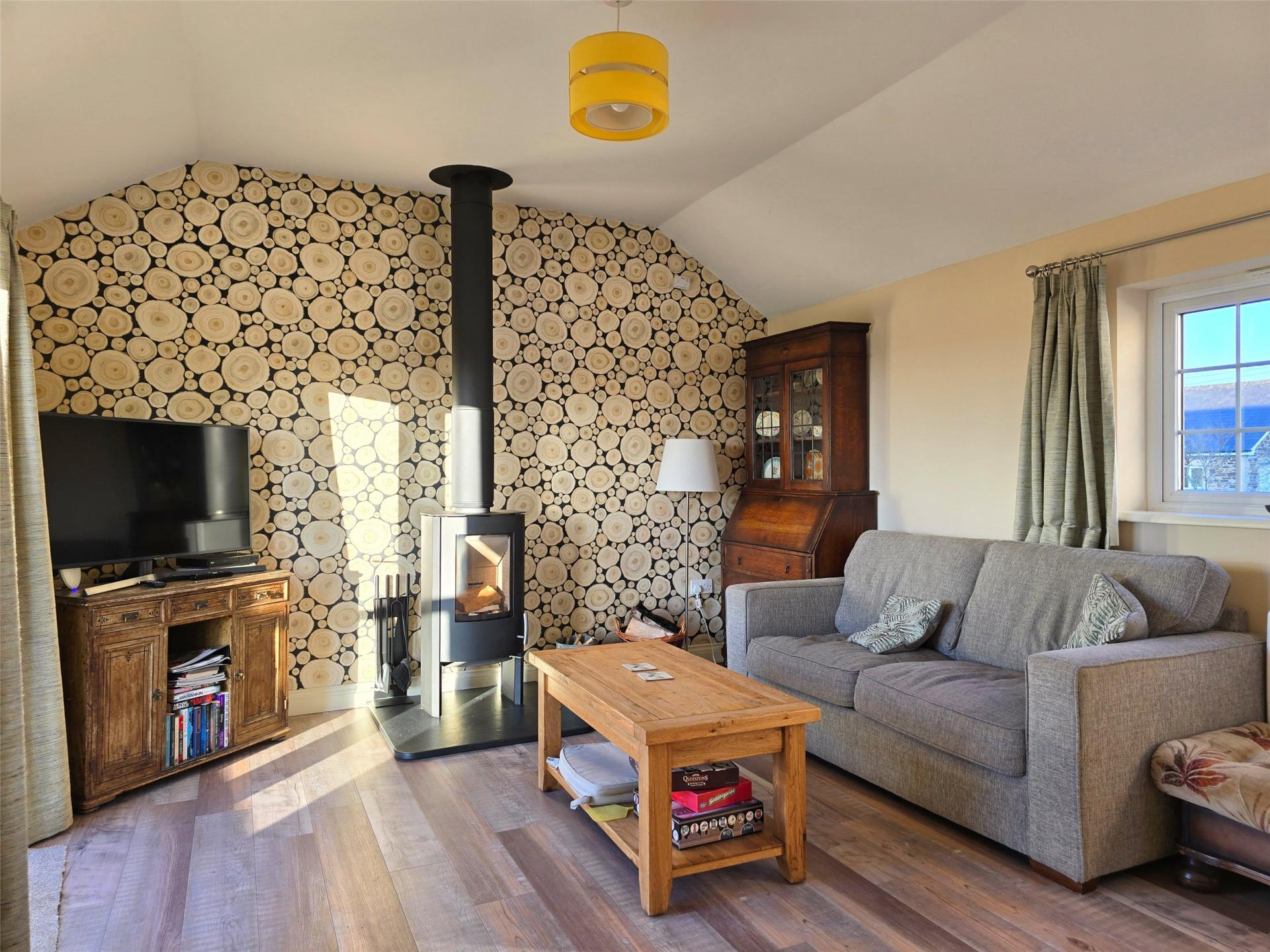 Upon entering, you are greeted by a welcoming reception area with stairs leading to the first floor and down to the basement. The hallway opens to the kitchen/breakfast room, which has been completely refitted with a high end kitchen designed by Define of Launceston. Features include durable Dekton worksurfaces, solid wood cabinetry, pull out drawers, a double opening larder, and a range of integrated appliances, including a Neff oven, a gas hob, a Miele dishwasher, and a Quooker boiling tap. The dual aspect dining room enjoys expansive countryside views and boasts a slate fireplace. Beyond, the sunroom with a built in bar offers an abundance of natural light and access to a raised terrace for the perfect setting to unwind while taking in the view. The spacious lounge, with its cosy wooden flooring and inset wood burning stove, provides an inviting retreat.