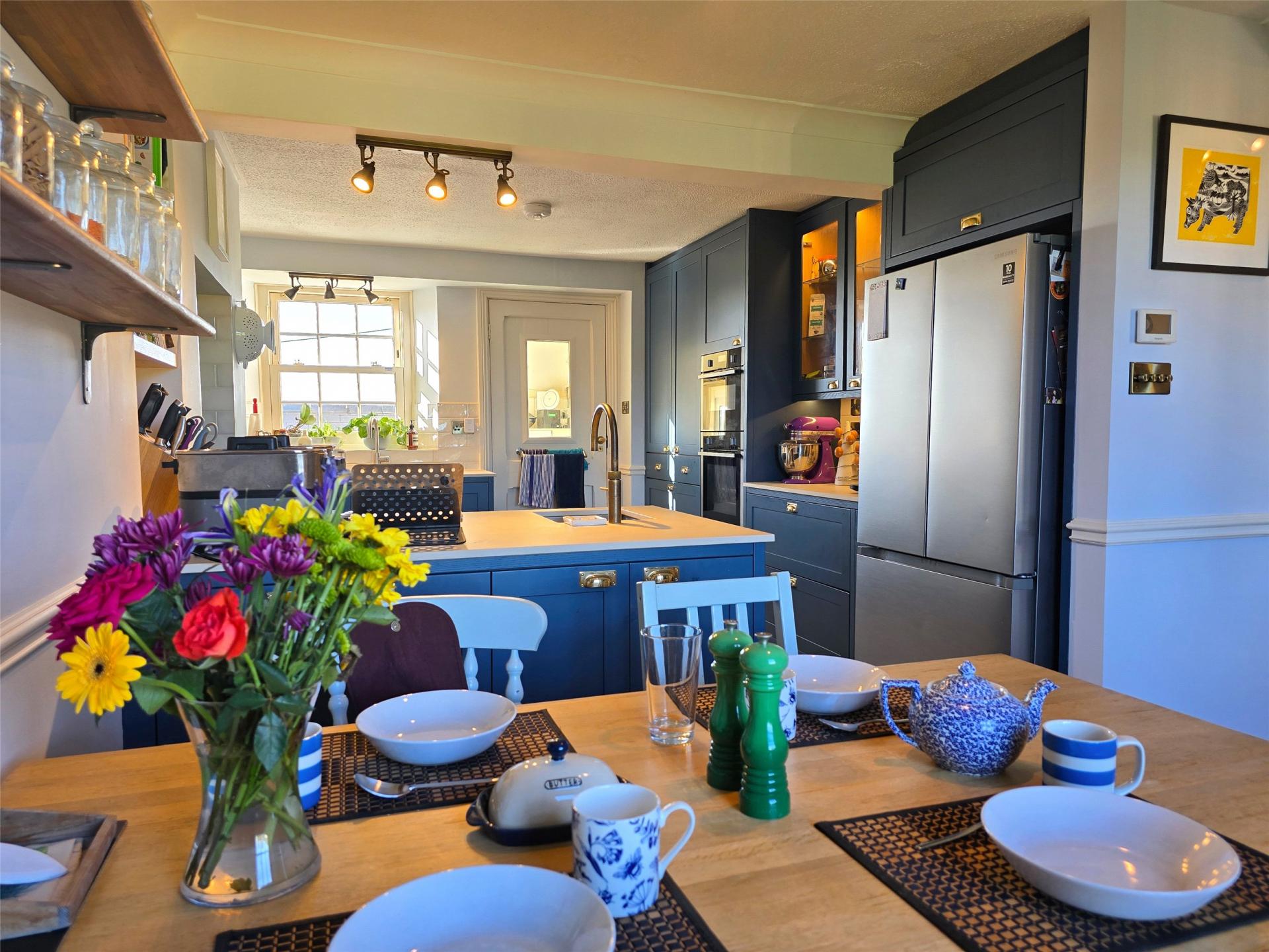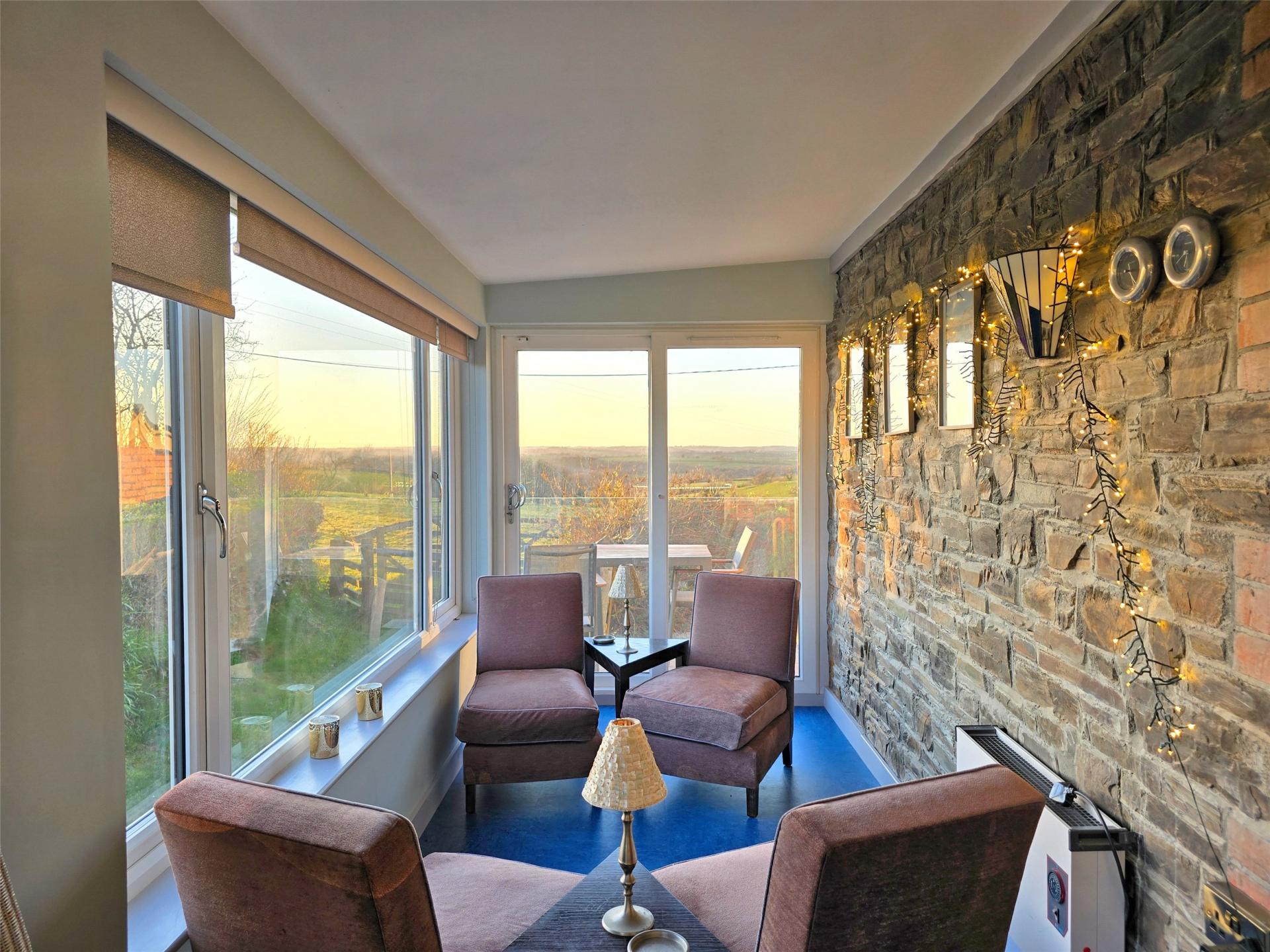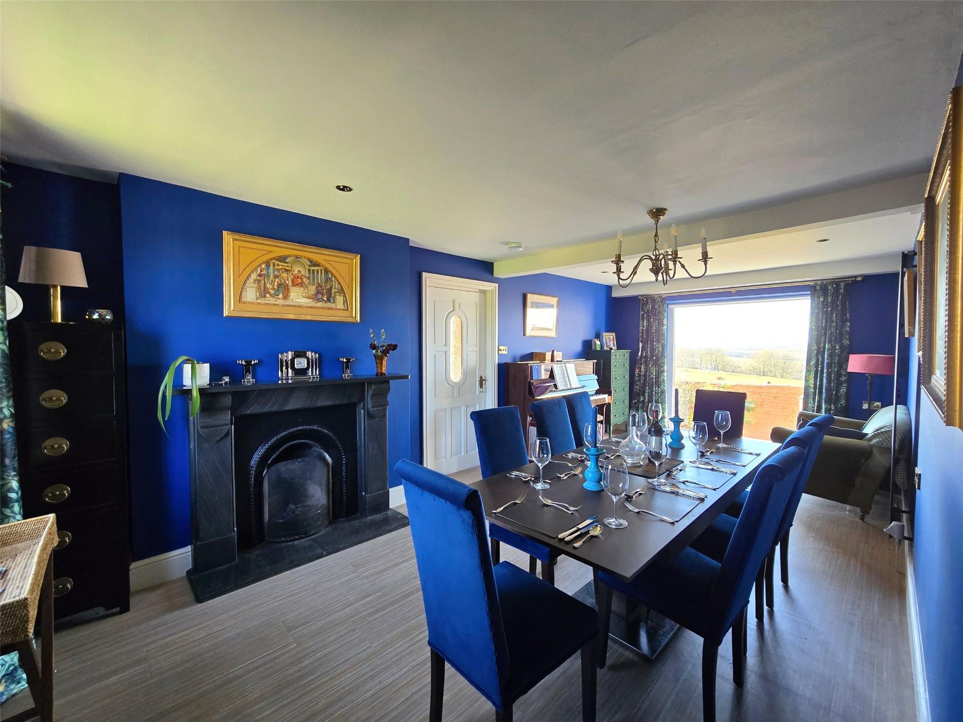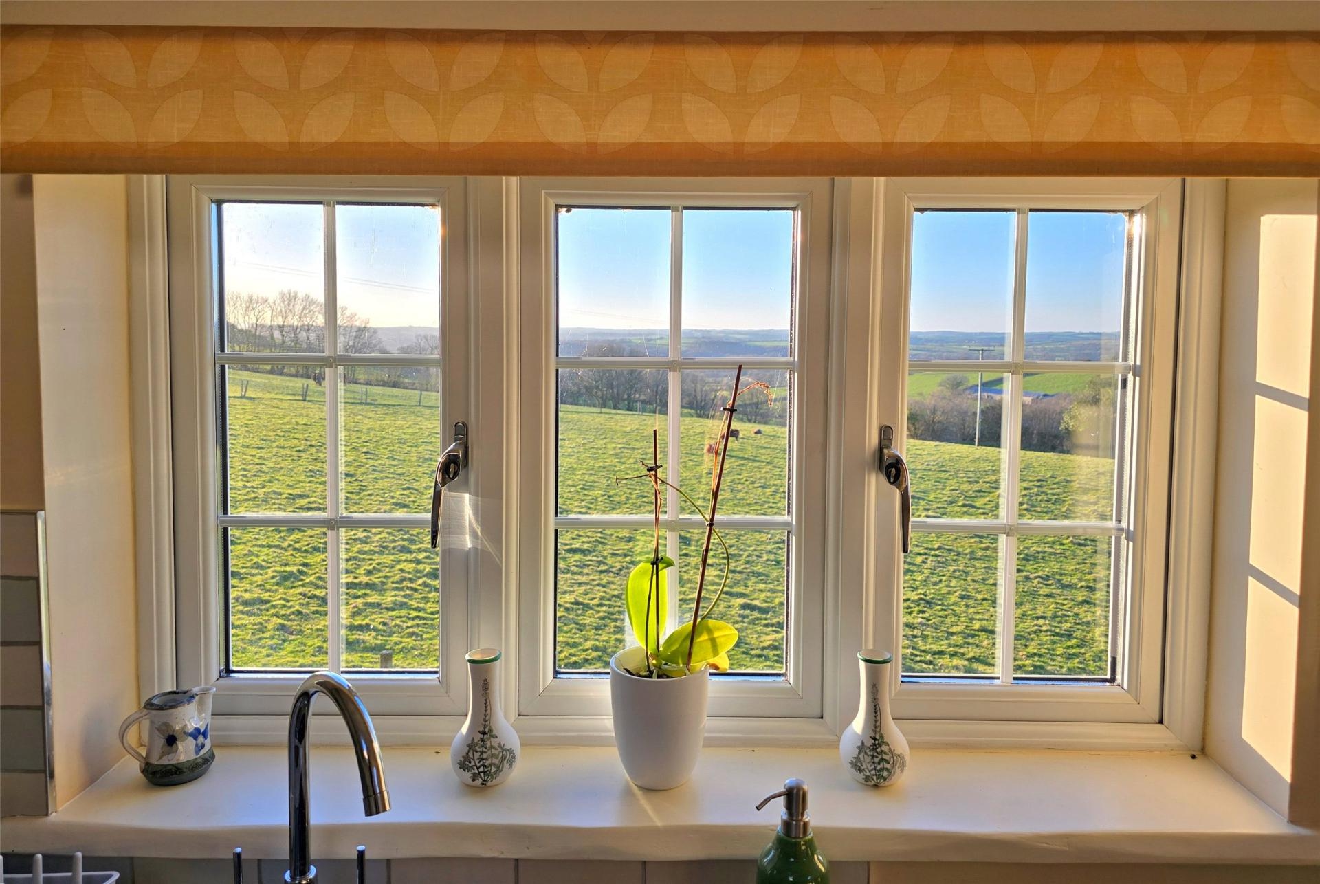 Upon entering, you are greeted by a welcoming reception area with stairs leading to the first floor and down to the basement. The hallway opens to the kitchen/breakfast room, which has been completely refitted with a high end kitchen designed by Define of Launceston. Features include durable Dekton worksurfaces, solid wood cabinetry, pull out drawers, a double opening larder, and a range of integrated appliances, including a Neff oven, a gas hob, a Miele dishwasher, and a Quooker boiling tap. The dual aspect dining room enjoys expansive countryside views and boasts a slate fireplace. Beyond, the sunroom with a built in bar offers an abundance of natural light and access to a raised terrace for the perfect setting to unwind while taking in the view. The spacious lounge, with its cosy wooden flooring and inset wood burning stove, provides an inviting retreat.