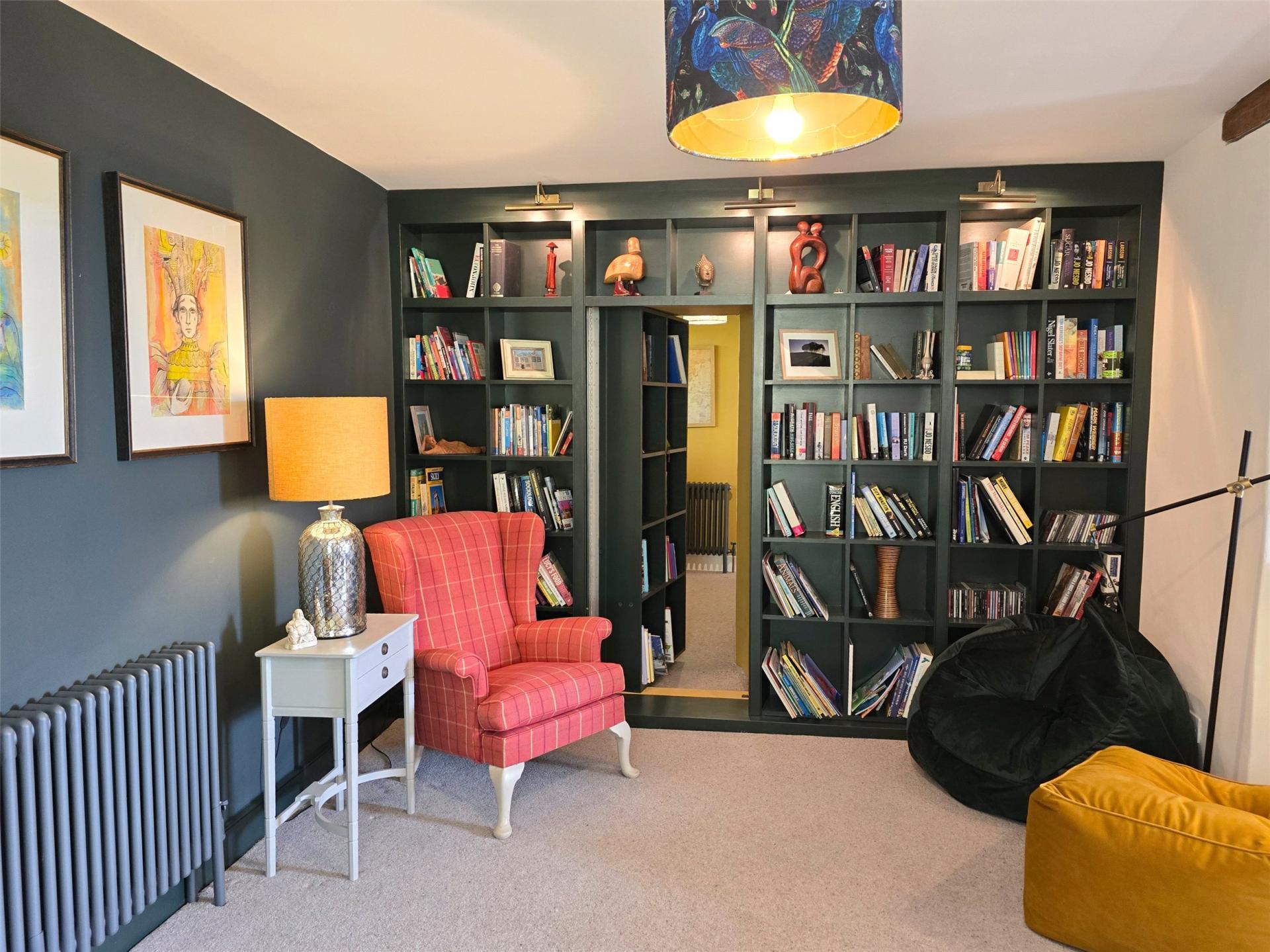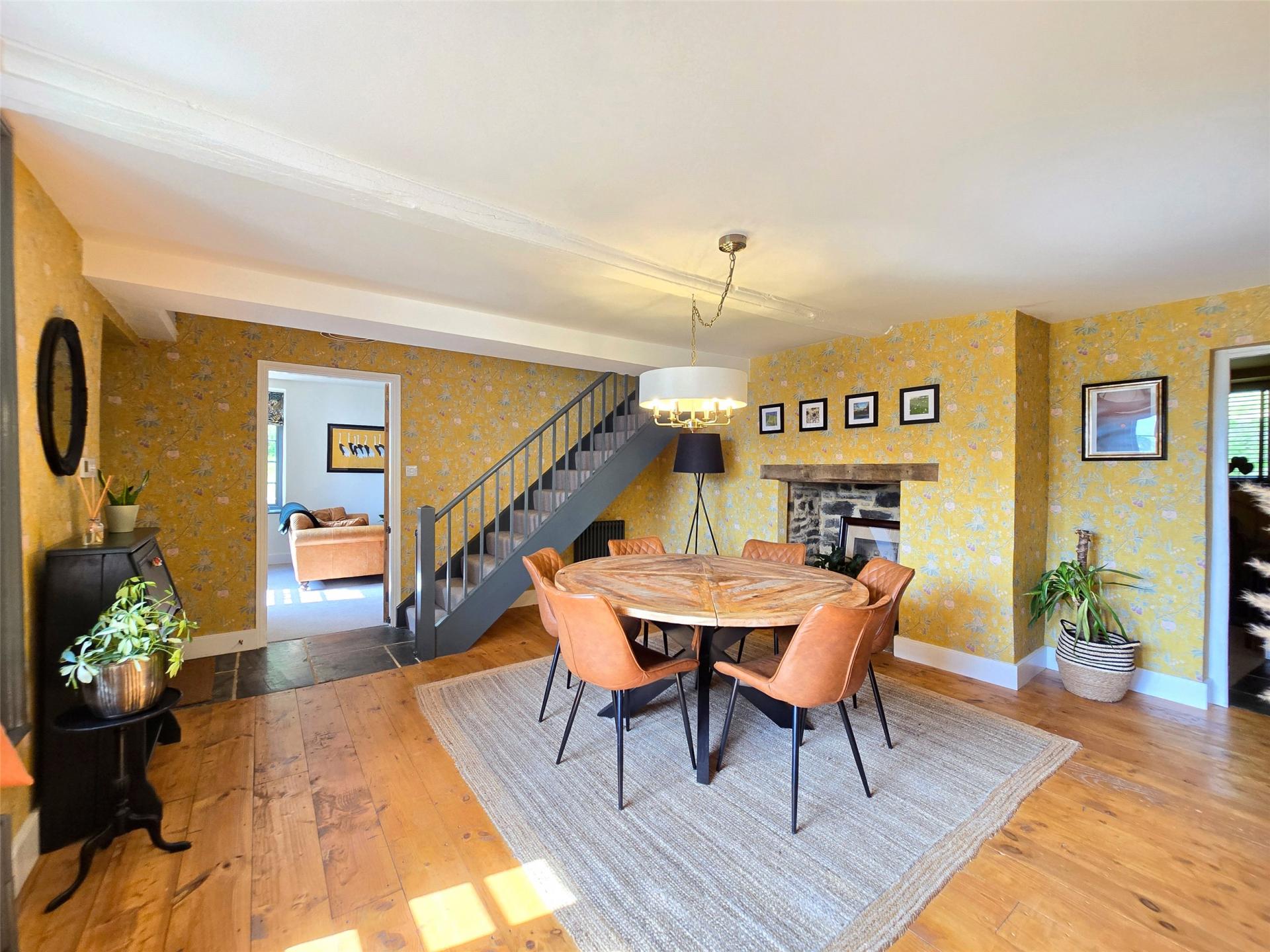 The property is entered via an open porch that leads directly into a welcoming formal dining room - an immediate showcase of the home's quality and attention to detail. This spacious room comfortably accommodates a large dining table and features a striking fireplace as its centrepiece. Beyond lies the dual aspect sitting room, which also boasts a feature fireplace with a wood burning stove. A door opens out to the side garden, and a cleverly concealed home office is accessed via a sensor activated bookcase, located next to the downstairs WC.