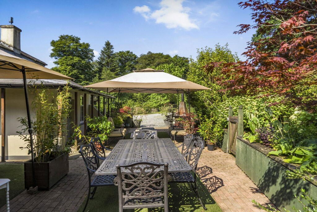 Hawkmoor House has a delightful mature garden filled with lawns, mature shrubs, and trees. Just outside the kitchen and breakfast room, you will find a spacious patio with a veranda, perfect for lively gatherings or peaceful morning coffees. Further along the lawn, is another patio area with a fishpond—an all-day suntrap!