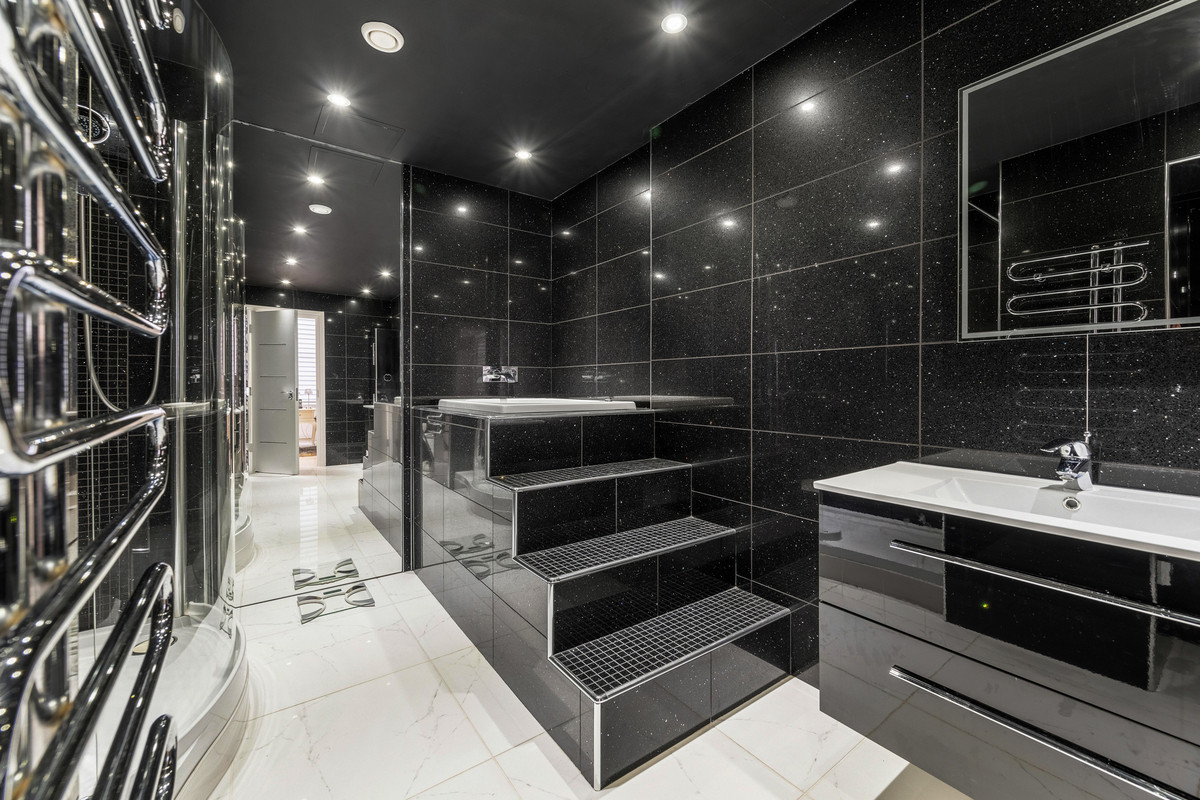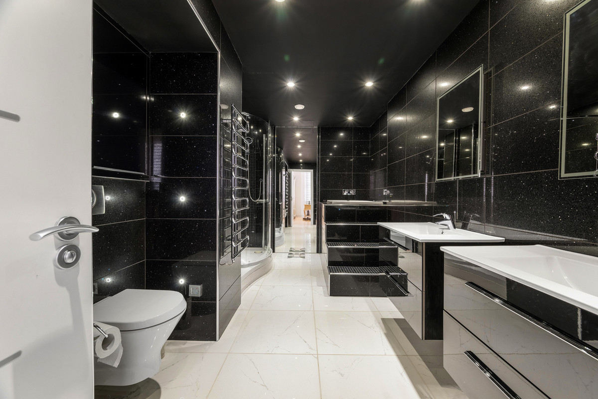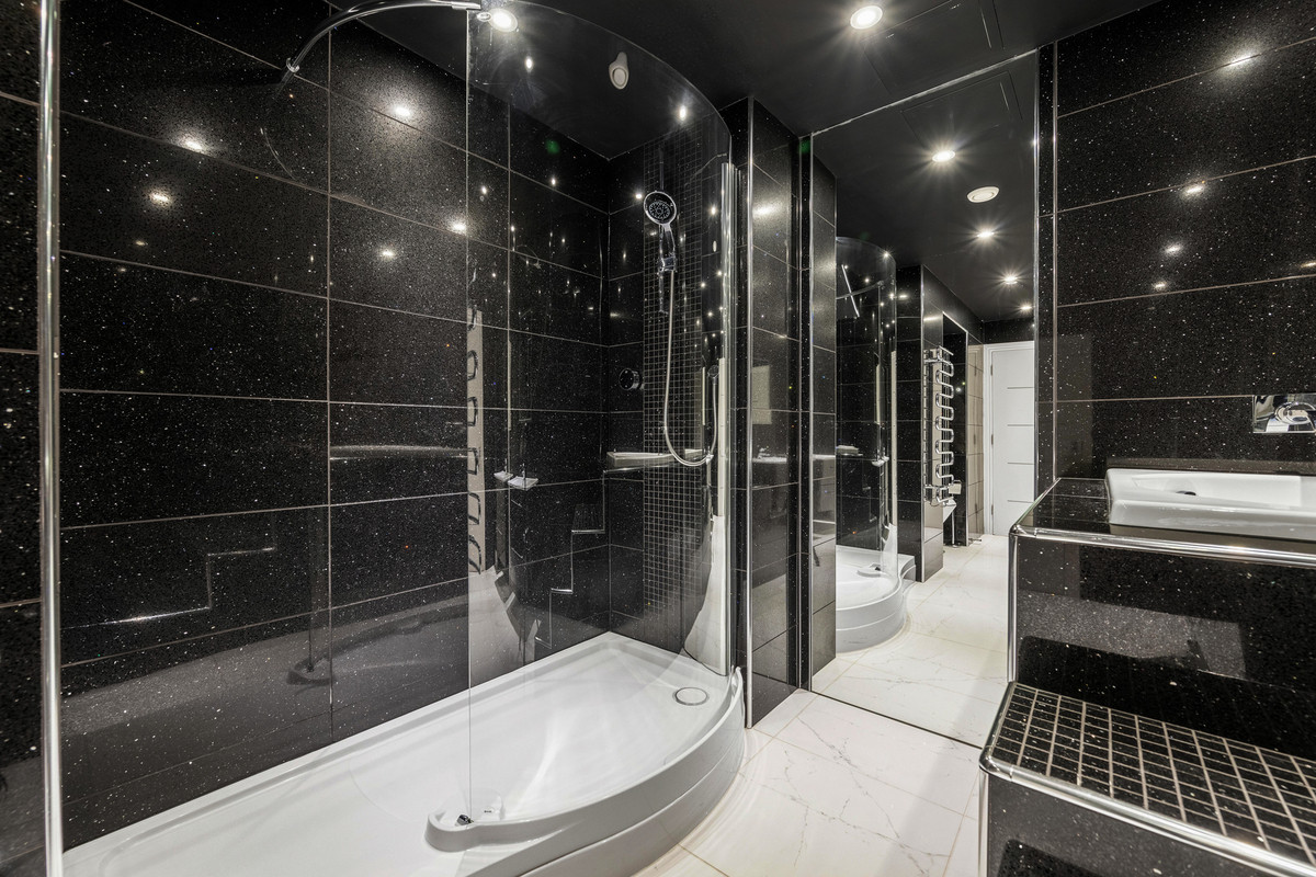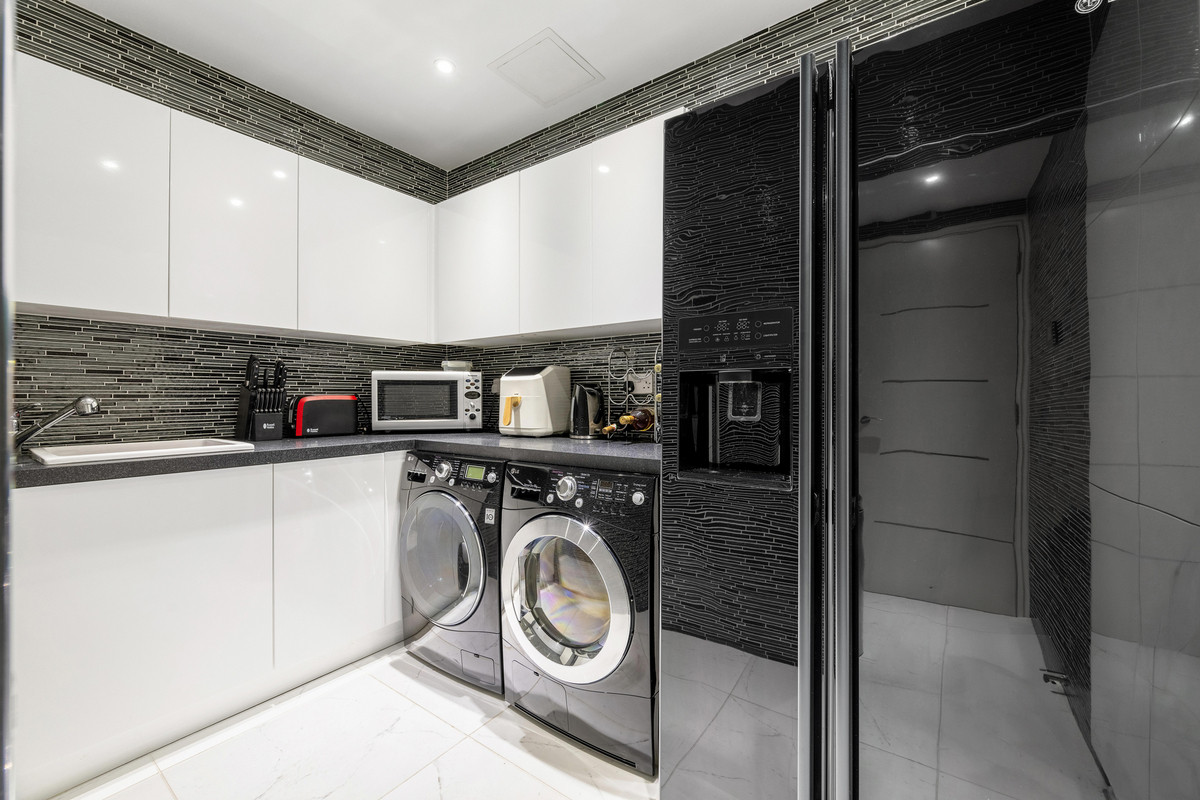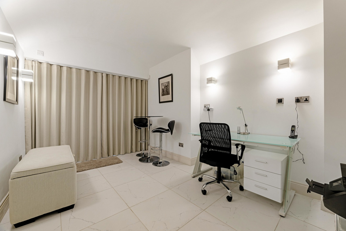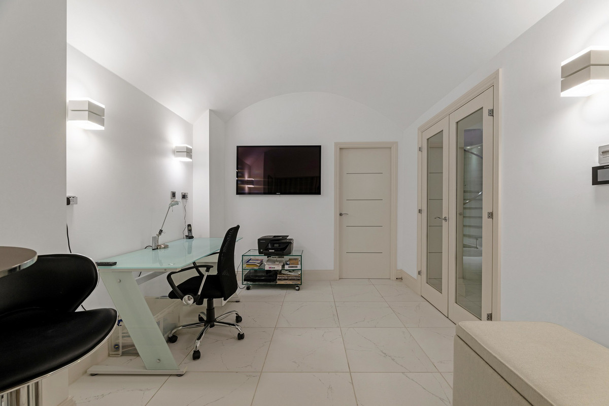 Lower Ground Floor – The spiral staircase leads into a spacious hallway on the lower ground floor which in turn leads to three generous double bedrooms, three bathrooms, a utility room and home office. The primary bedroom benefits from a large ensuite with his and hers sinks, walk in shower and Japanese style deep soak bath. The second bedroom has its own ensuite bathroom with walk in shower and the third bedroom has a jack and jill bathroom with shower which can also be accessed from the hallway. The spacious home office has patio doors to the front of the property and access to the convenient utility room.
