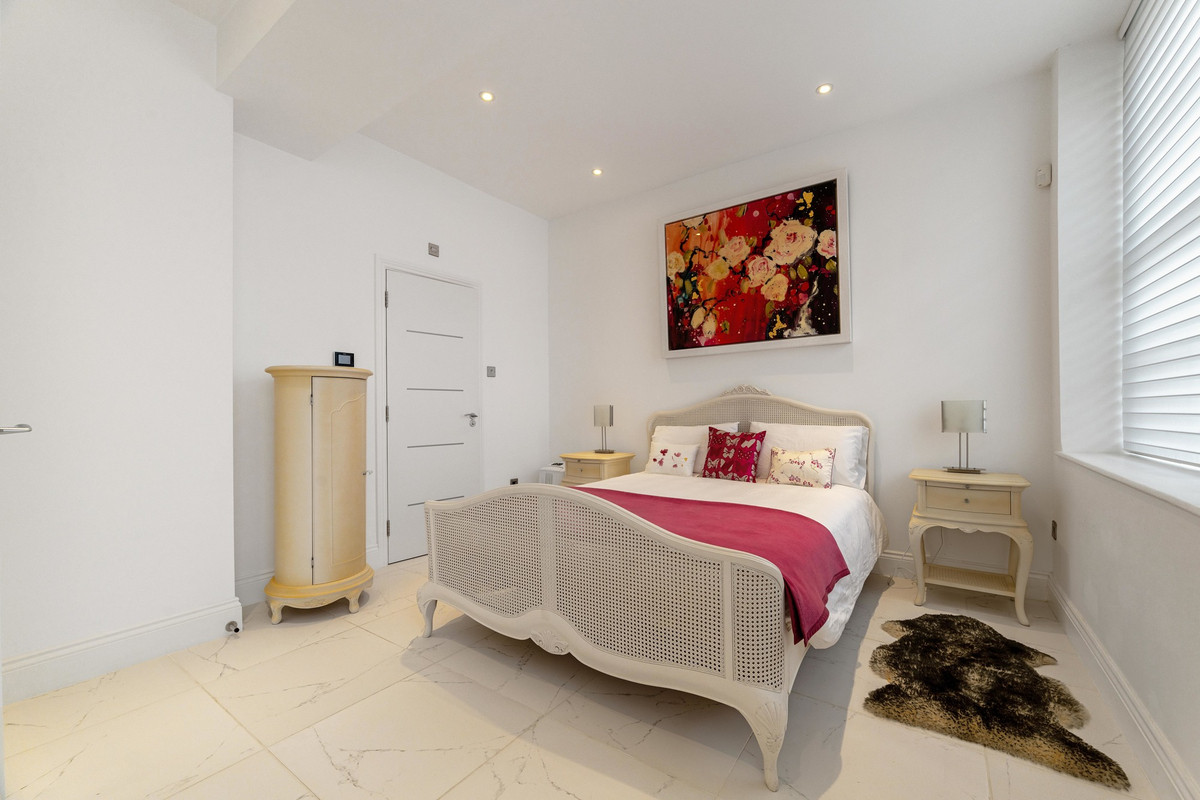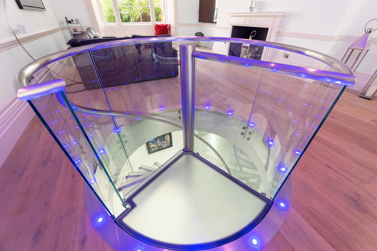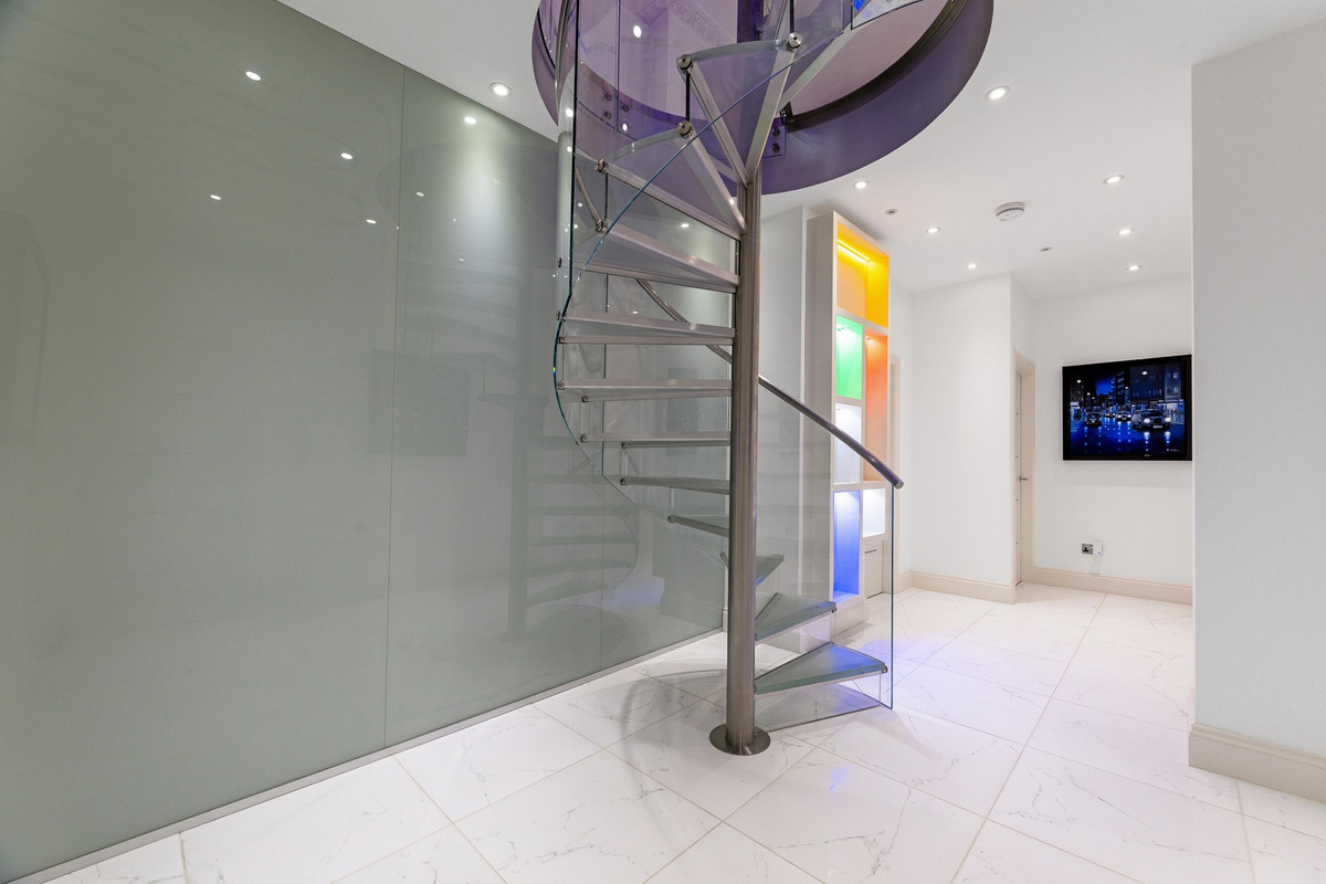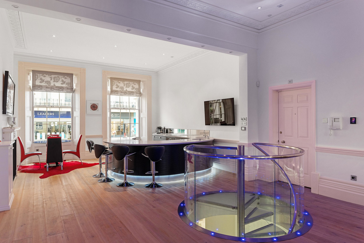 Ground Floor – The stunning open plan kitchen and family room on the ground floor combines modern style with character features perfectly. The large sash windows to both the front and rear of the building, flood the space with light. The orate cornicing and dado rail are in character with the building and blend seamlessly with the modern kitchen and glass spiral staircase to the lower floor. The large curved peninsular island with downlights and bar seating is perfect for entertaining and the feature fireplace defines the dining area perfectly. To the rear of the room is the spacious family living area, again with feature fireplace, cornicing and dado rail. The glass spiral staircase with uplighters is a real focus point of the room and maximises the space on both levels.