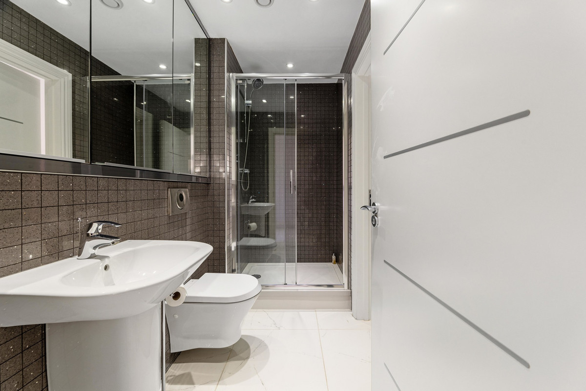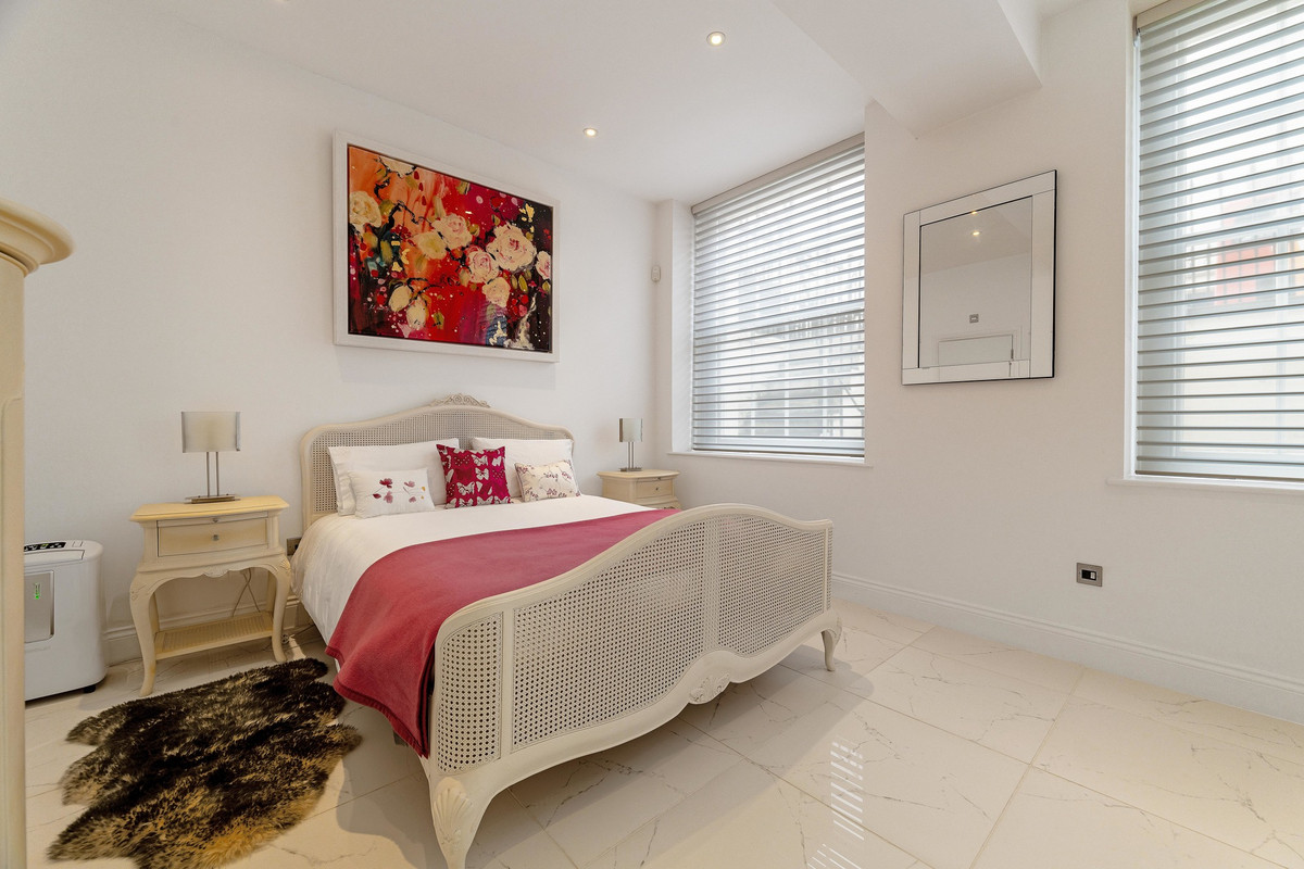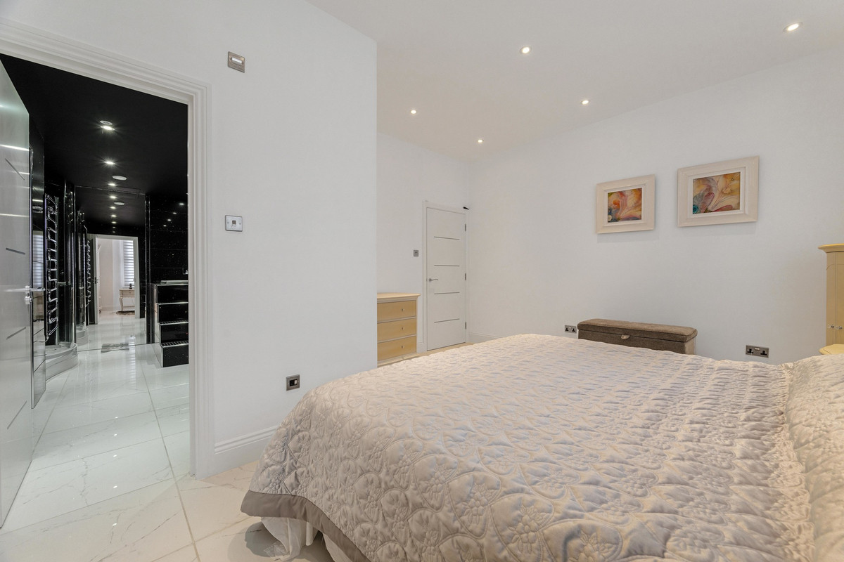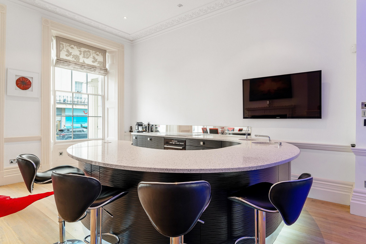 Ground Floor – The stunning open plan kitchen and family room on the ground floor combines modern style with character features perfectly. The large sash windows to both the front and rear of the building, flood the space with light. The orate cornicing and dado rail are in character with the building and blend seamlessly with the modern kitchen and glass spiral staircase to the lower floor. The large curved peninsular island with downlights and bar seating is perfect for entertaining and the feature fireplace defines the dining area perfectly. To the rear of the room is the spacious family living area, again with feature fireplace, cornicing and dado rail. The glass spiral staircase with uplighters is a real focus point of the room and maximises the space on both levels.
