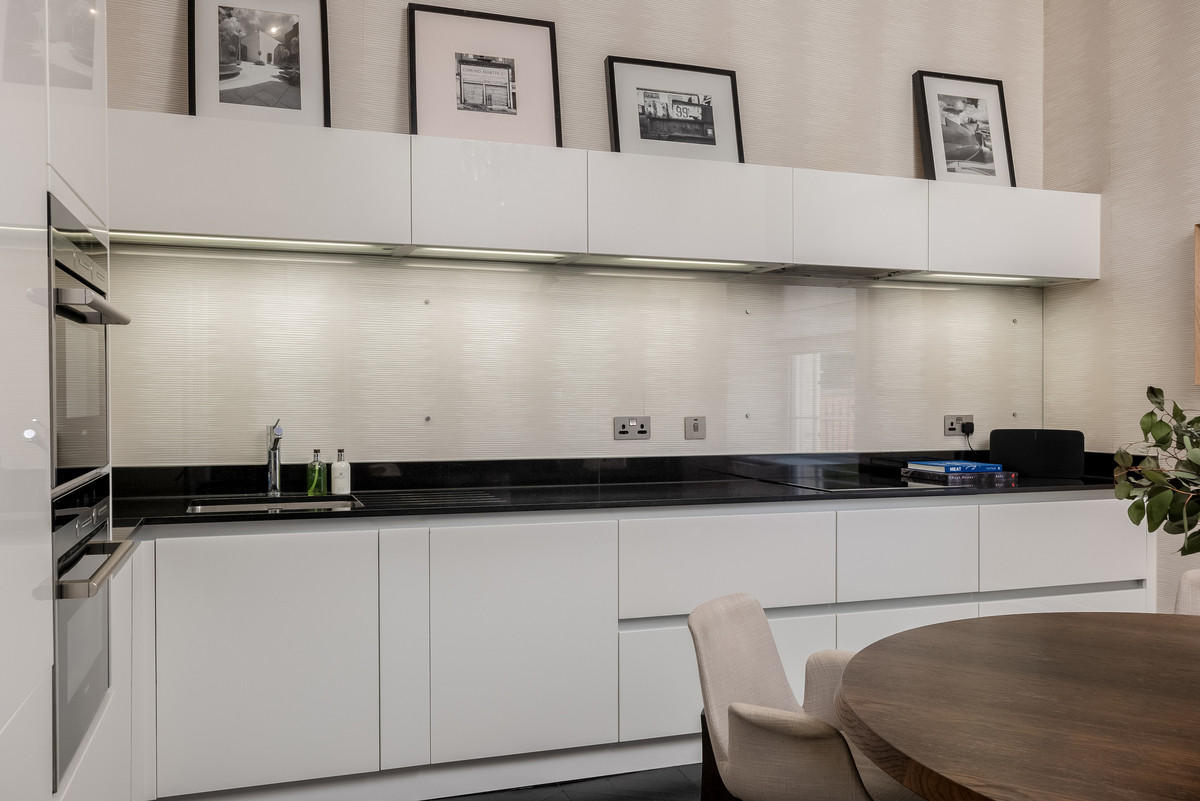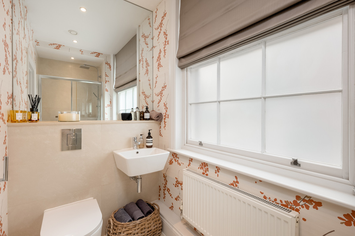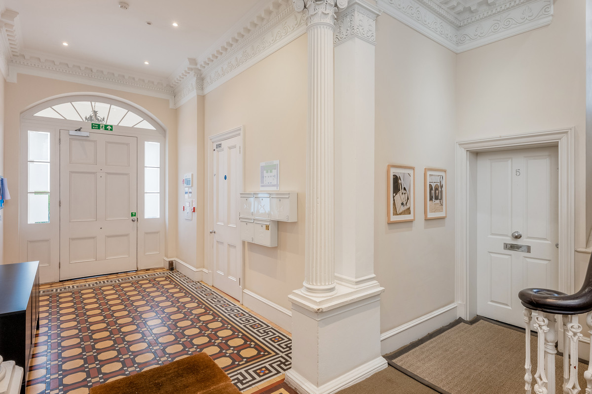 The light and spacious hallway gives a glimpse of the quality of finishings, and space offered in this beautifully presented apartment. A large sash window to the right of the hallway floods the area with natural light and provides a recessed area perfect for a study nook.