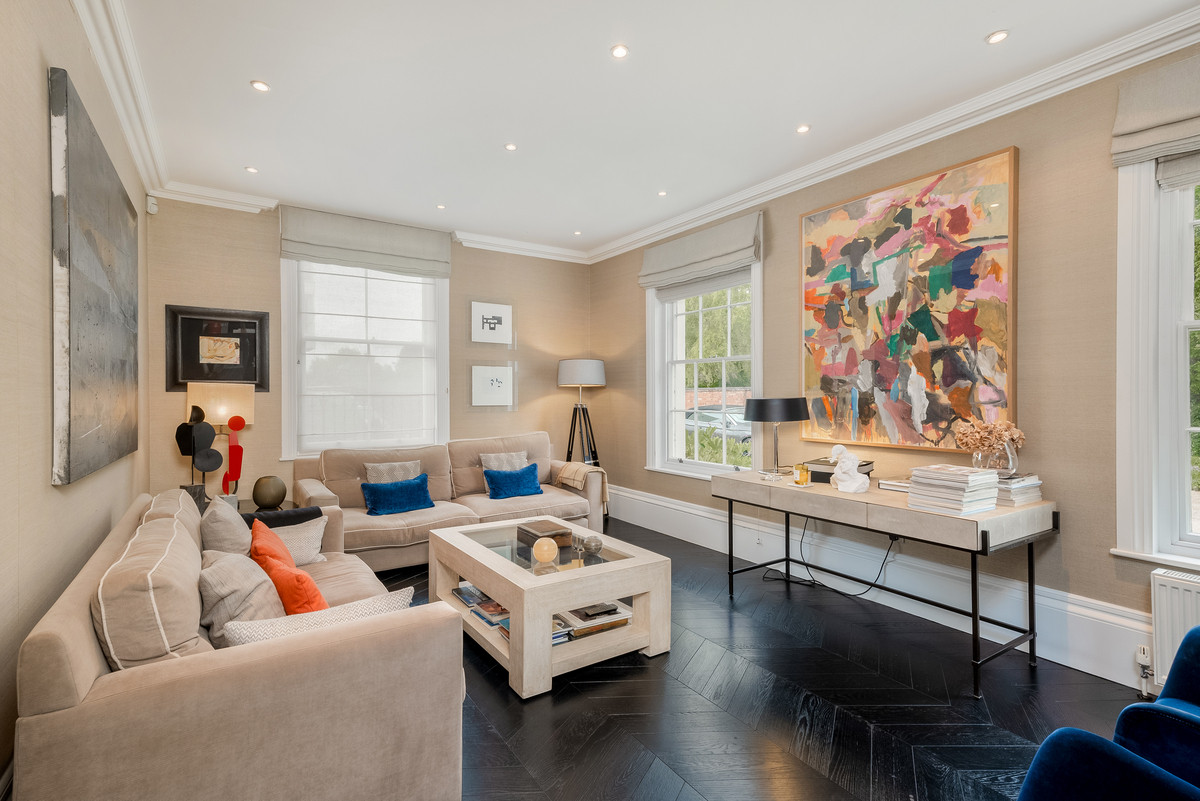 To the rear of the ground floor is the spacious sitting room, with dual aspect windows overlooking the beautiful communal gardens and a bespoke, Italian artisan, handmade, wall to wall entertainment and shelving unit.